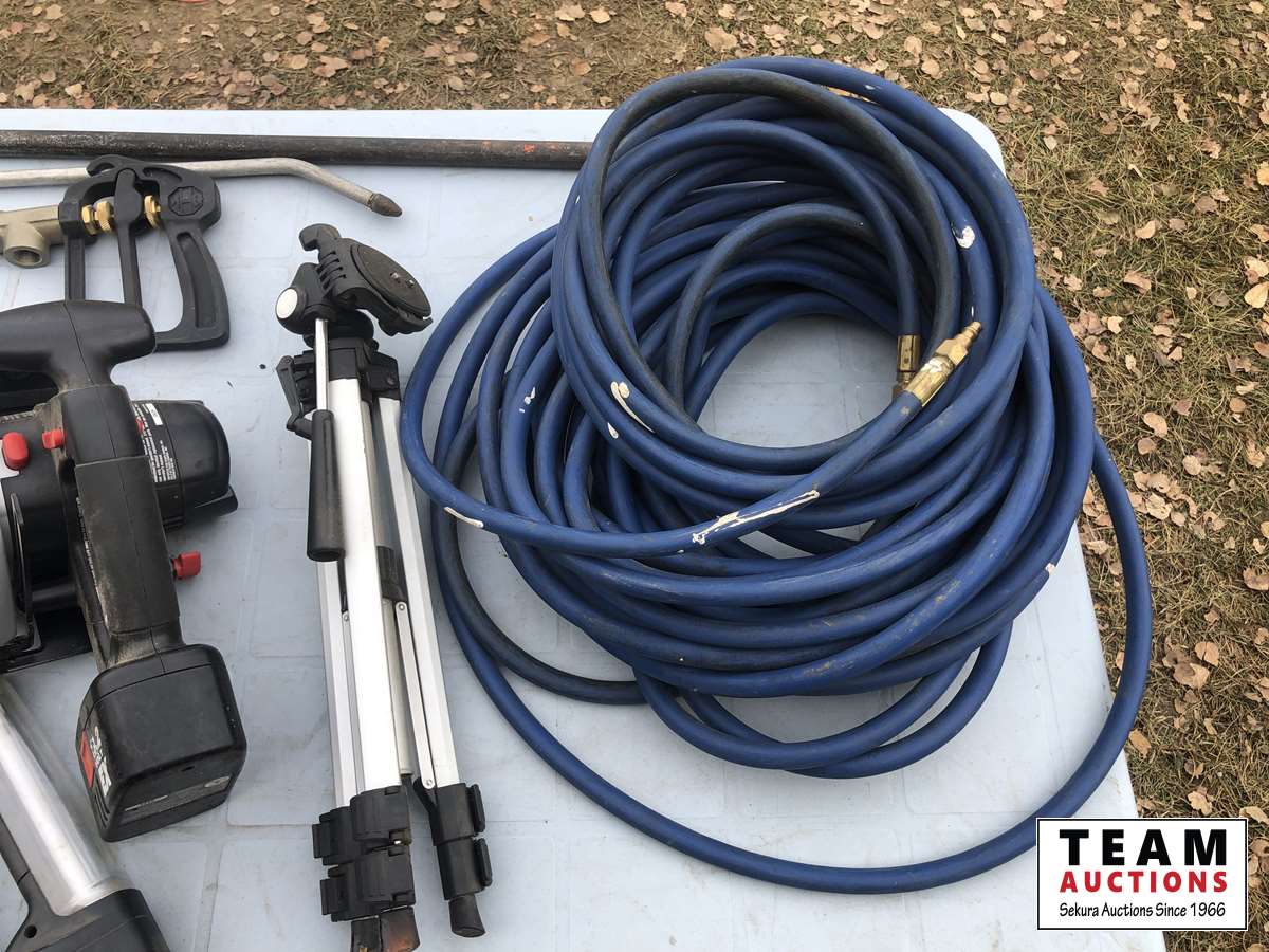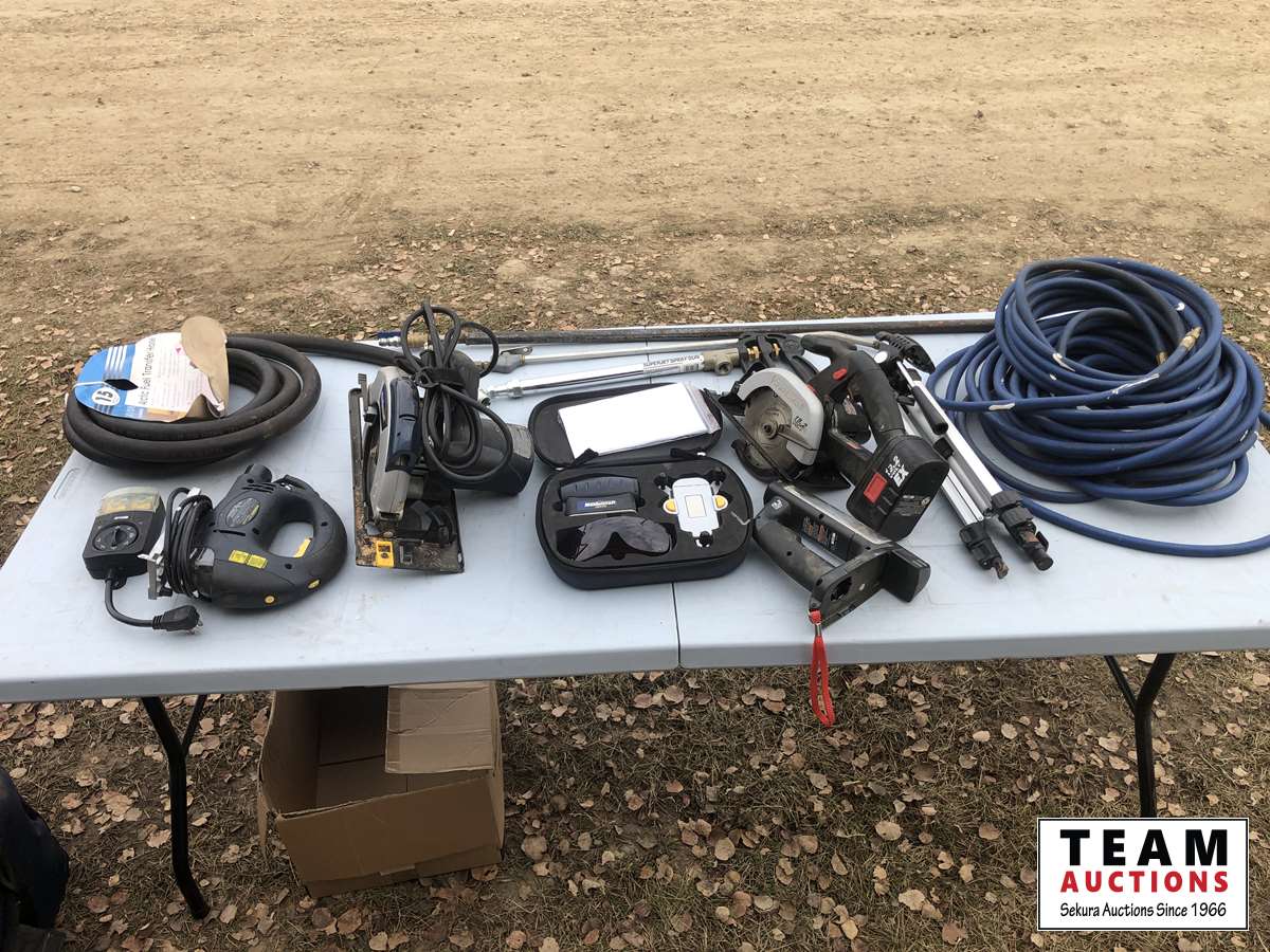 Circular saw with no charger, corded jig saw, corded circular saw, 3/4 inch 15 ft arctic fuel hose, air hose lazer tripod