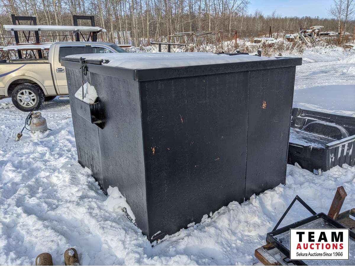 71 inch wide X 87 inch long, 57 inch high, metal hinged lid