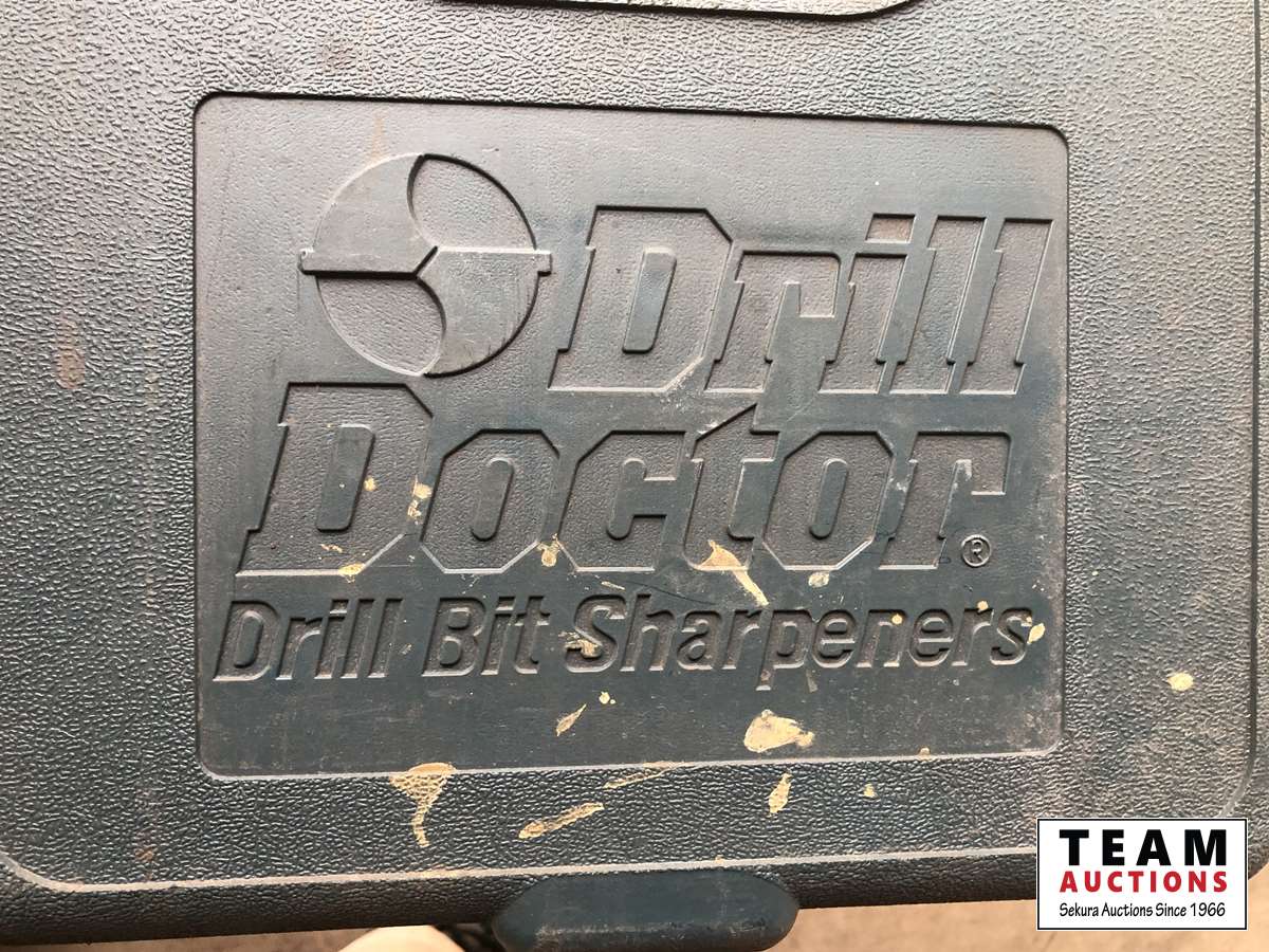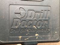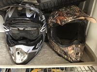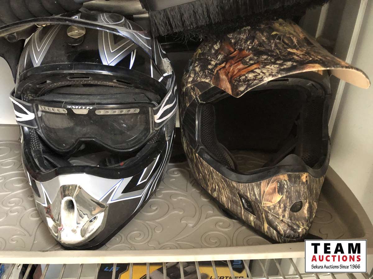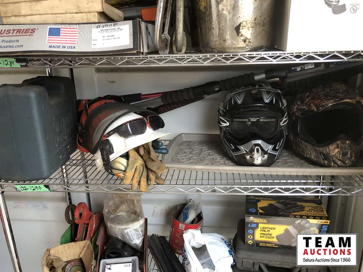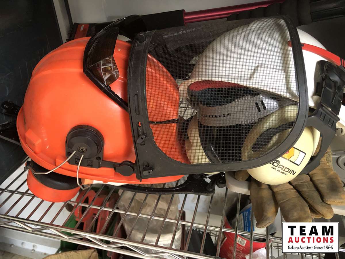 Drill bit sharpener, (2) chain saw hard hats, (2) helmets, (3) snow brushes