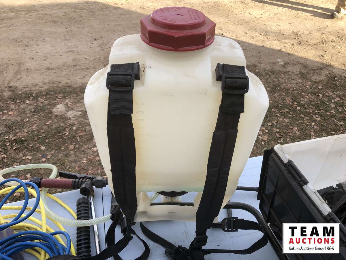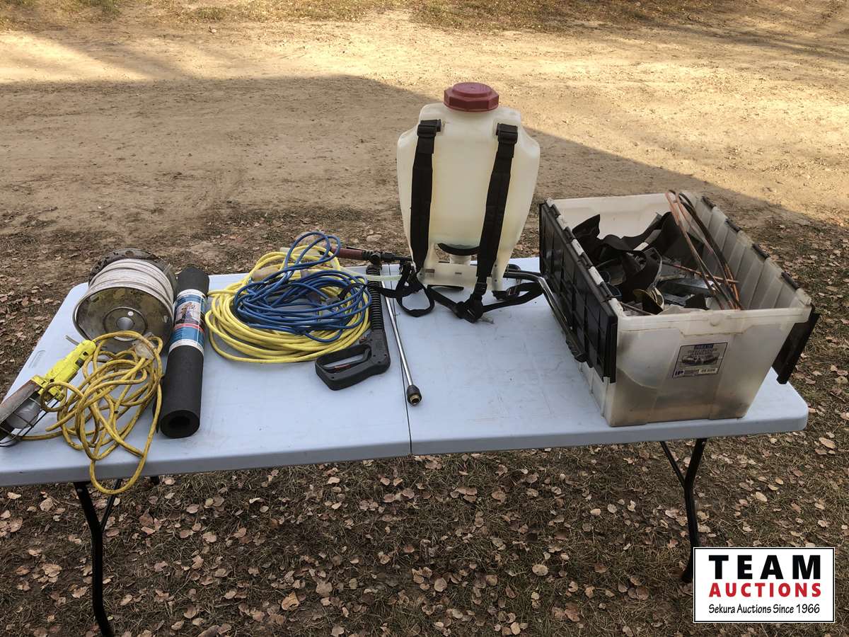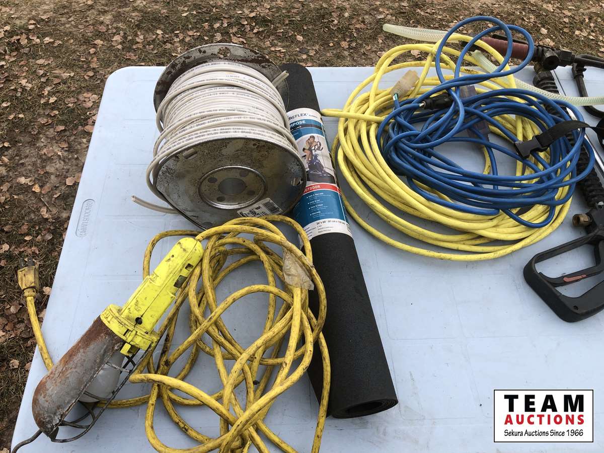 Extension cord, pressure washer nozzle, work lamp, roll of wire, 4 gallon back pack sprayer
