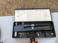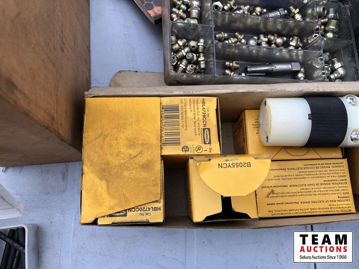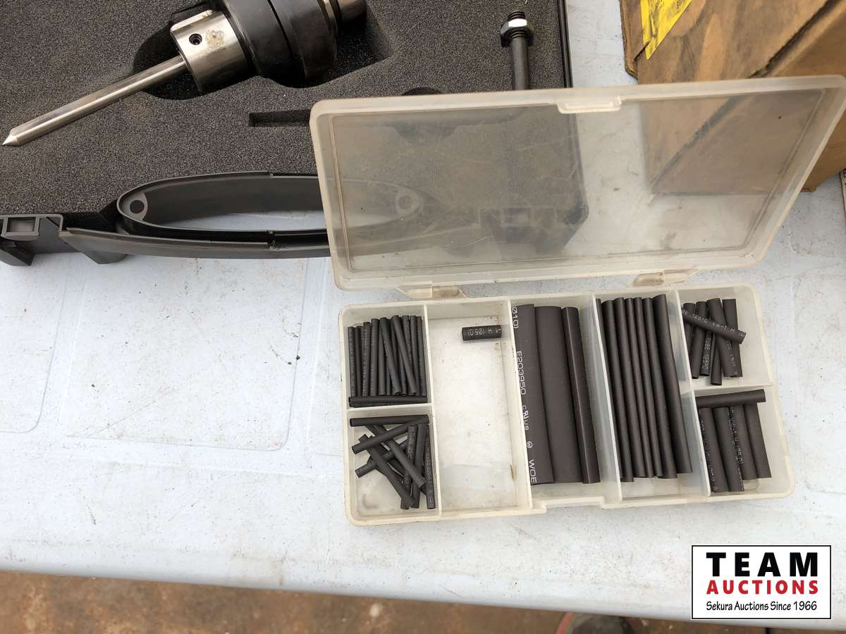 (2) tool kits, box of miscellaneous electrical items, brass fittings, allan bolt kit, grease zerk kit, wire crimper, insert nuts, roll of wire, shrink tube kit, cable connector