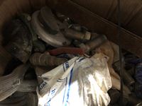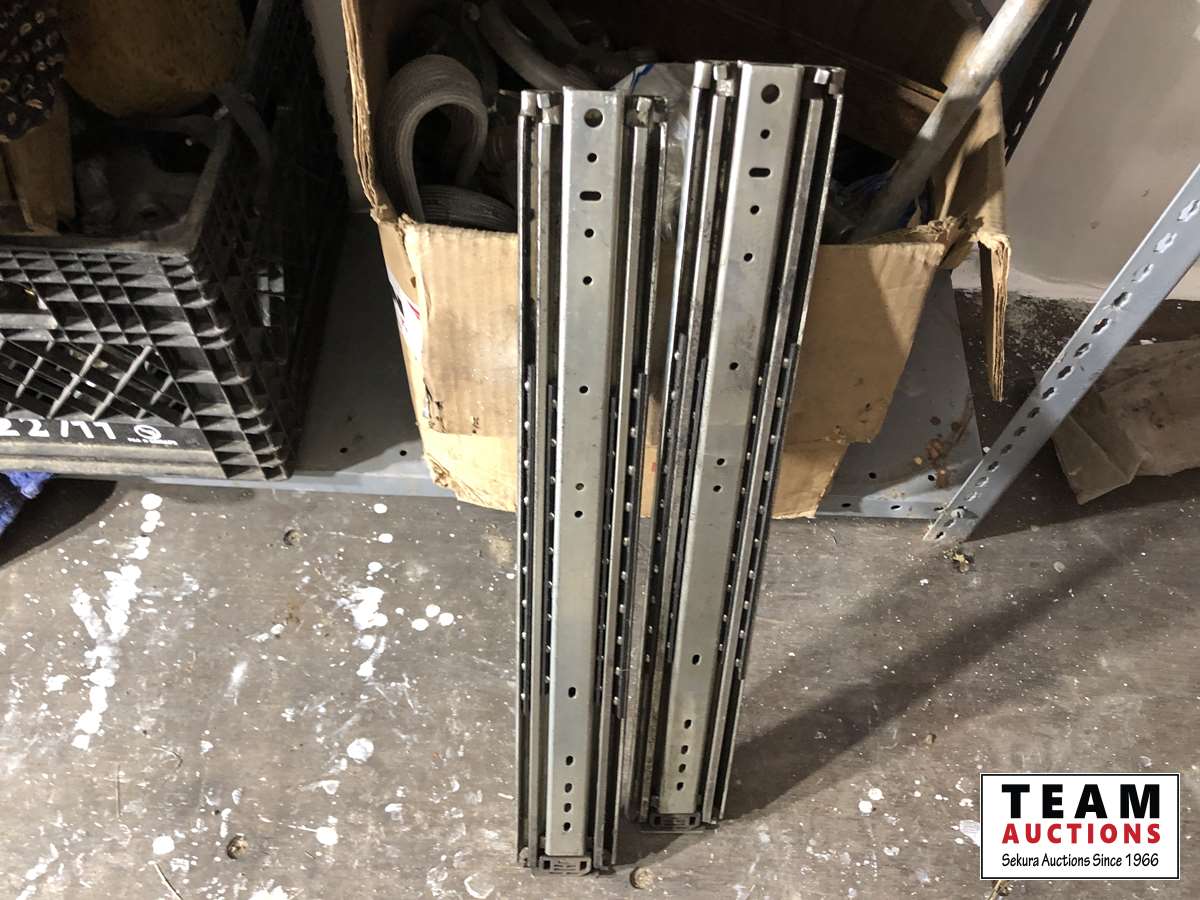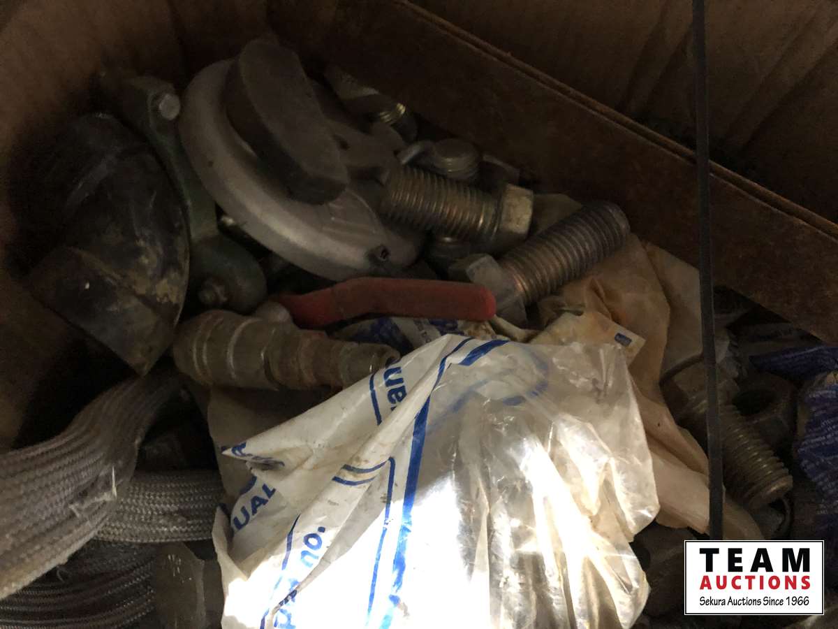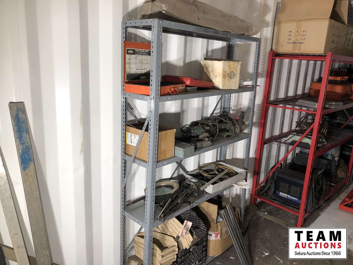 Shelf unit, roll of fire blanket material, tap & die set, set of Philips machine screws, drill bits, (2) Makita angle grinders, Hitachi angle grinder, air angle grinder, (2) slides for tool box, roll of 3/16 inch cable, storage bins, flood lights, grease zerk kit, miscellaneous items