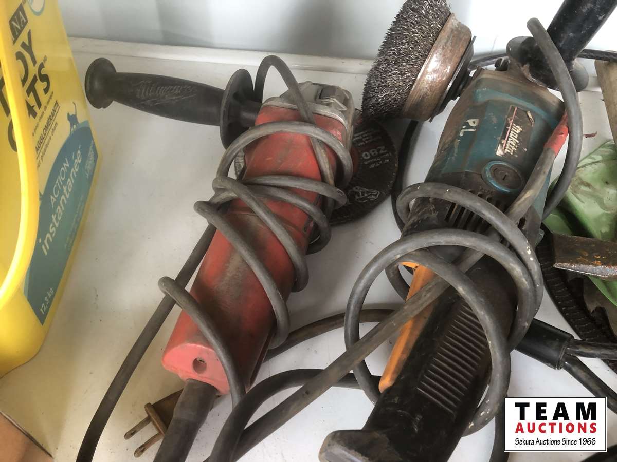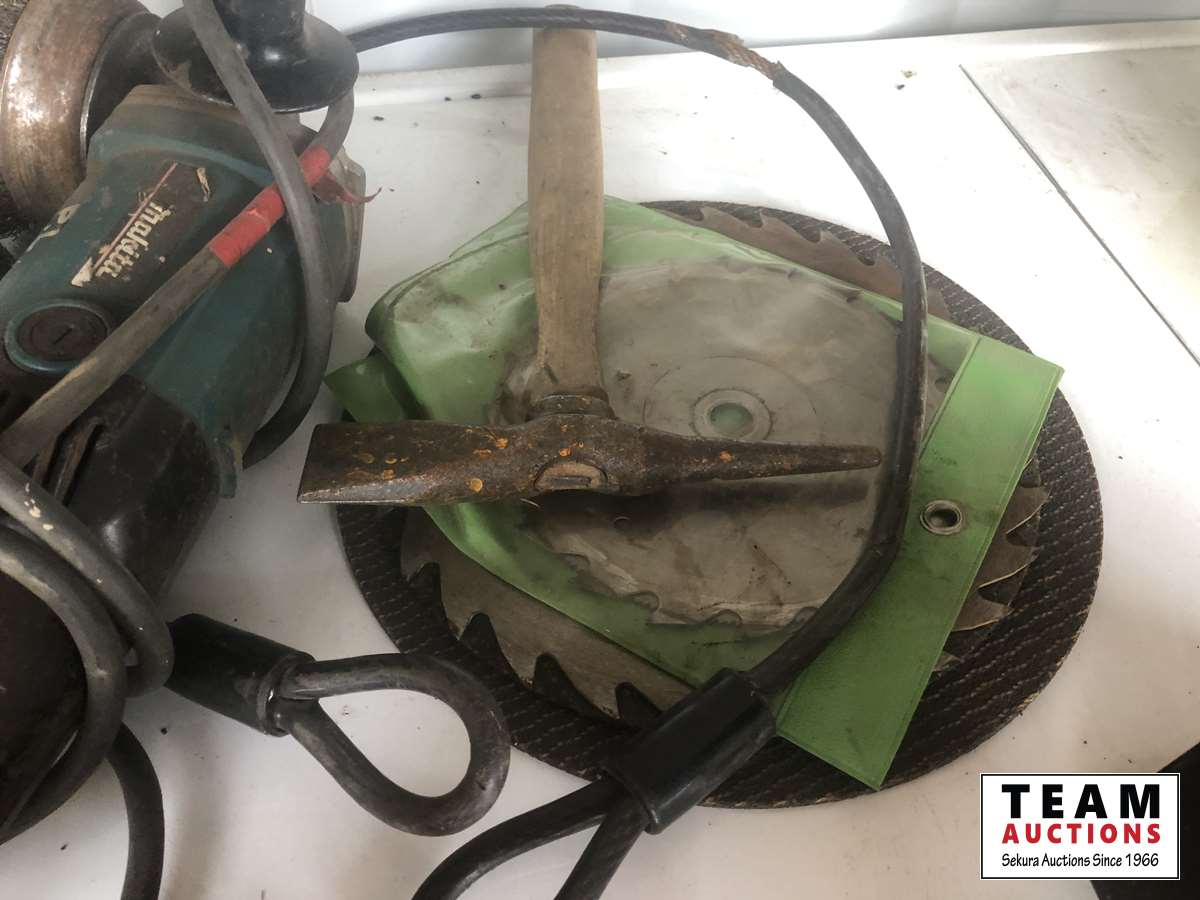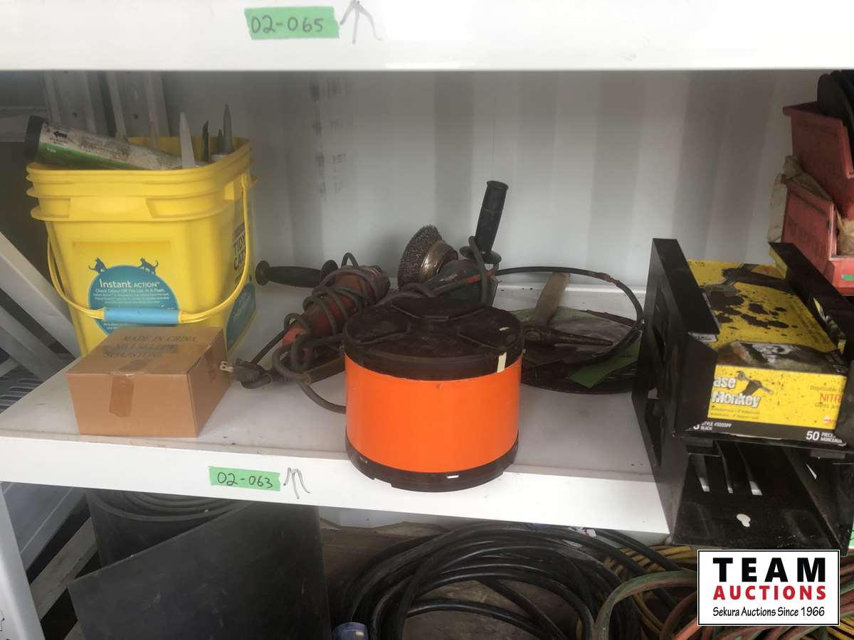 Caulking, roof tar, adhesive, & grinding stones, Makita grinder, saw blades, box of gloves, etc.