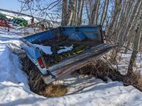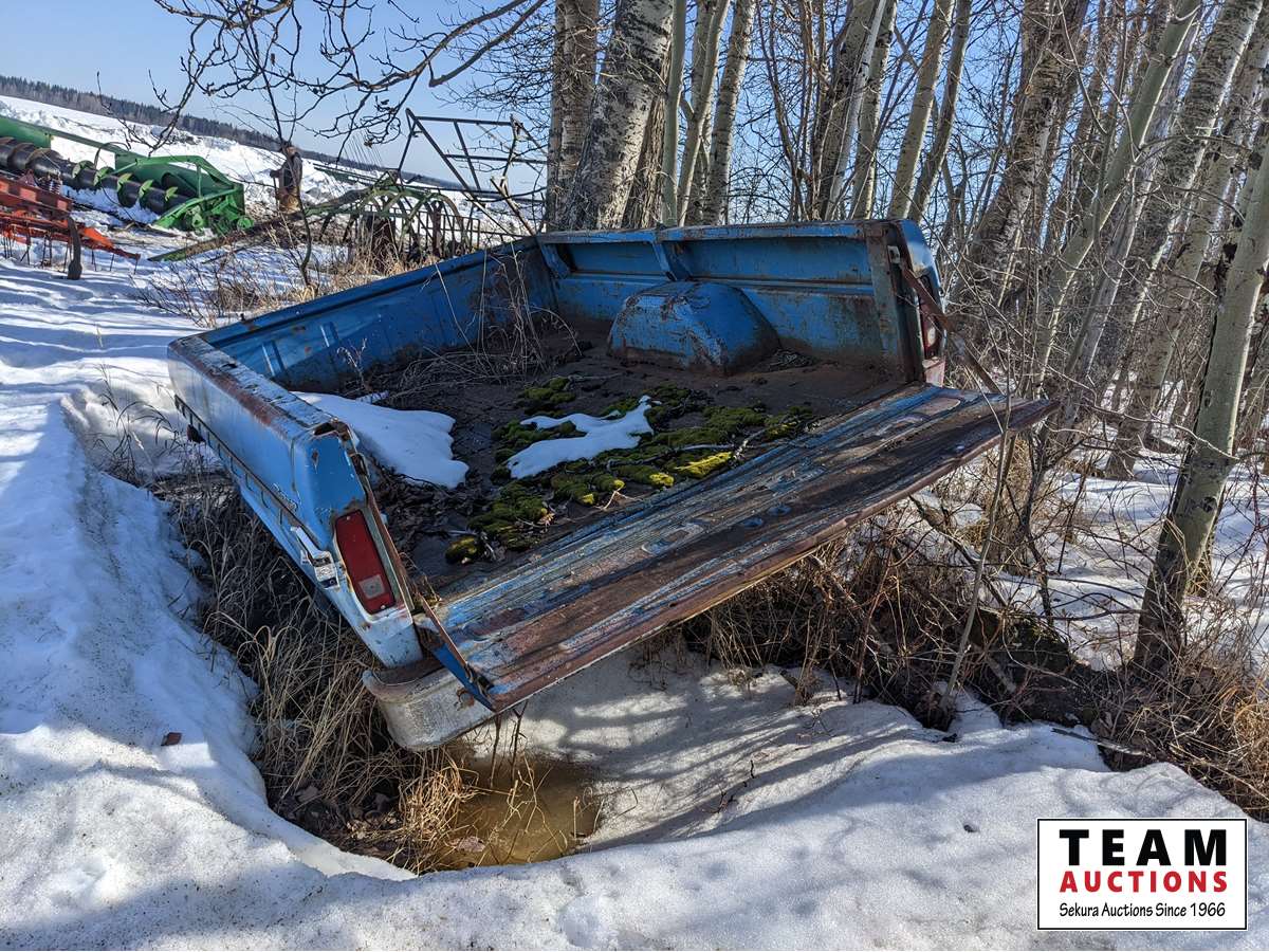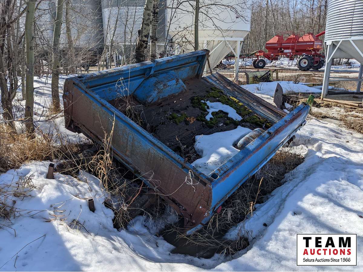 Fuel tank and stand, JD grapple, miscellaneous iron, old truck box trailer