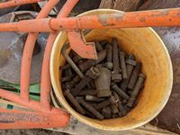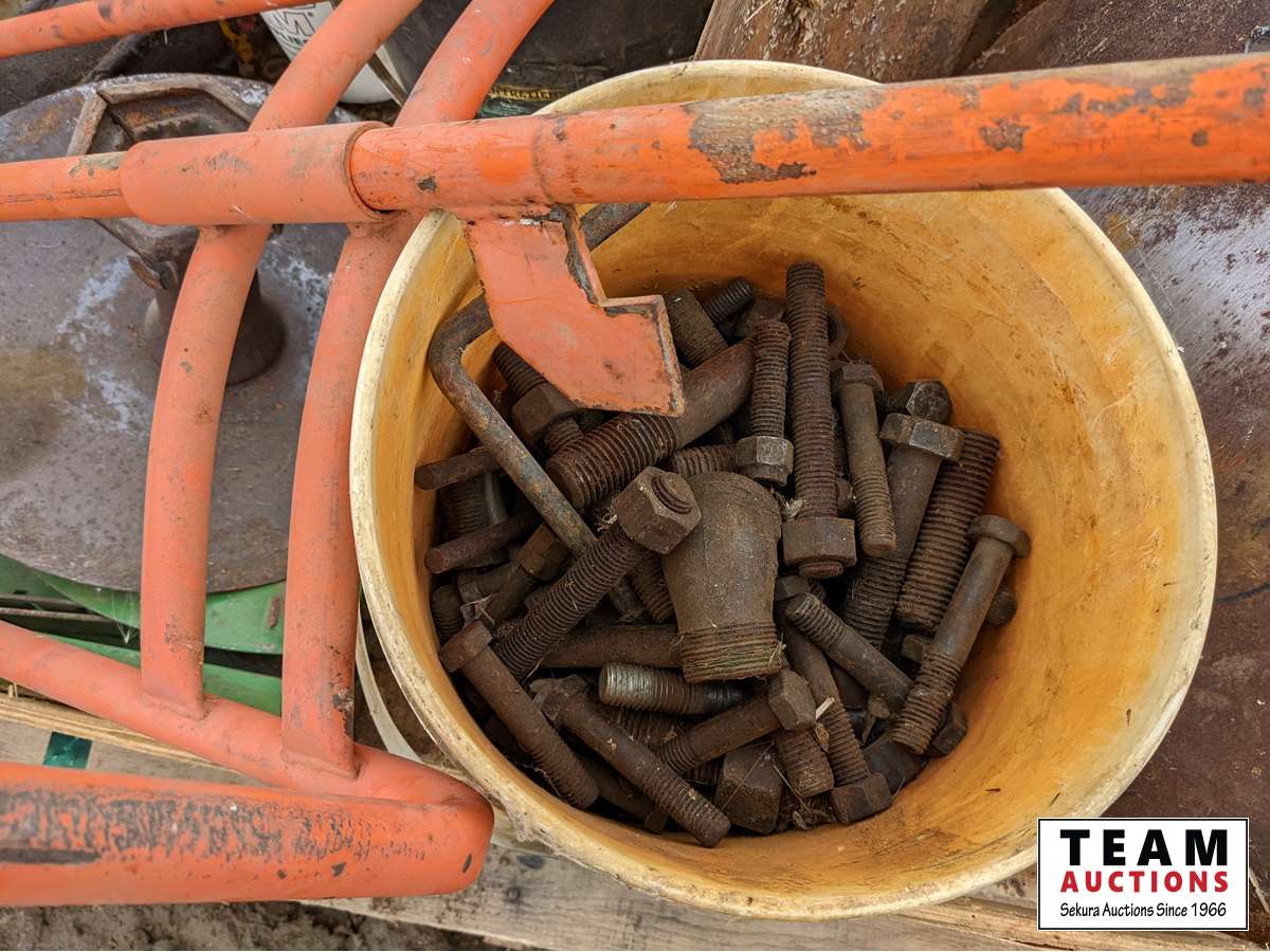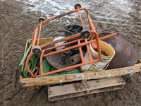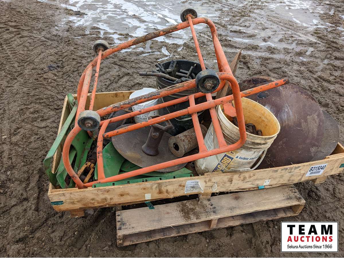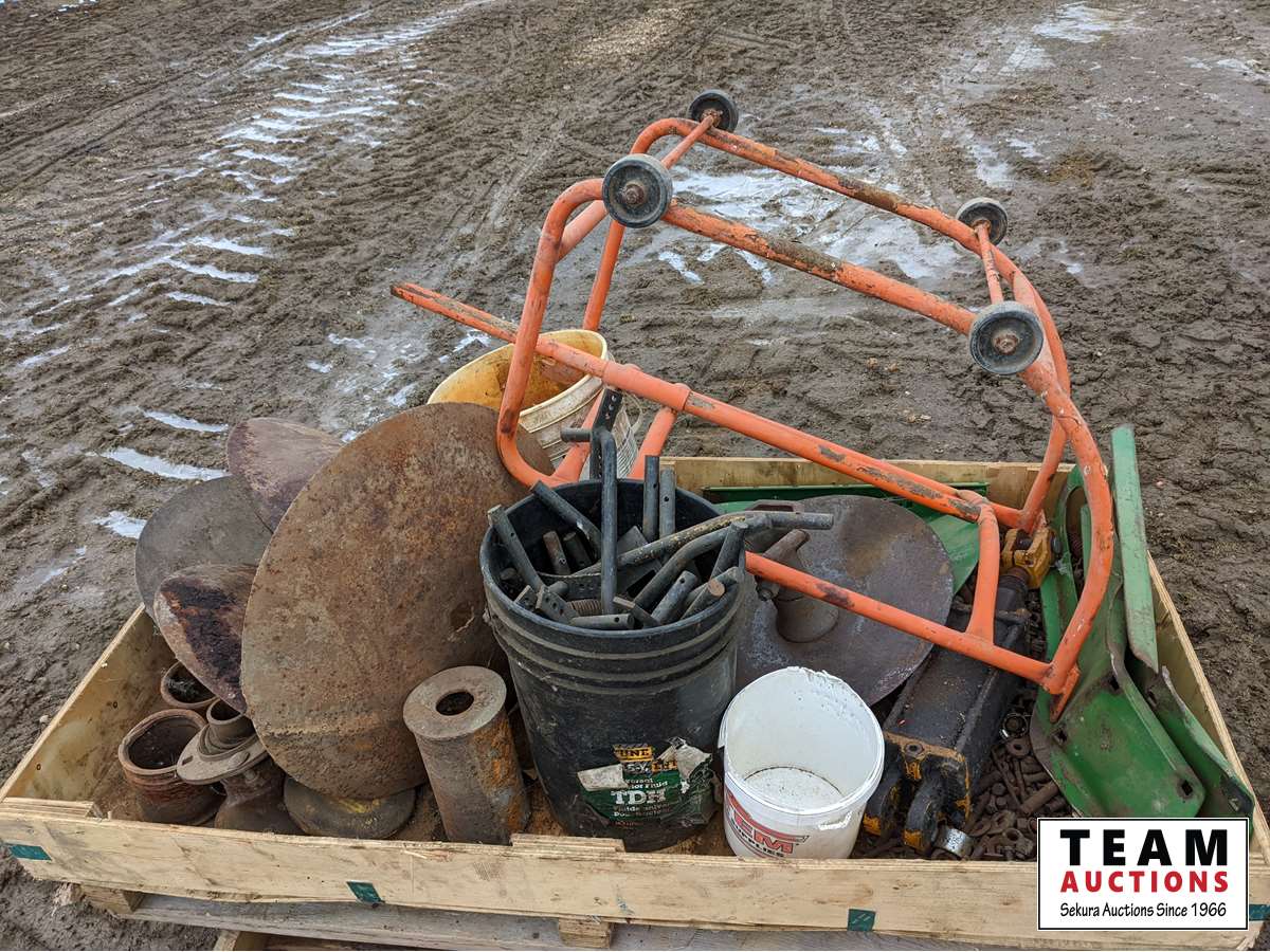 Disc blades, 8 inch hydraulic cylinder, barrel dolly, bolts, scraper mounting rod, miscellaneous items