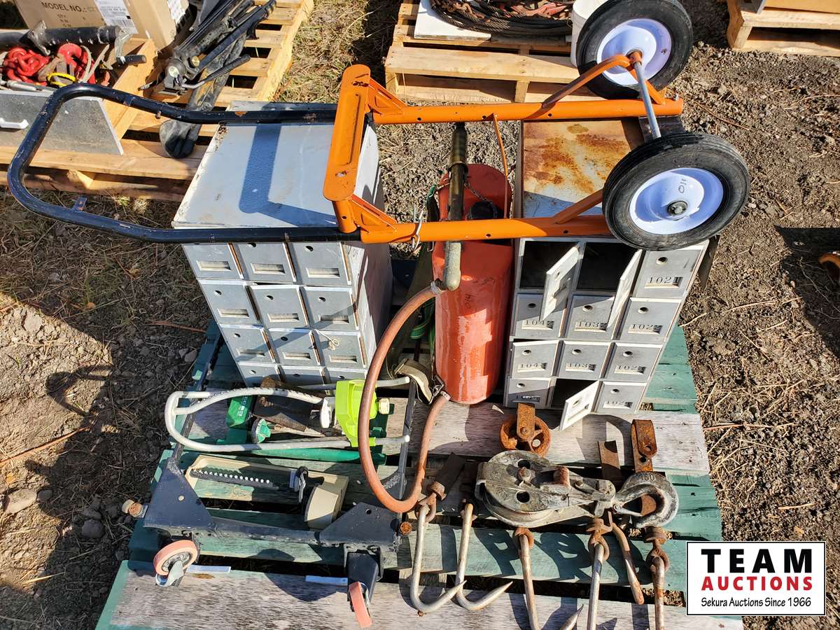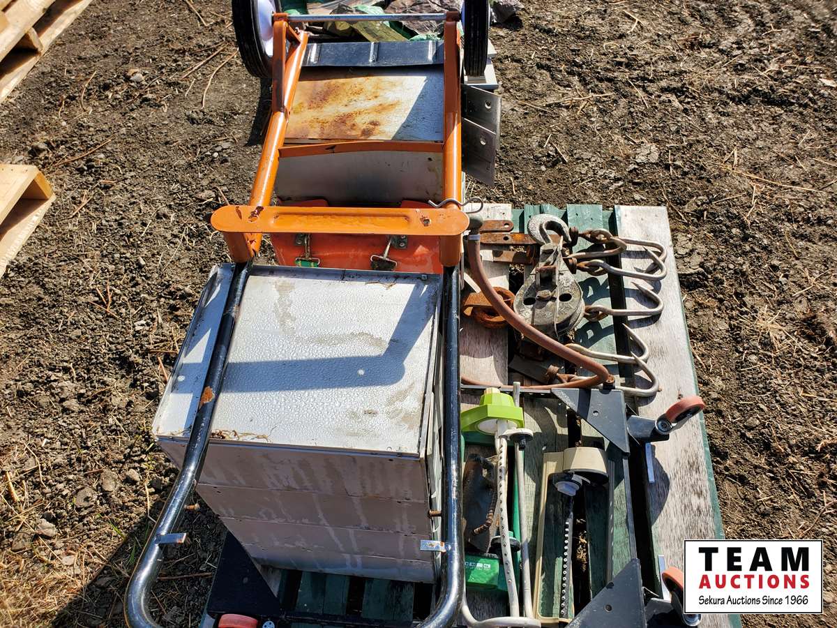 Dolly, mailboxes, pulleys, meat hooks, table saw frame