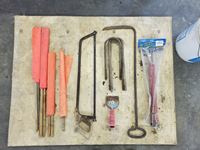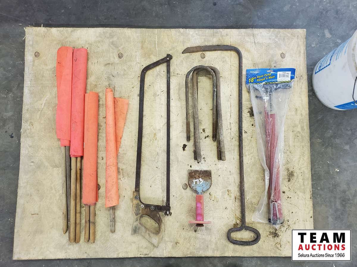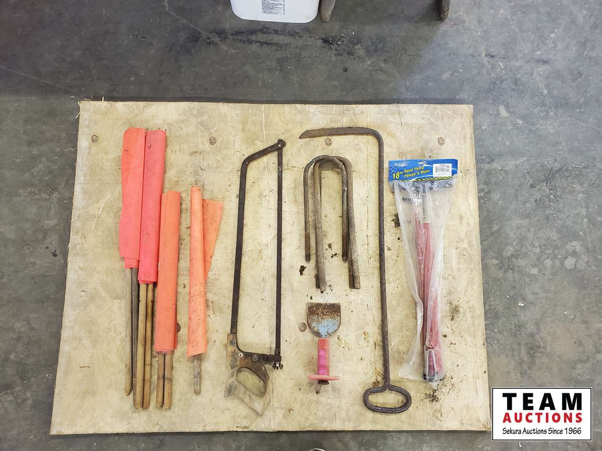 Tire pump, road flags, meat saw