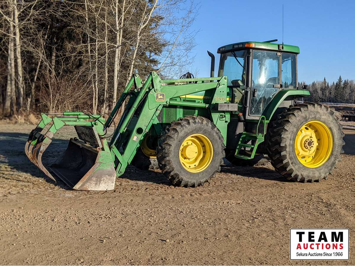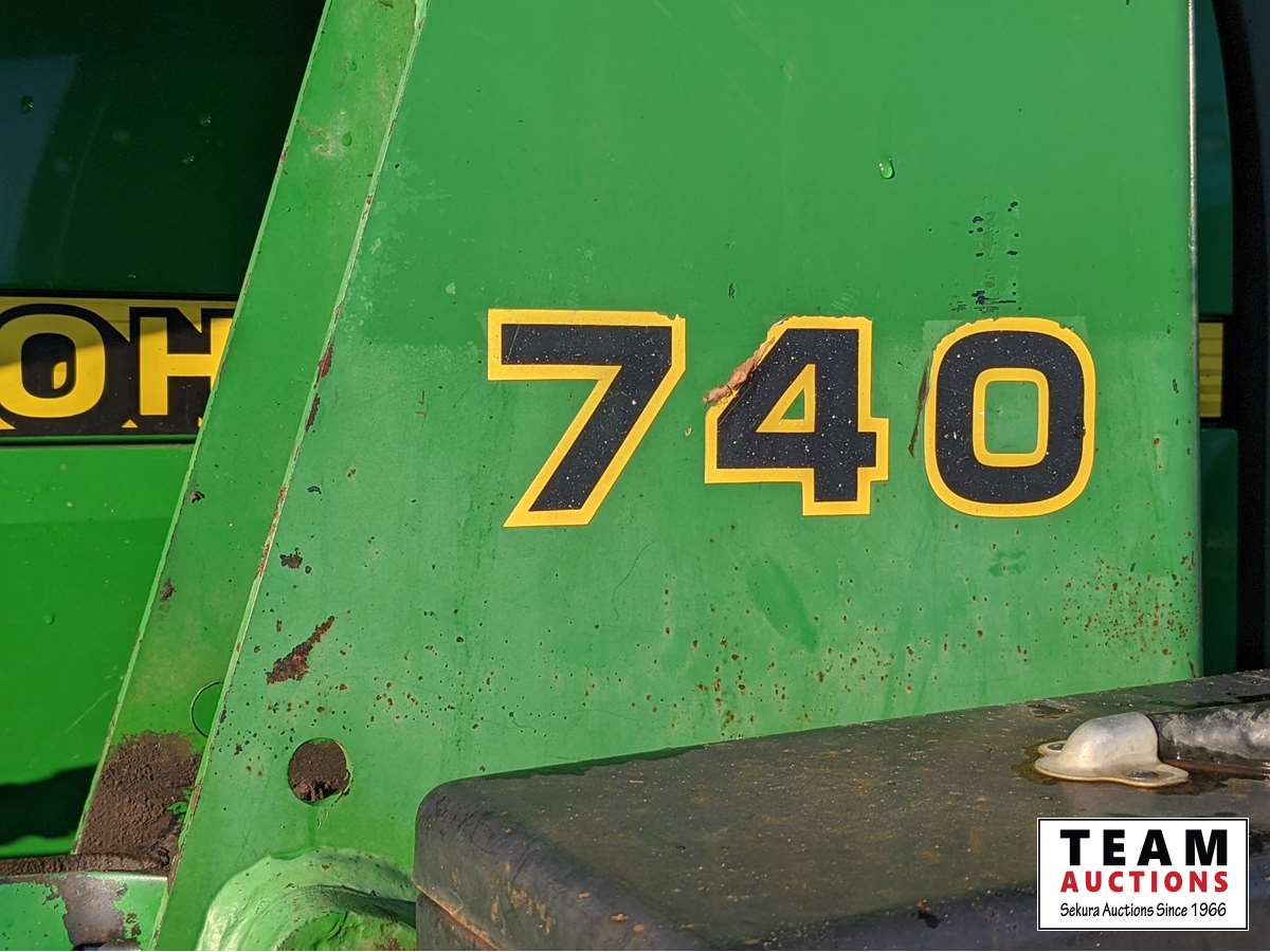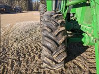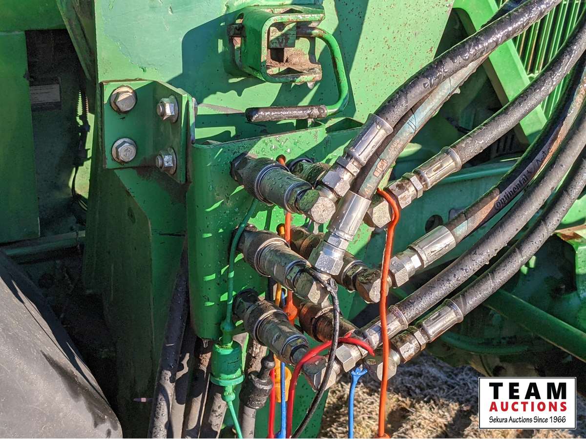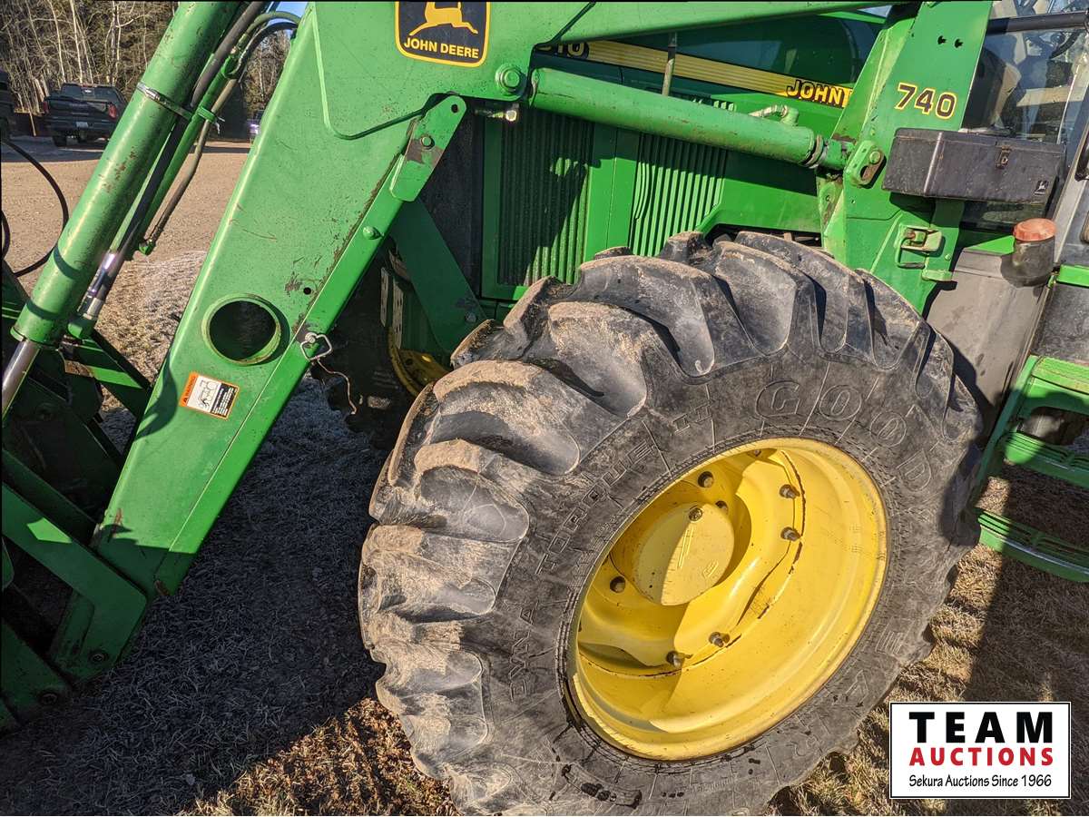 John Deere 740 loader, Q/A 8 ft bucket, grapple, joystick, 16 speed PowrQuad transmission, 3 hydraulic outlets, 540/1000 PTO, engine heater, 16.9-28 front & 520/85R38 rear tires