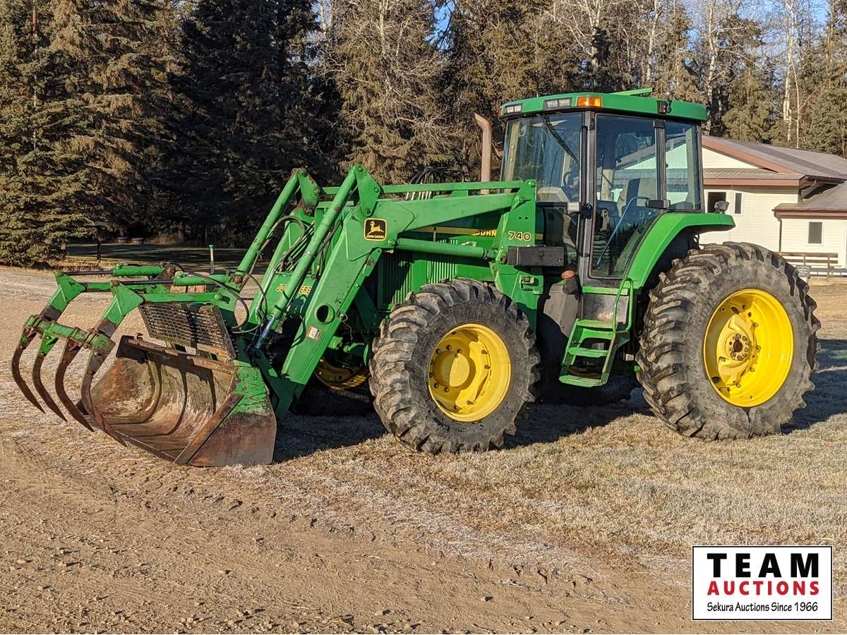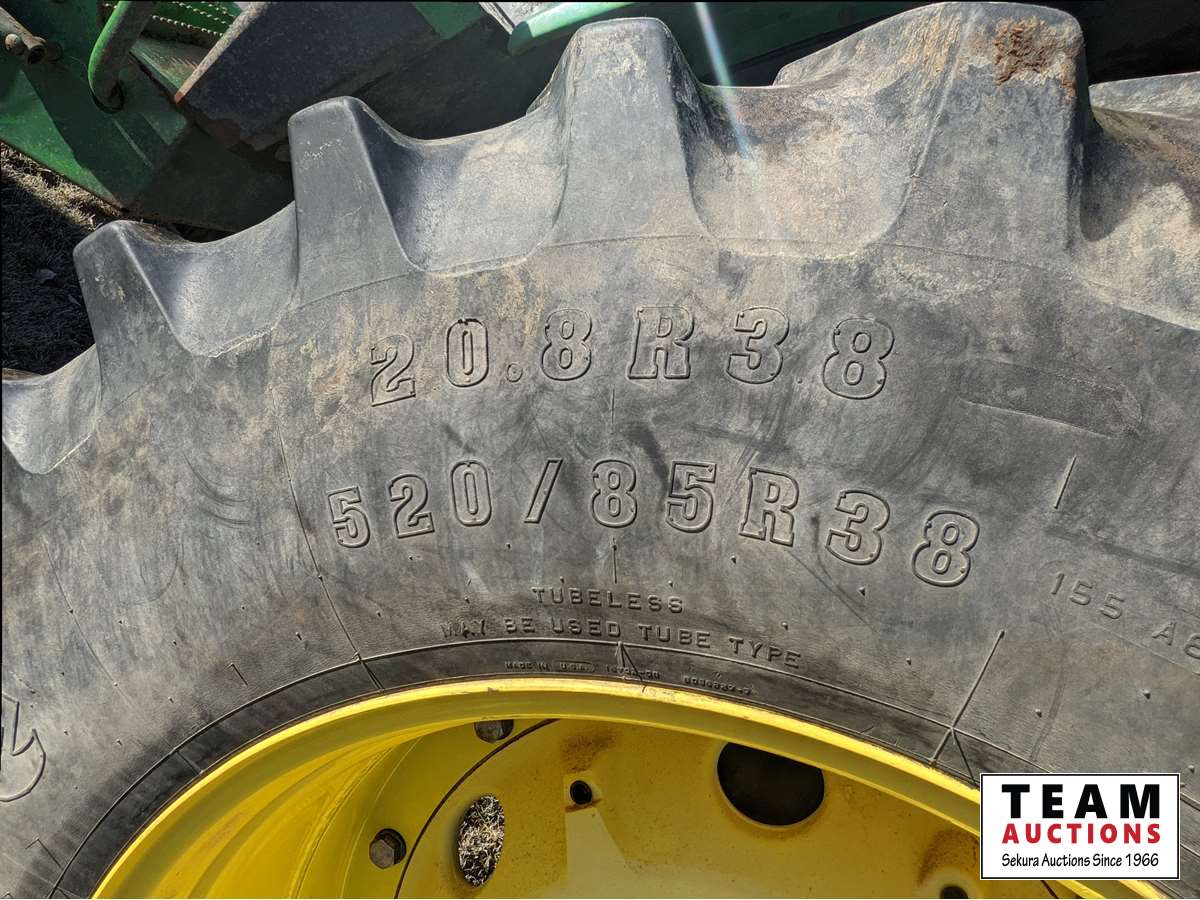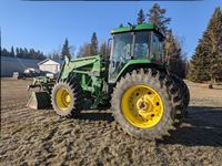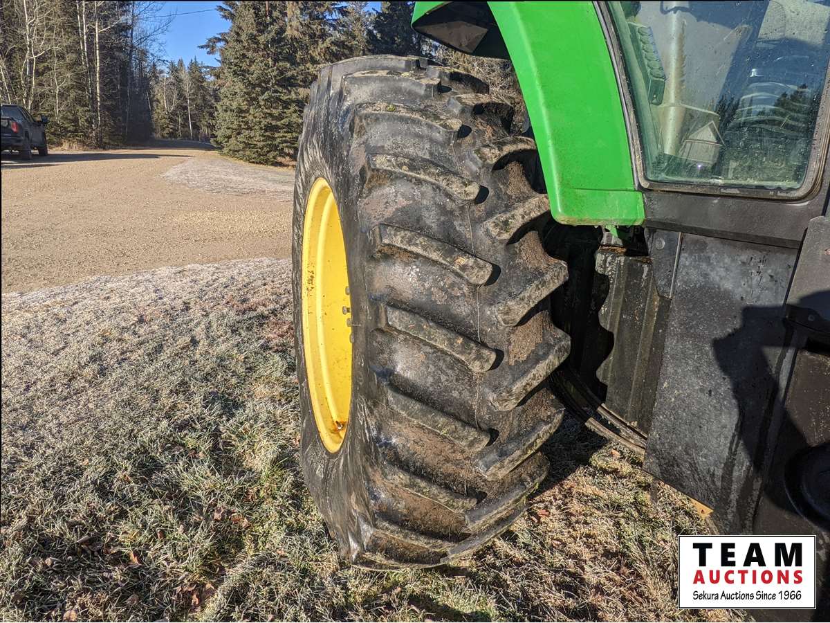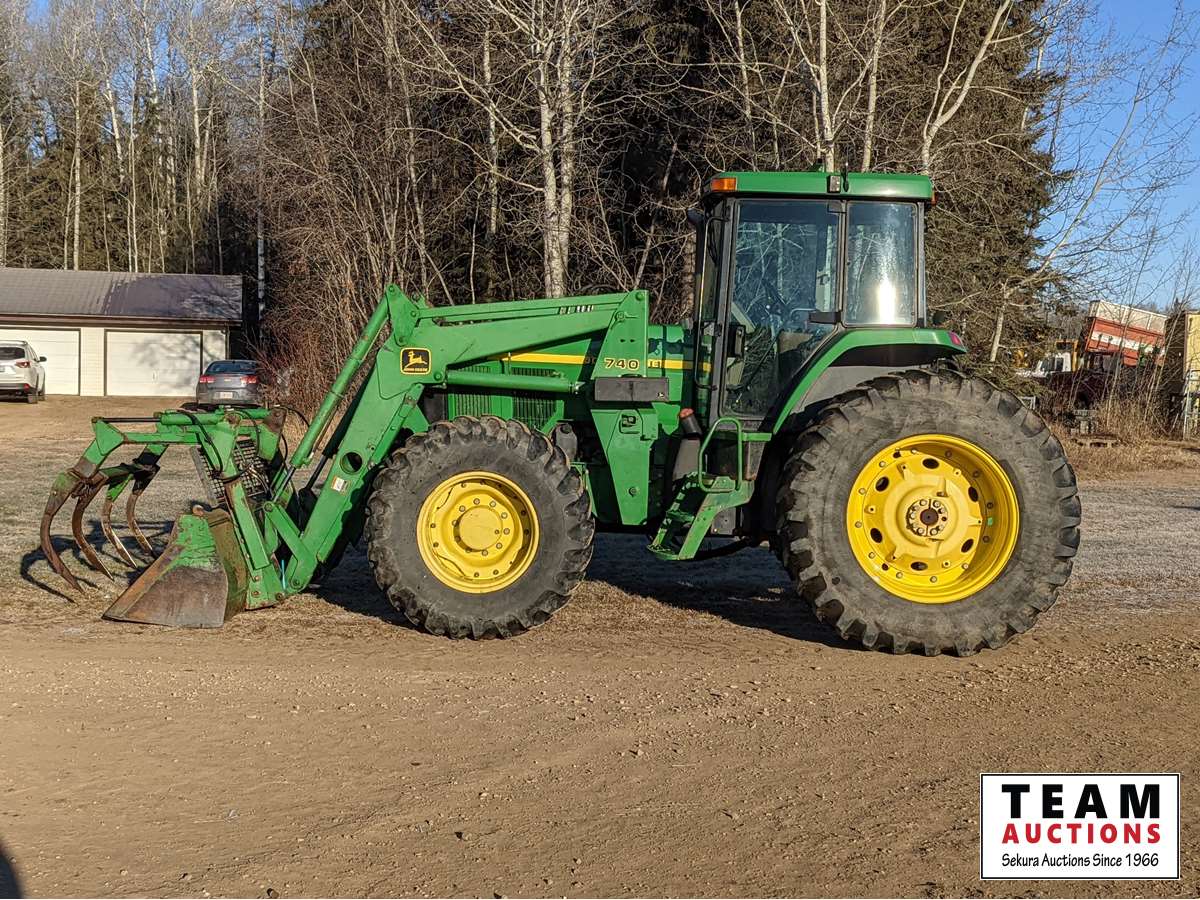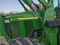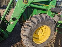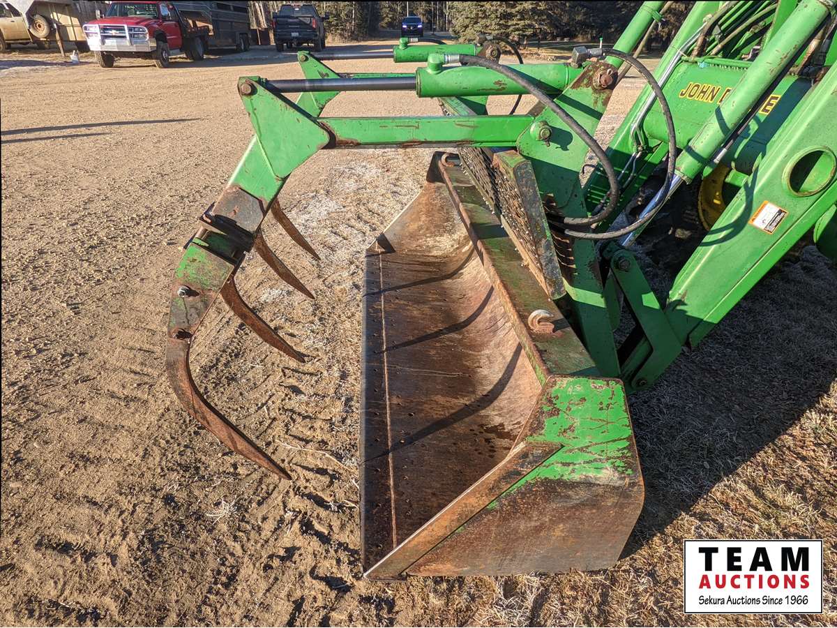 John Deere 740 loader, Q/A 8 ft bucket, grapple, joystick, 16 speed PowrQuad transmission, 3 hydraulic outlets, 540/1000 PTO, engine heater, 16.9-28 front & 520/85R38 rear tires