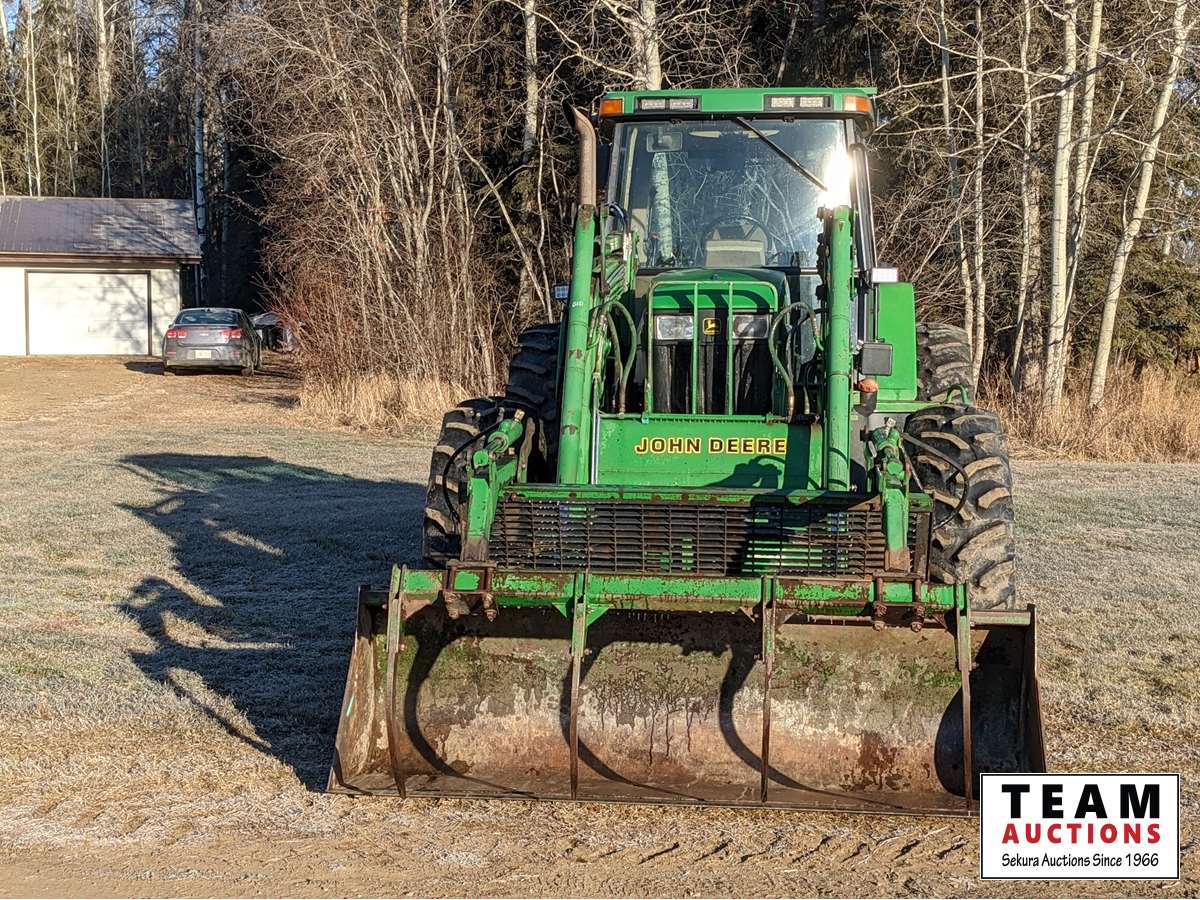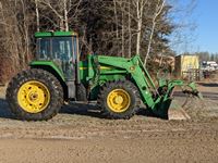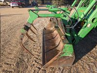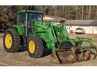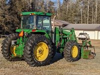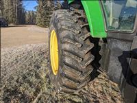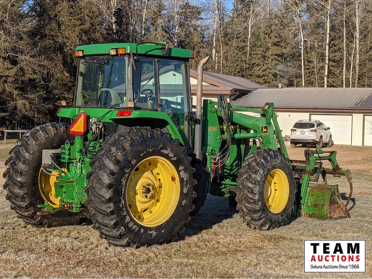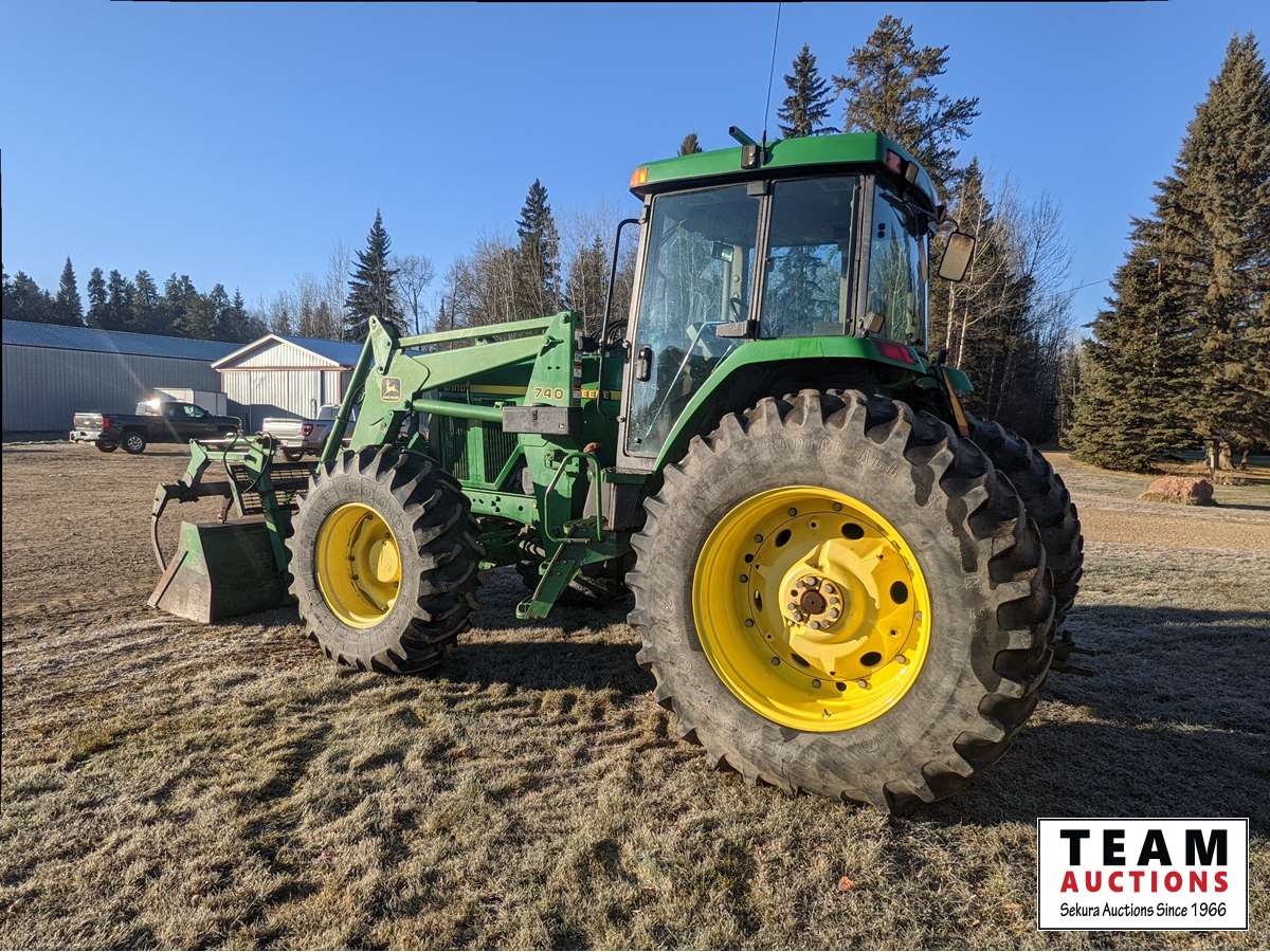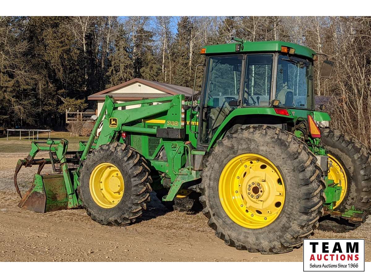 John Deere 740 loader, Q/A 8 ft bucket, grapple, joystick, 16 speed PowrQuad transmission, 3 hydraulic outlets, 540/1000 PTO, engine heater, 16.9-28 front & 520/85R38 rear tires