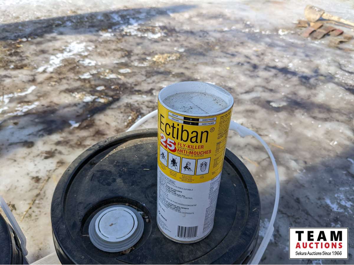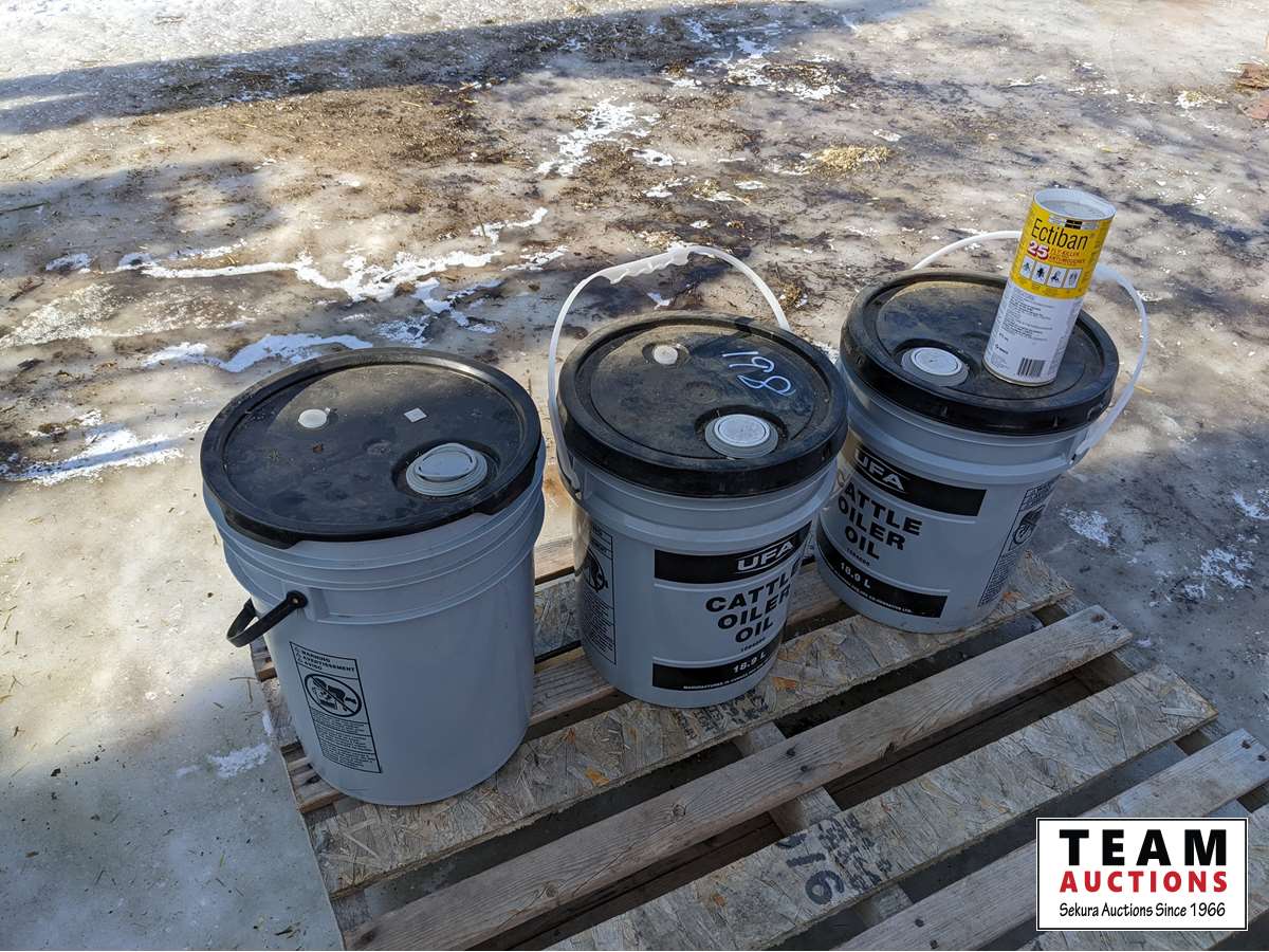 117 (2) Full Pails of Cattle Oiler Oil, Pail with Funnel, (1) Ectiban Fly Killer