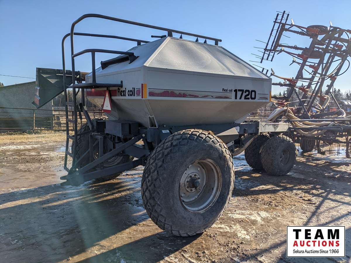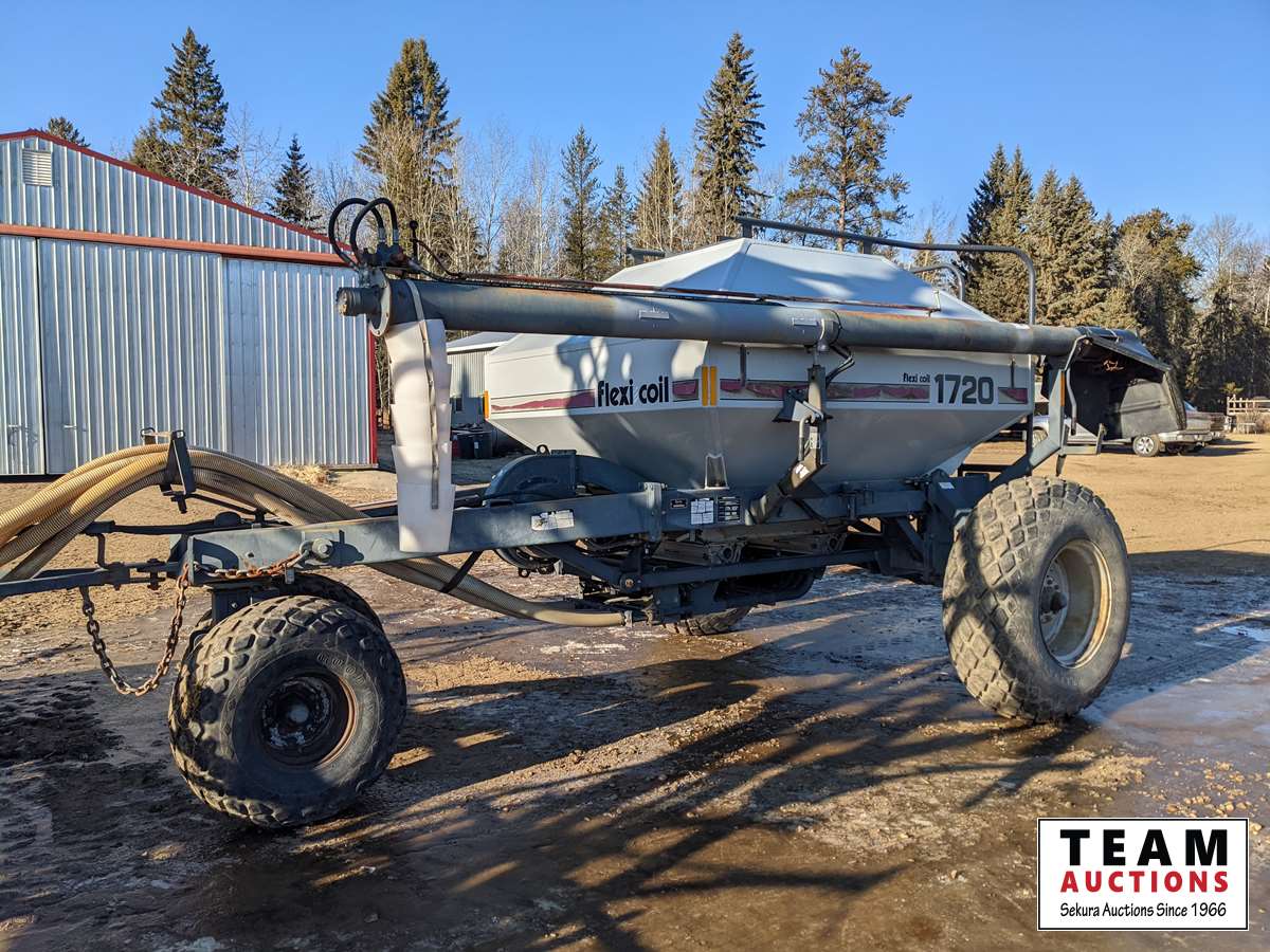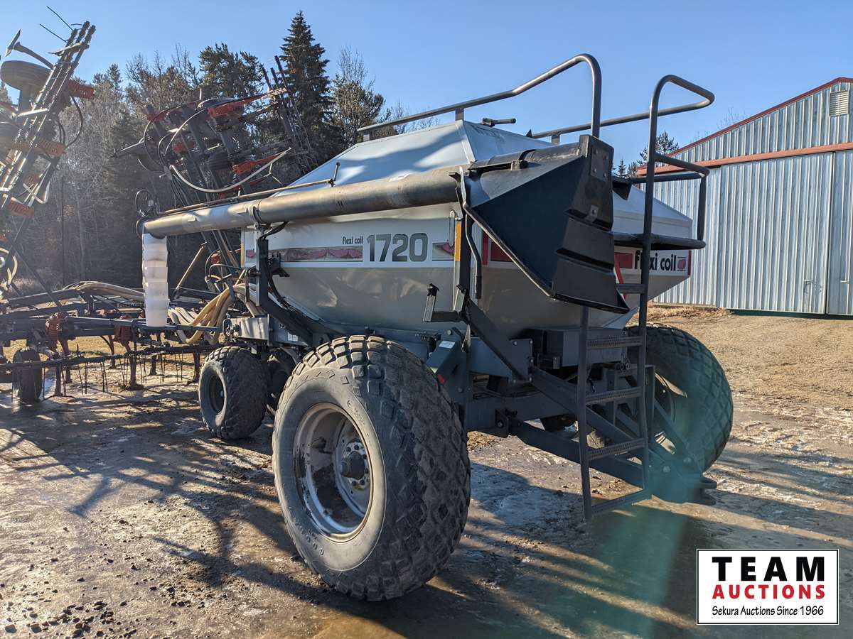 12 inch spacing, sweeps, 3 bar harrows, 9.5 L -15, Flexi-Coil 1720 tow behind grain cart, s/n G1720A0-N049737, 2 compartment, 172 bushel, 16.5 L -16 front & 18.4-26 rear tires