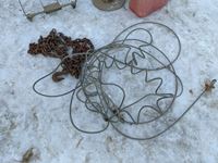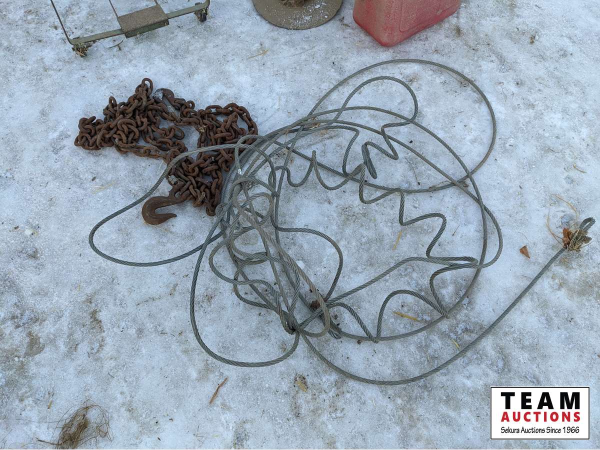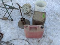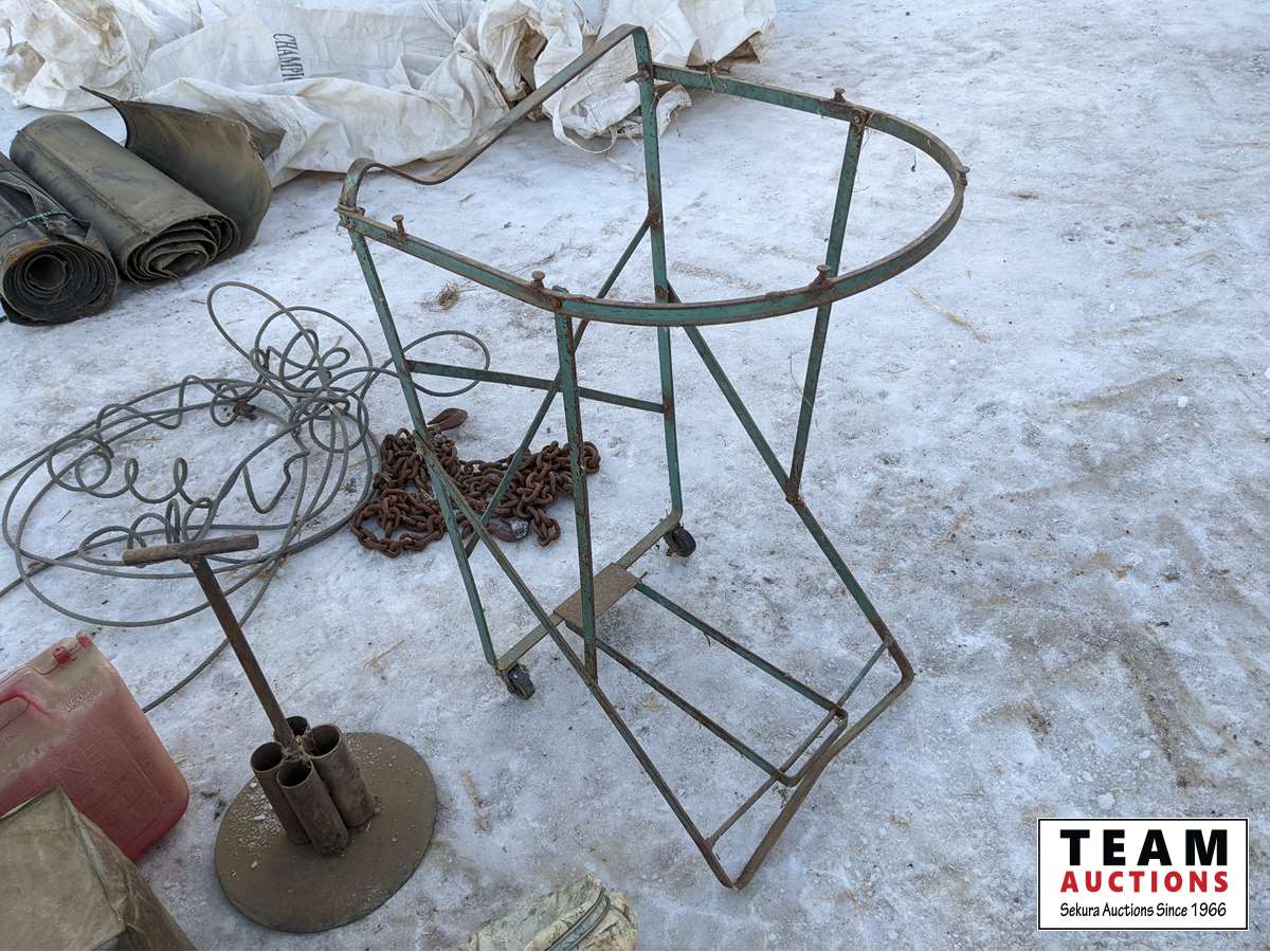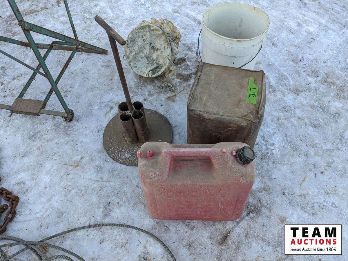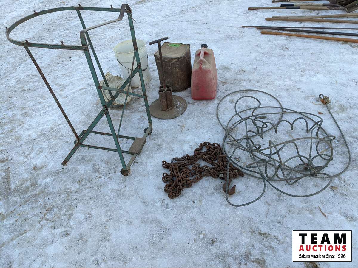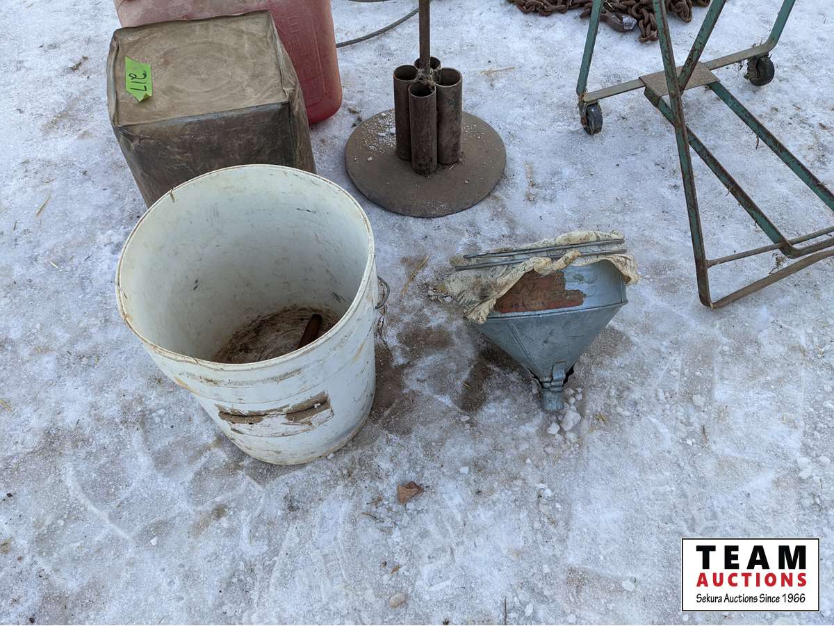 Antique funnel with cloth holder, jerry can, bag holder, chain with hooks, welding rod holder, cable