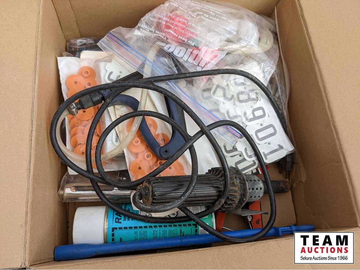 Ear tags, ear tag pliers, stock trough heater, needles, syringes, dehorners, castrator, stock prod, miscellaneous