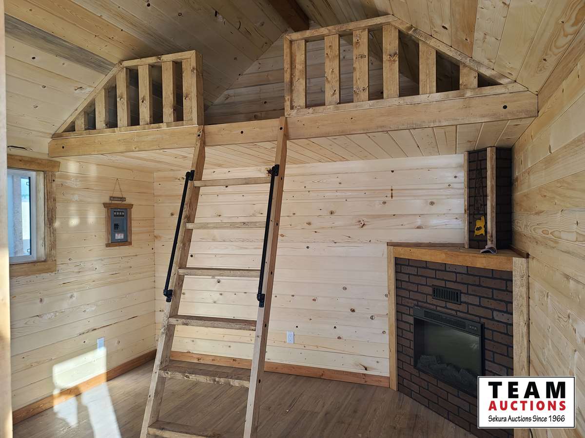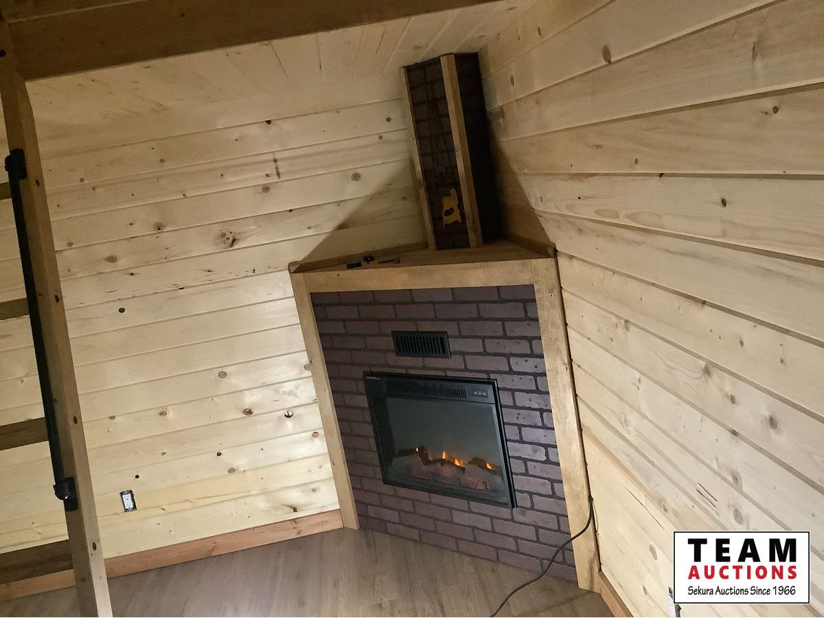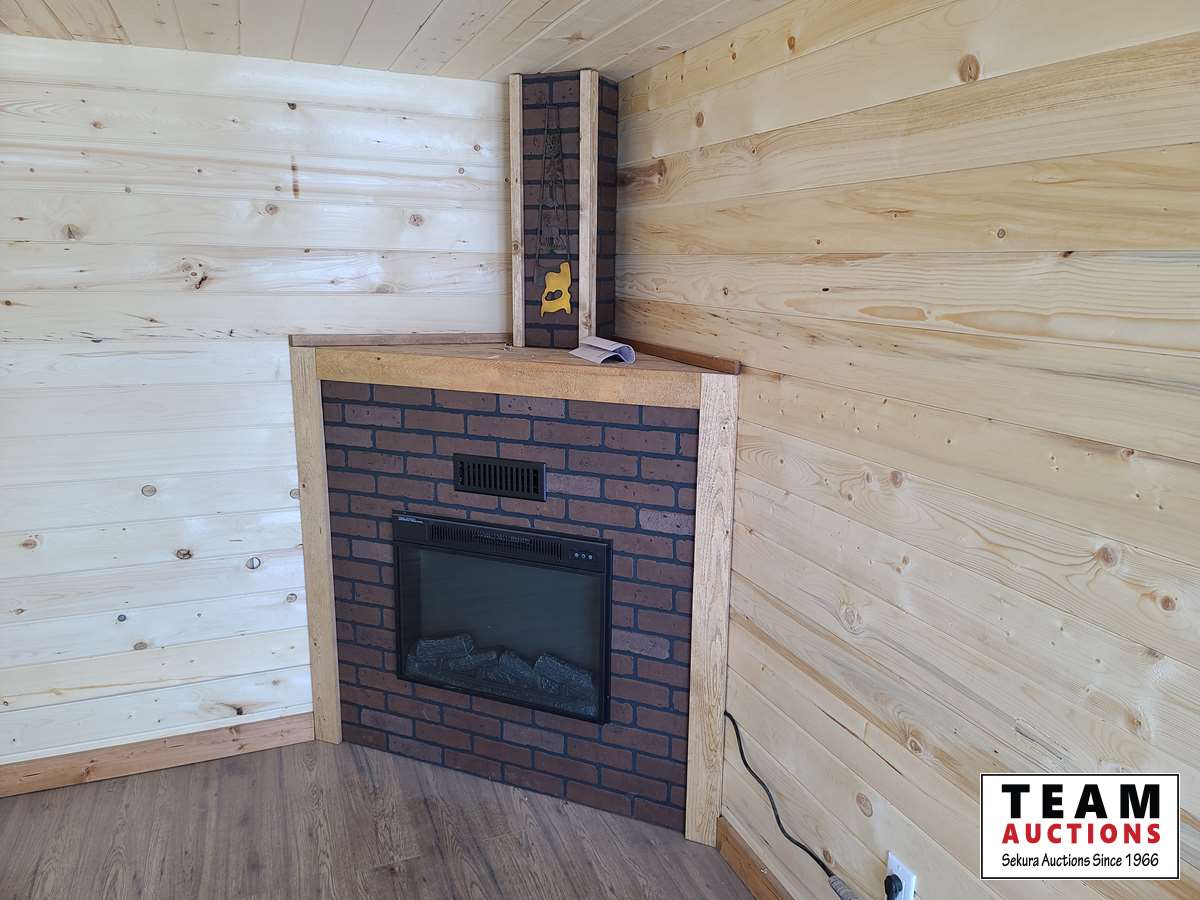 Single carpeted loft, corner mount electric fireplace, front veranda, 2 x 6 walls and ceiling, metal roof, laminate flooring, wired with 100 amp service, all wired with pot lights, on skids with front tow bar, one opening side window, all stained with Australian timber oil