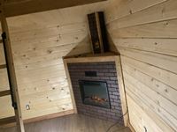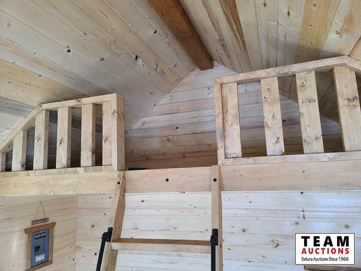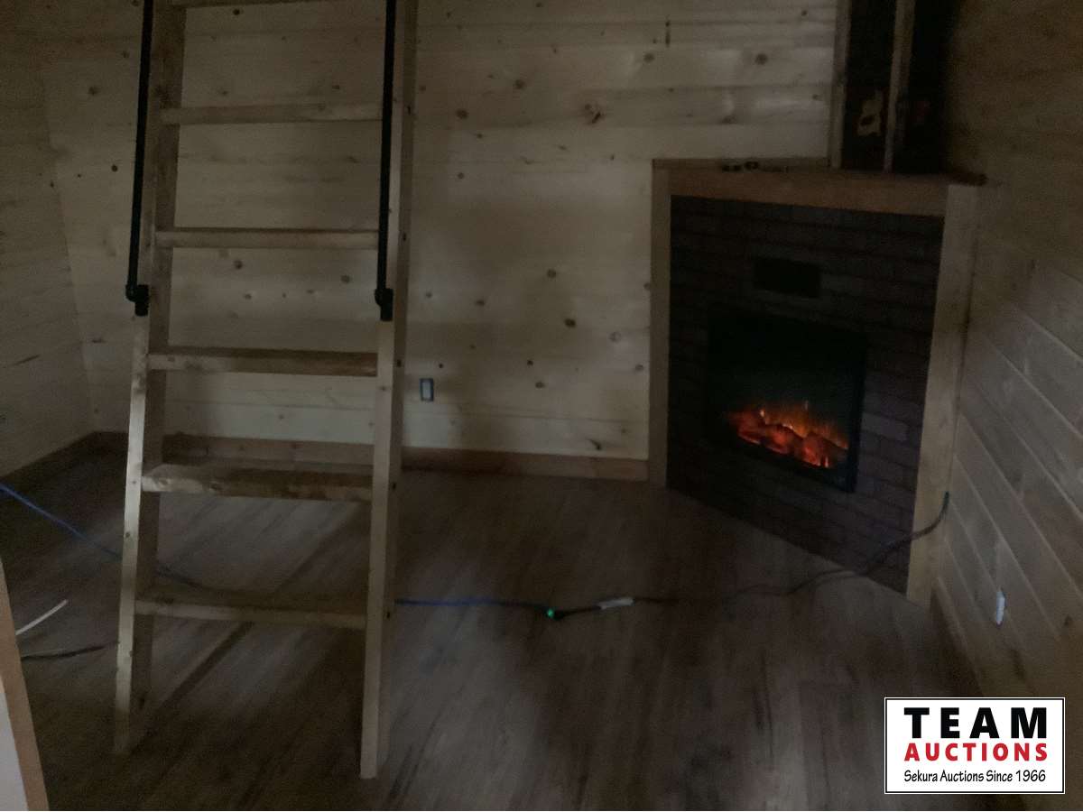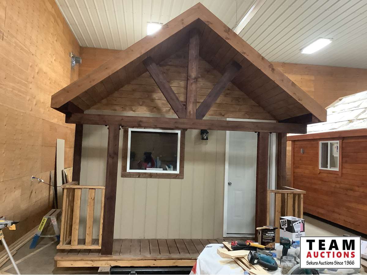 Single carpeted loft, corner mount electric fireplace, front veranda, 2 x 6 walls and ceiling, metal roof, laminate flooring, wired with 100 amp service, all wired with pot lights, on skids with front tow bar, one opening side window, all stained with Australian timber oil