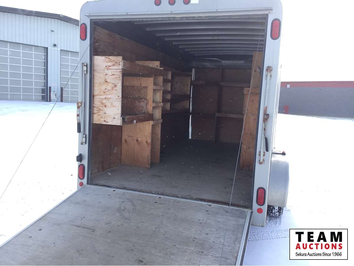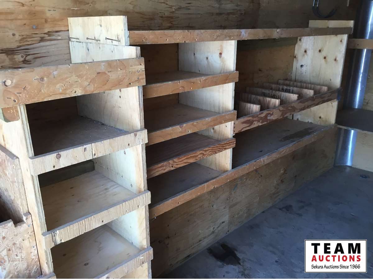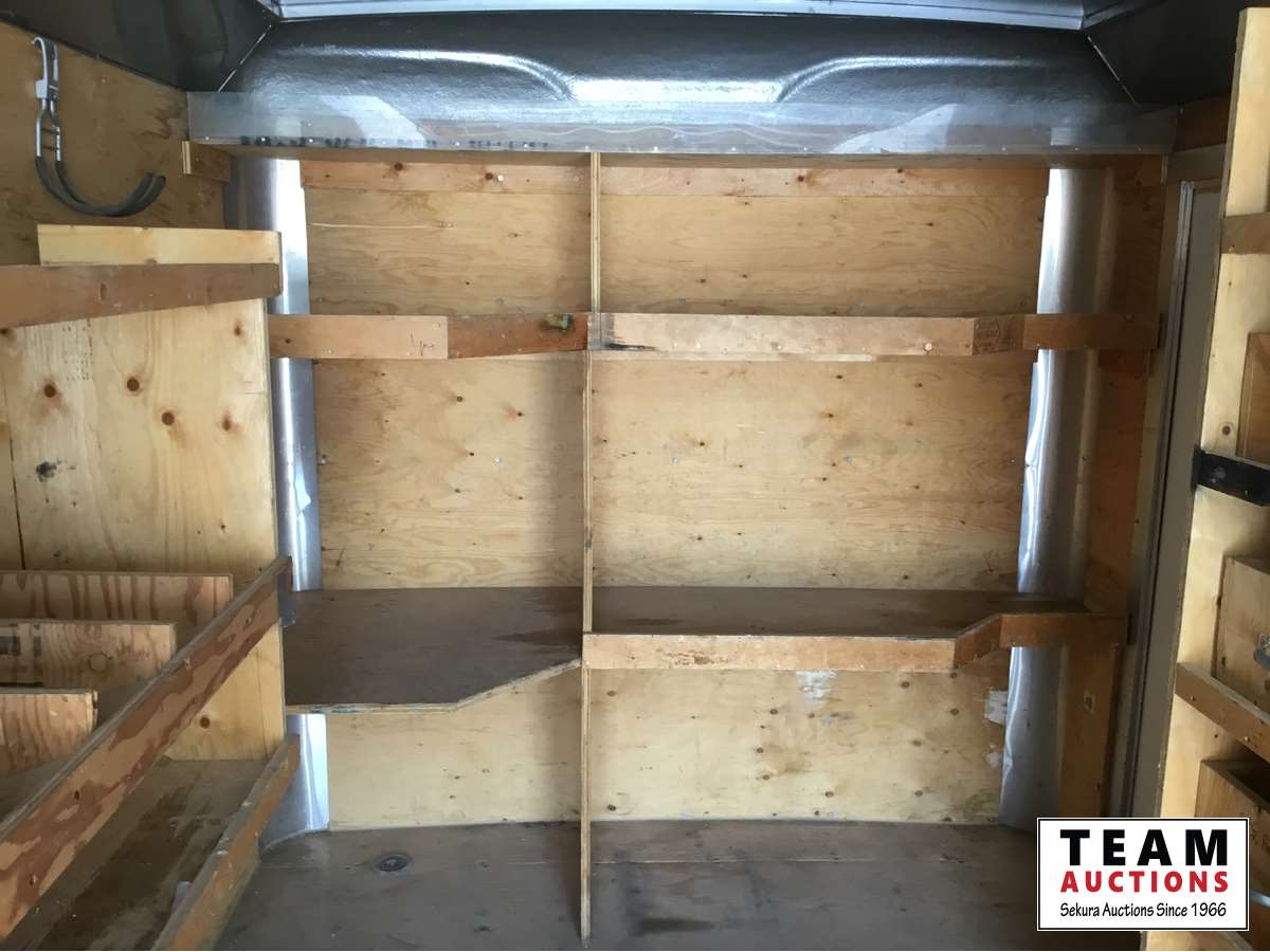 Ball hitch, fold down rear door, side entry door, custom built wooden shelving, 3500 lb axles, 205/75R15 tires
