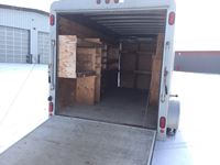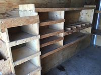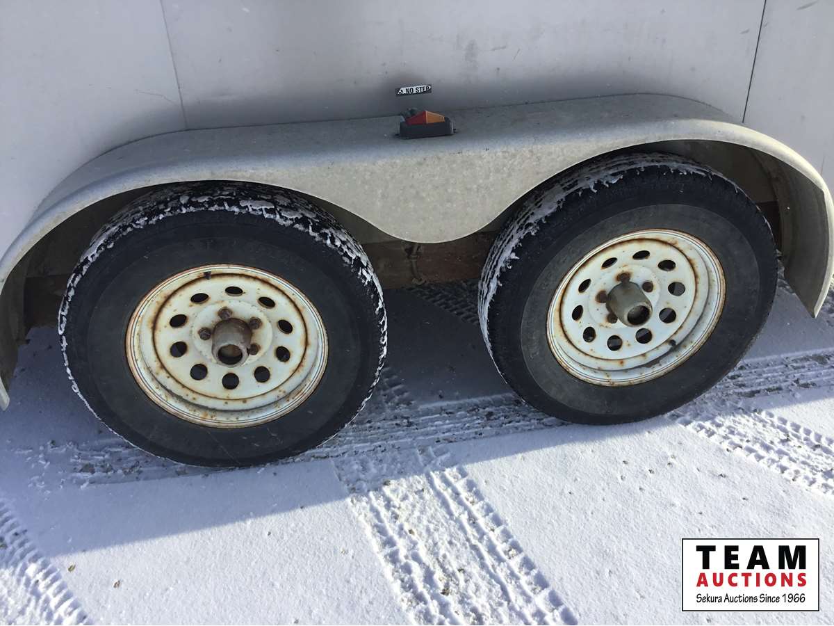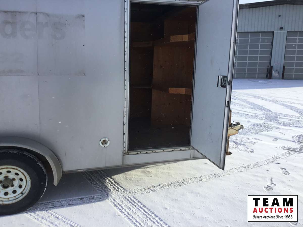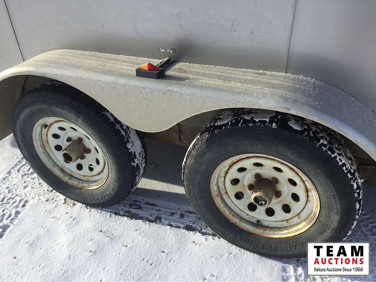 Ball hitch, fold down rear door, side entry door, custom built wooden shelving, 3500 lb axles, 205/75R15 tires