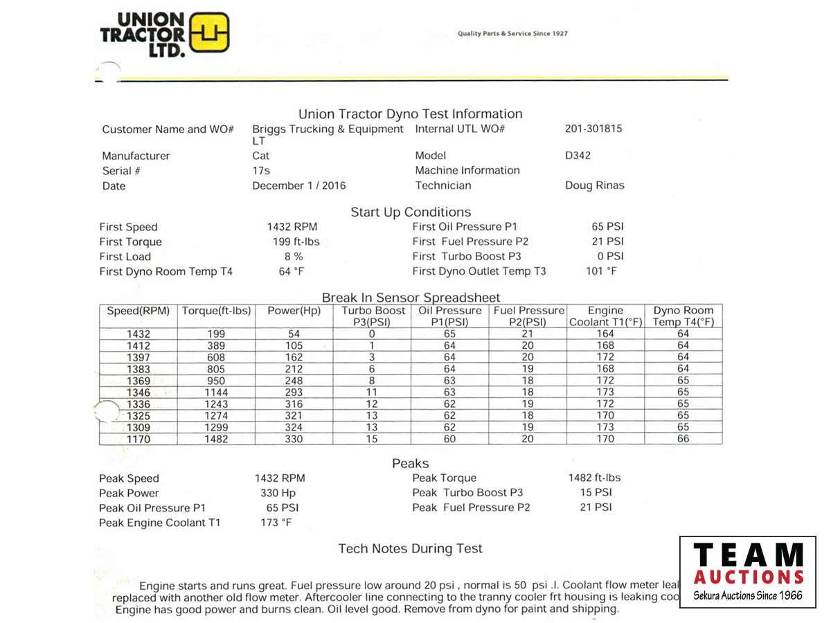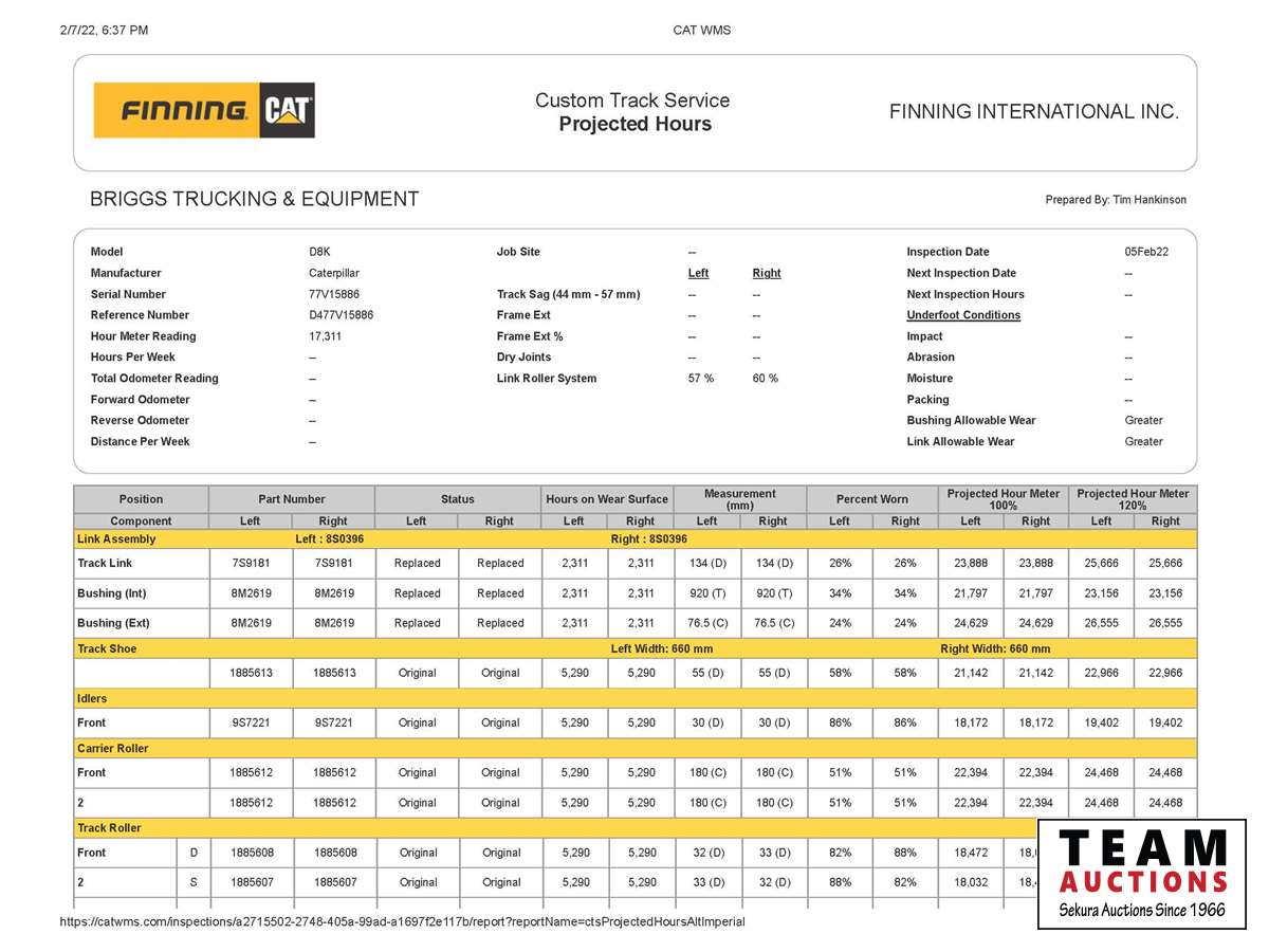 See attached undercarriage work order. Nov 2007 at 15,481 hrs the following repairs were done, hydraulic pump, transmission, torque convertor, cross shaft, steering clutch's, final drive and other repairs for a cost of $72,726.00. Also in 2007 the cab was installed with AC for a cost of $25,000.00. 2016 engine tear down to bare block, pulled crank, rebuilt engine and injectors for $28,234.00. All work done at Union Tractor in Edmonton. We have all work orders from 1994 to 2021 on hand. There was anew starter installed and we have a binder with all repairs and maintainance done from 1994 that total $190,000.00. This is a one of a kind crawler with AC in cab and everything works on this machine. Click on attached PDF's with Finning undercarriage report and Union Tractor dyno report.