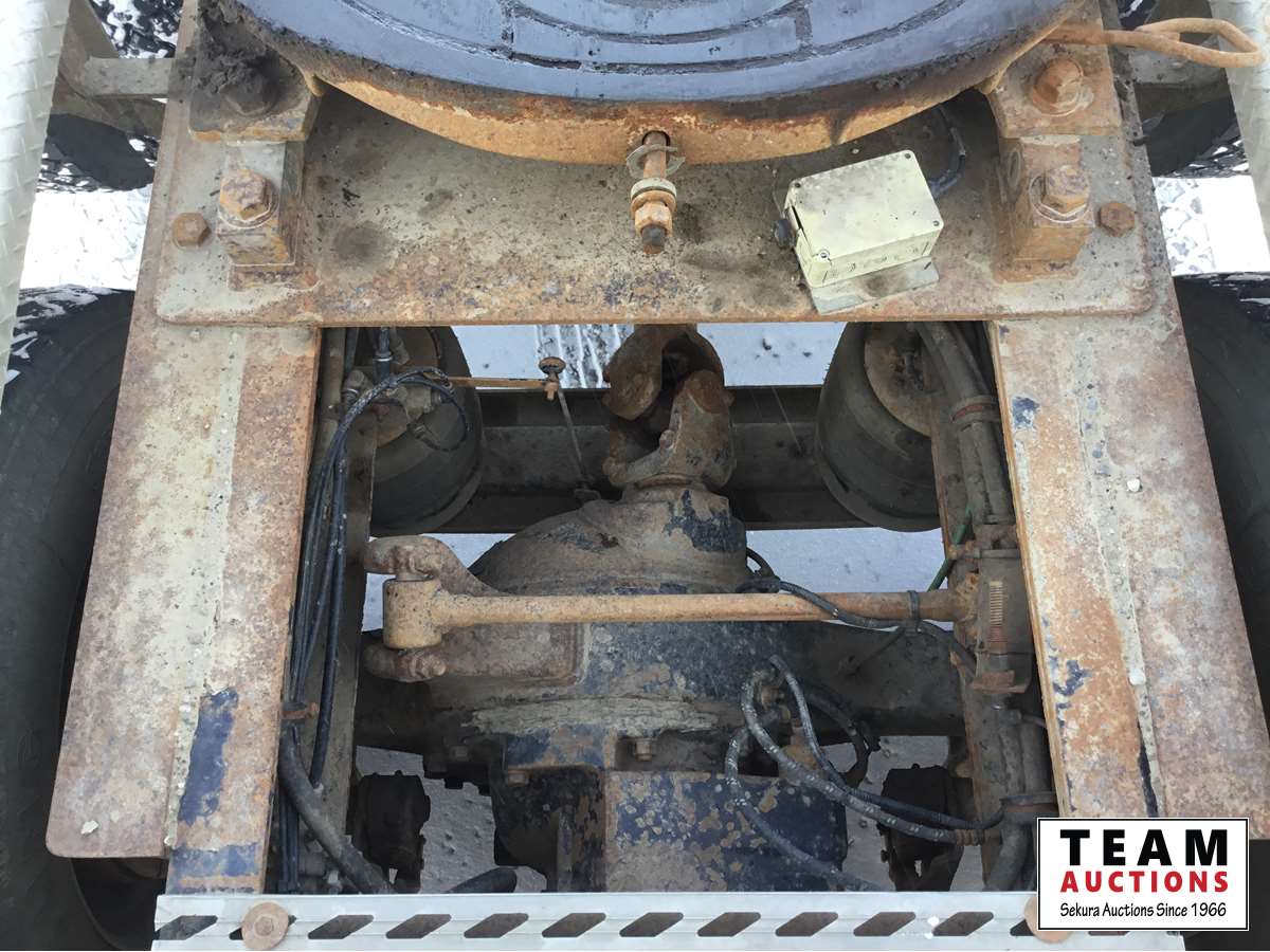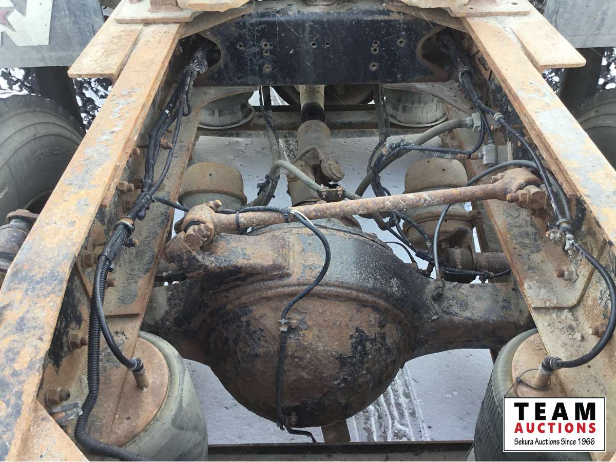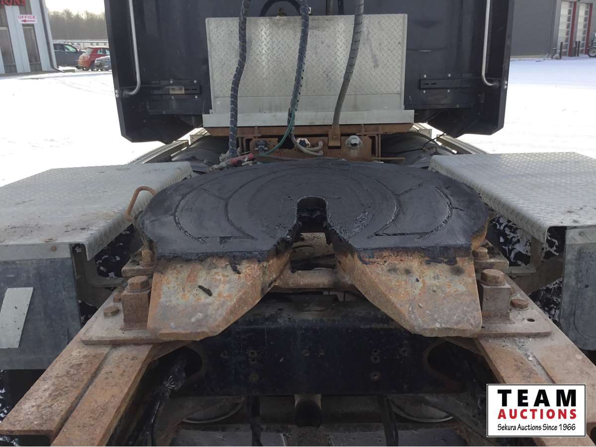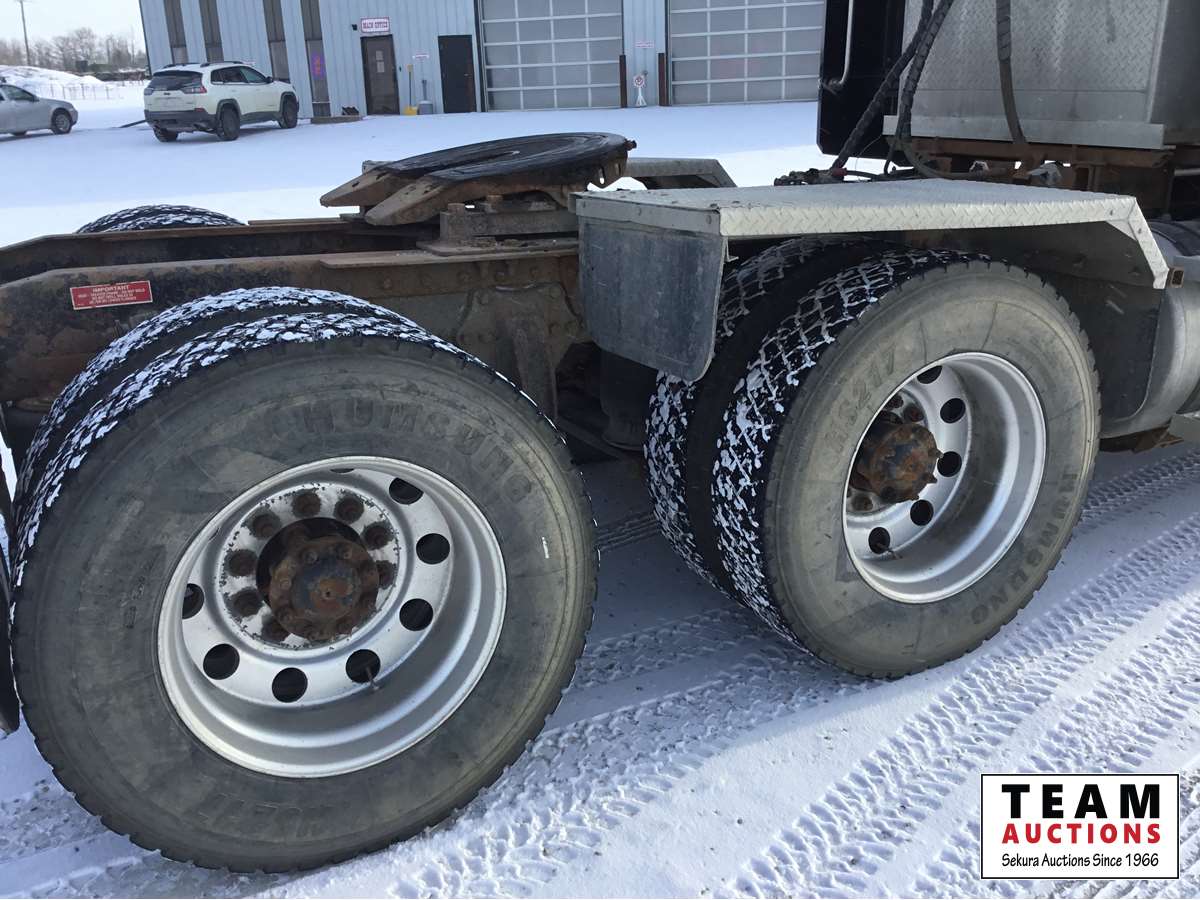 Detroit DD15 14.8 L, 580 HP engine, Eaton 18 speed transmission, 12,000 lb front axle, 46,000 lb rears, full locking differential, air ride suspension, sliding 5th wheel, Wabasto heater, 11R24.5 tires on aluminum rims, wet kit, wheel chains