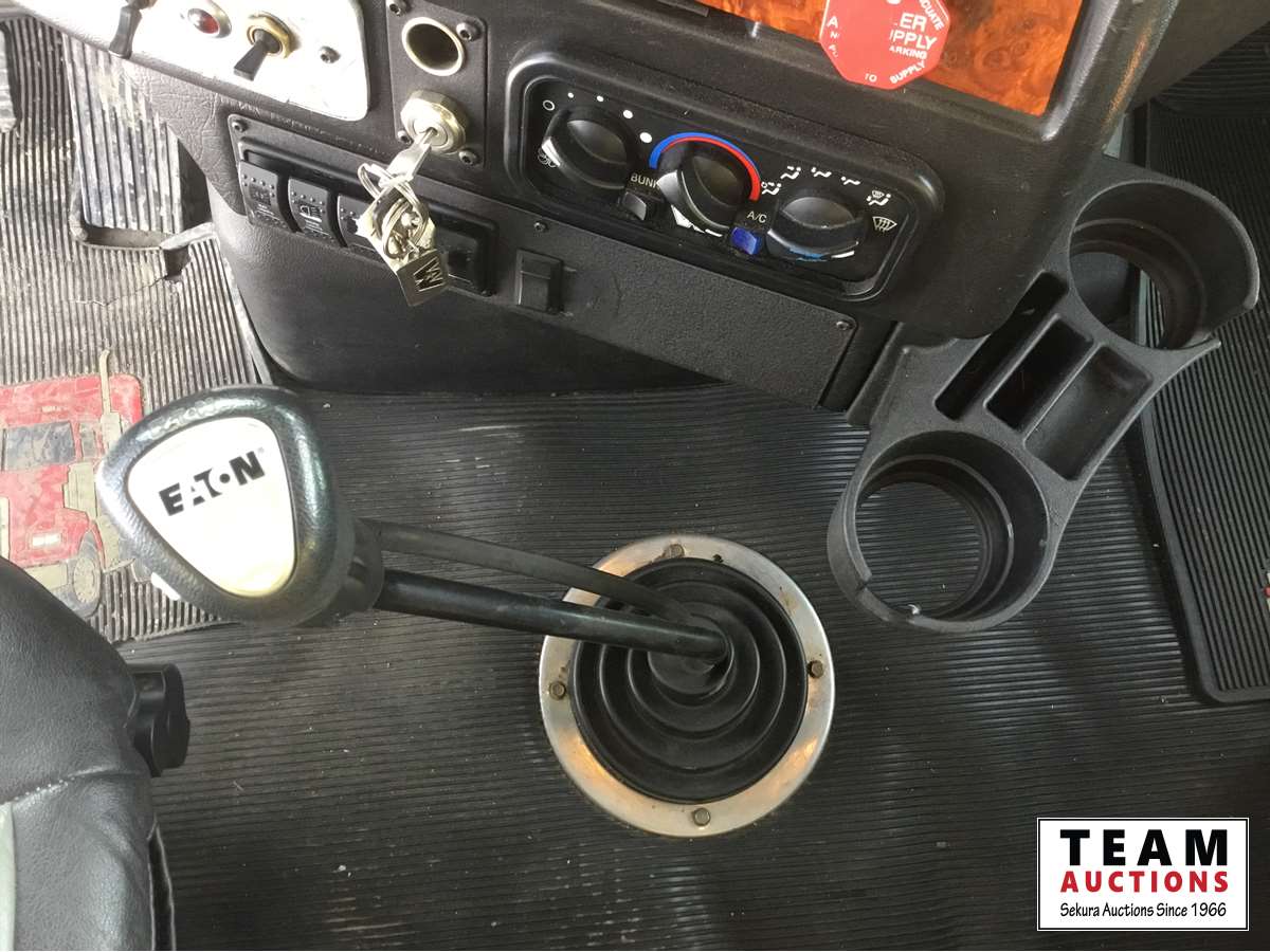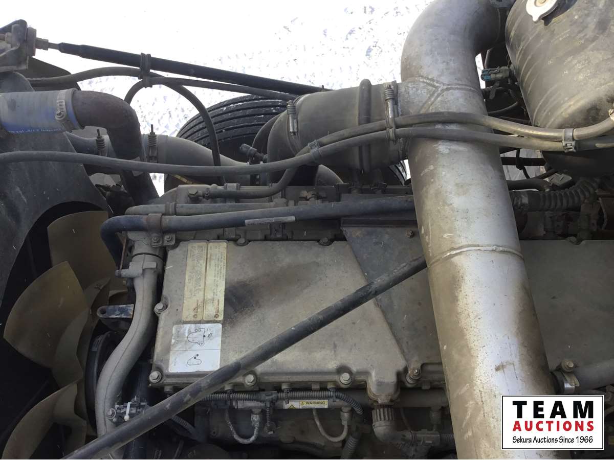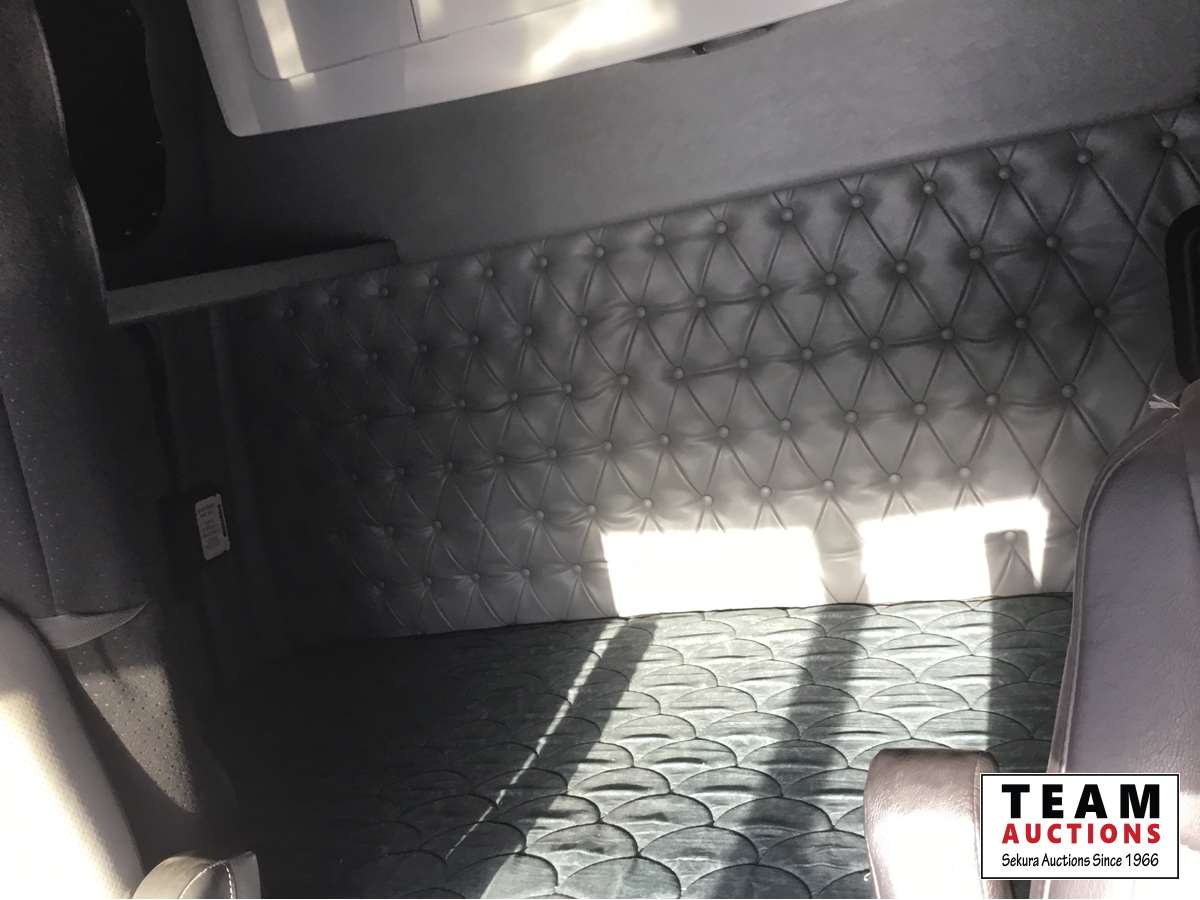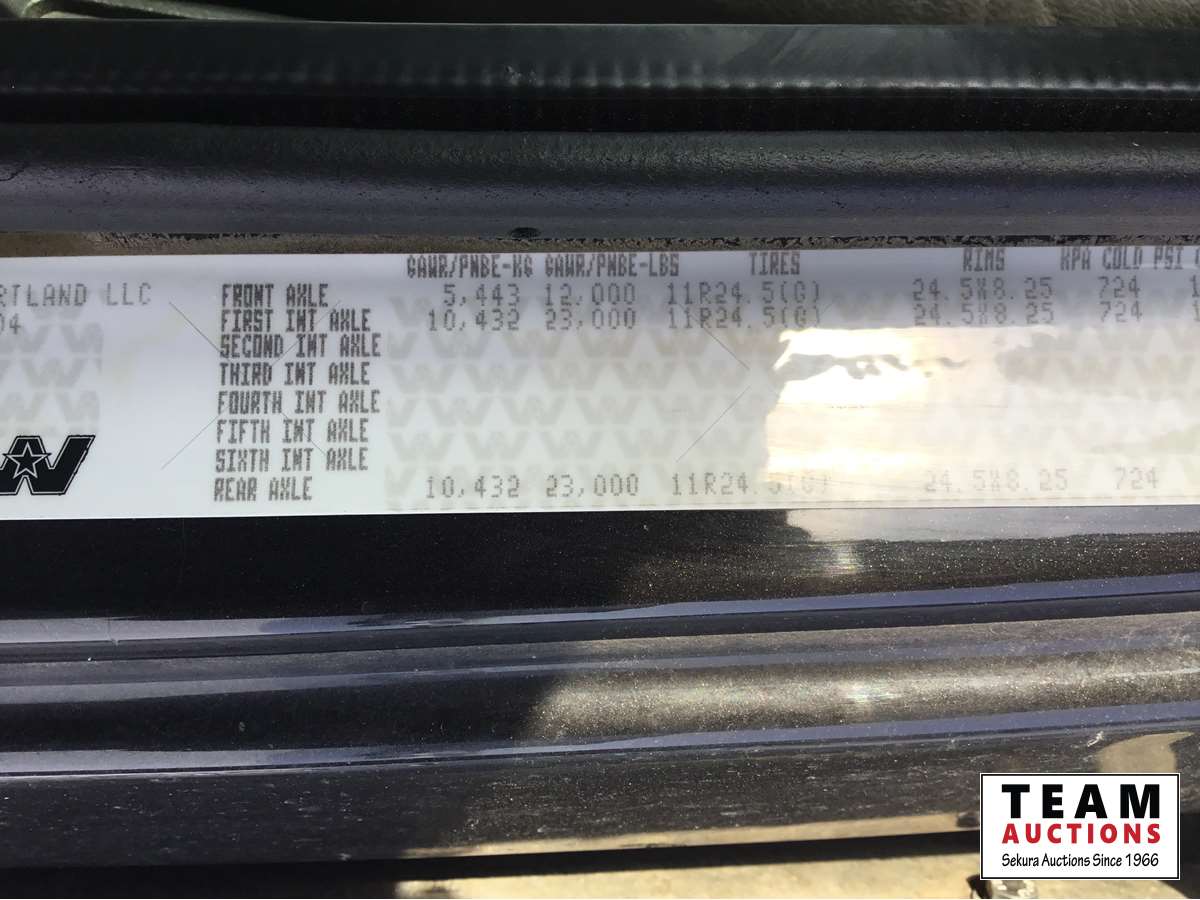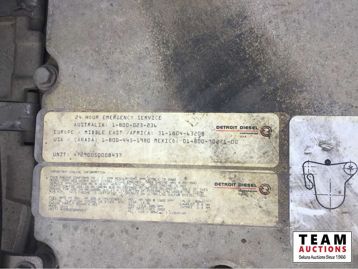 Detroit DD15 14.8 L, 580 HP engine, Eaton 18 speed transmission, 12,000 lb front axle, 46,000 lb rears, full locking differential, air ride suspension, sliding 5th wheel, Wabasto heater, 11R24.5 tires on aluminum rims, wet kit, wheel chains