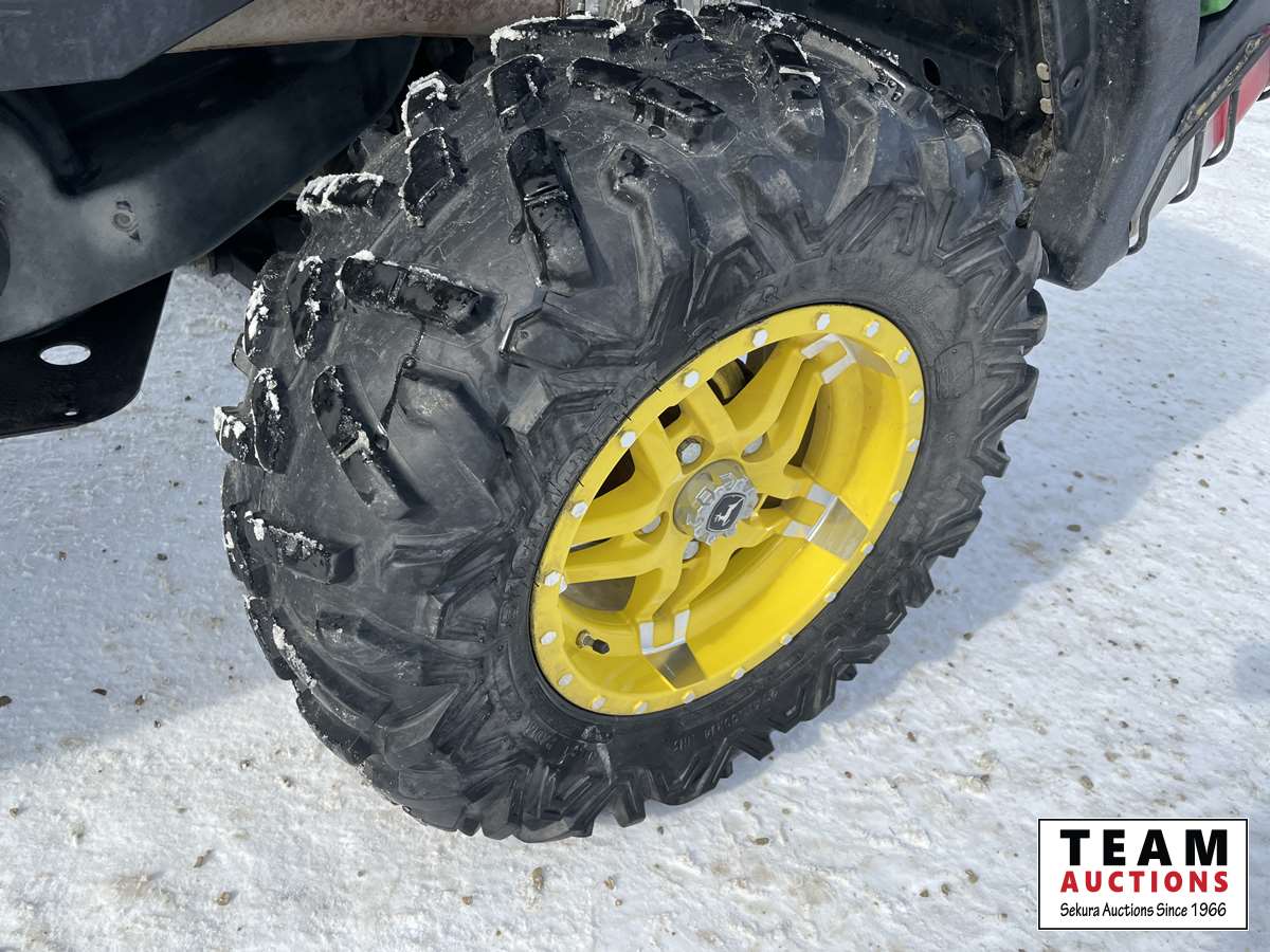 812 cc, 3 cylinder, 4 stroke engine, CVT transmission, independent double a-arm front suspension, independent rear suspension, hydraulic disc brakes, reverse, power steering, power dump box, canopy, 27 x 9-14 front tires, 27 x 11-14 rear tires