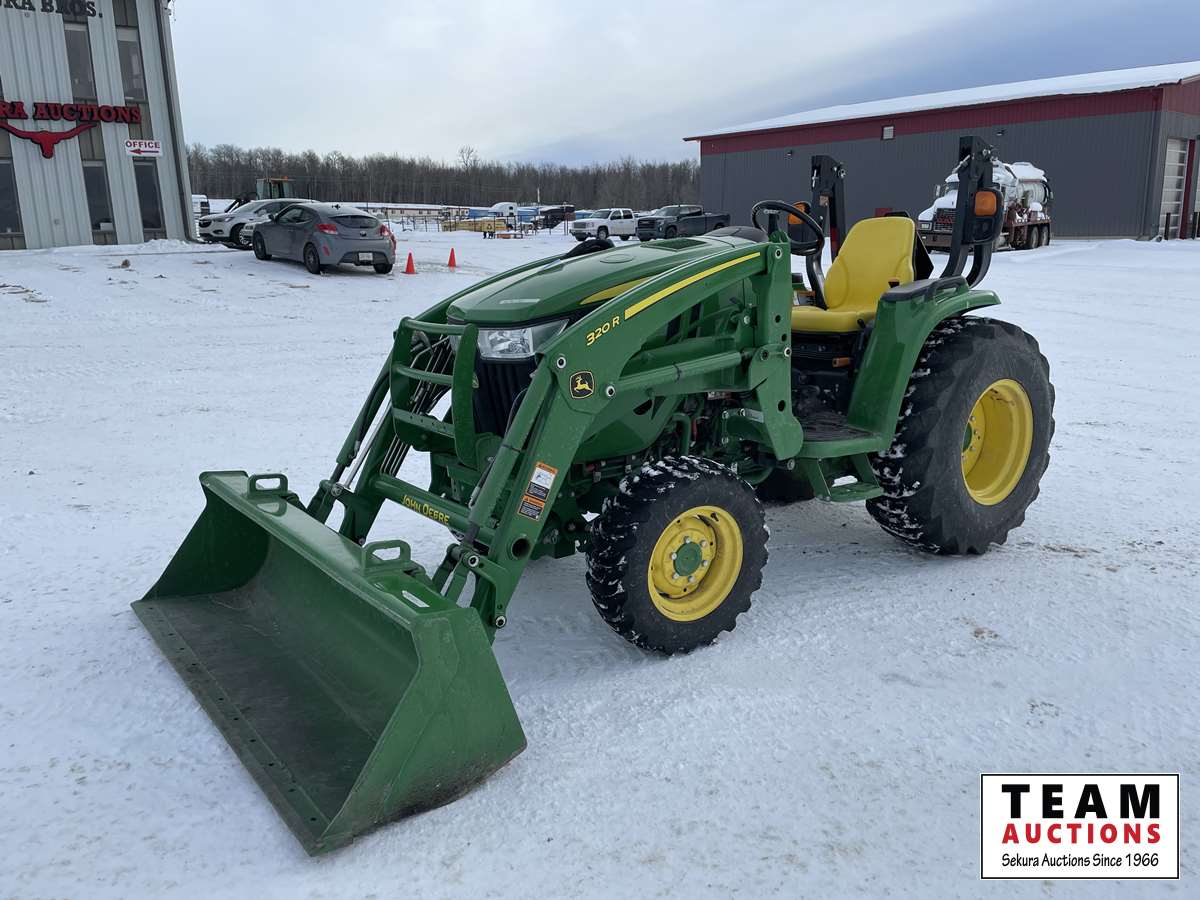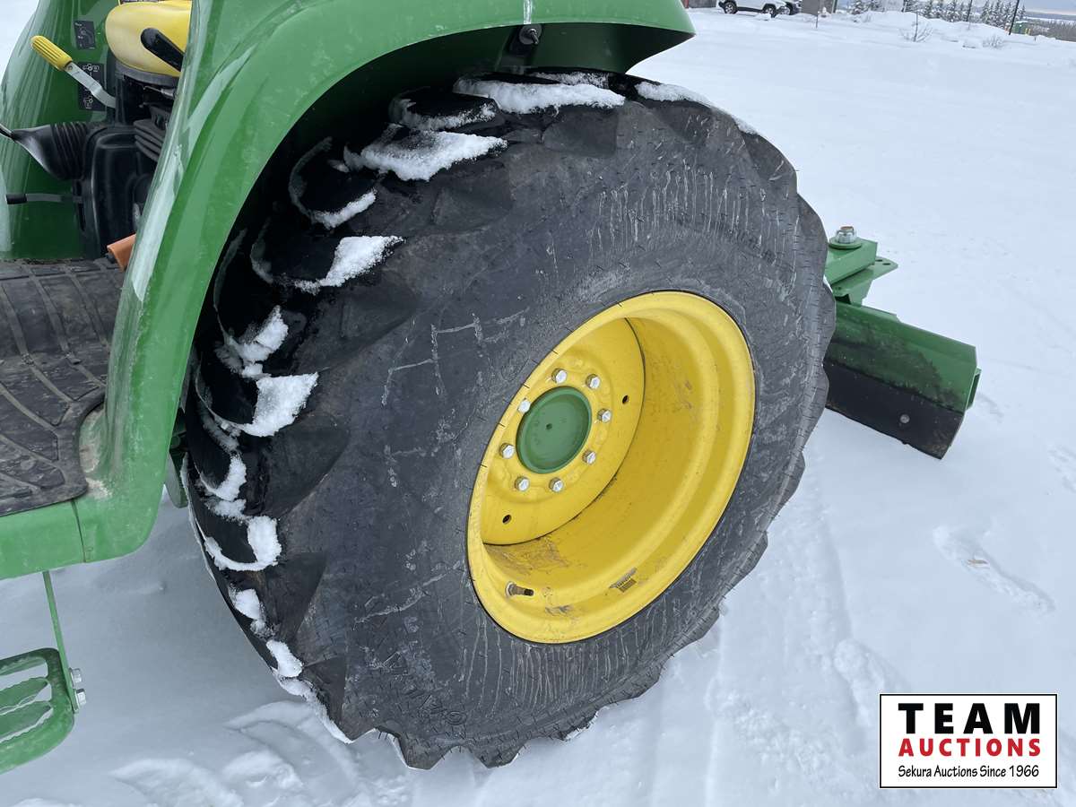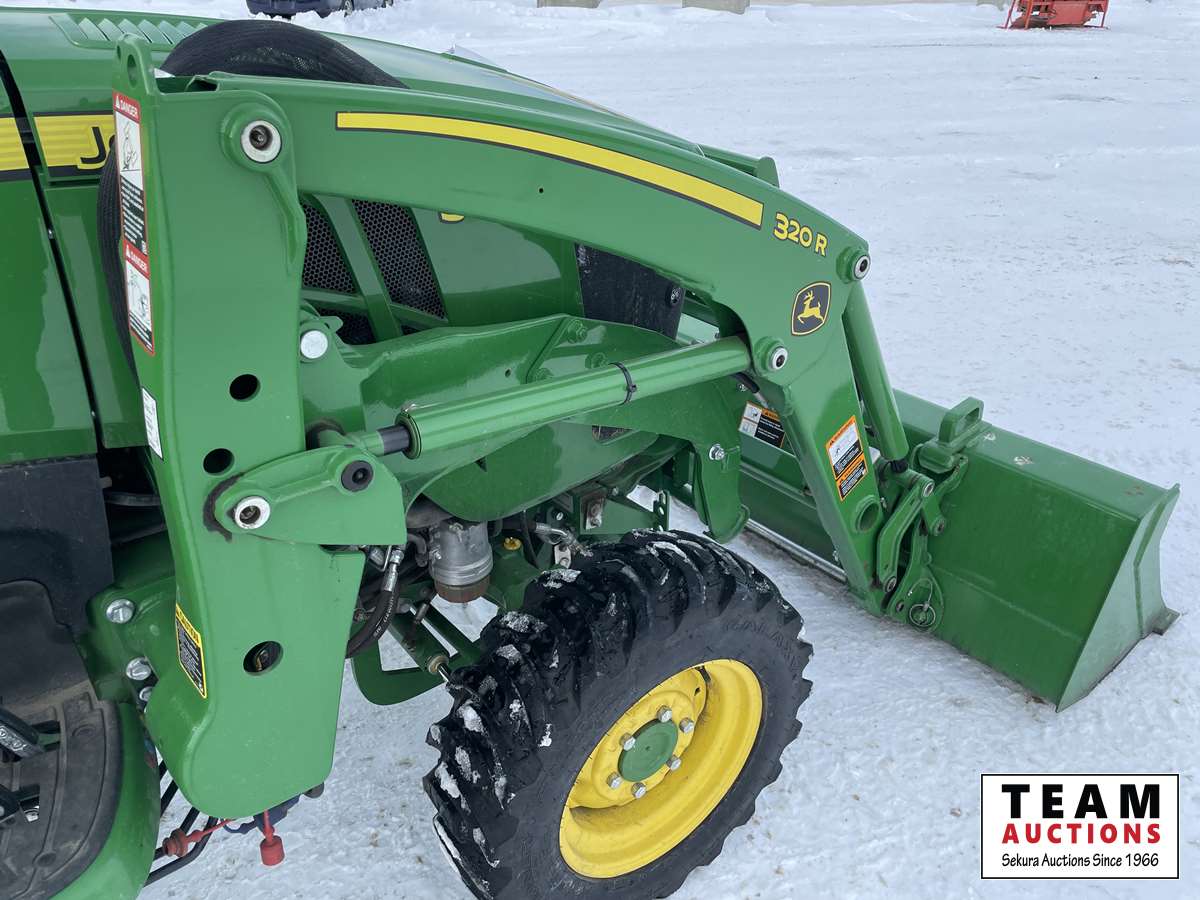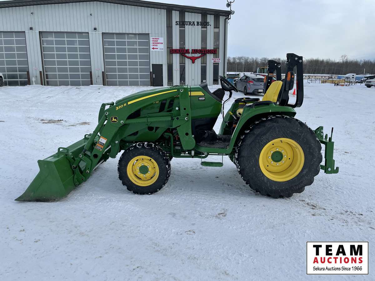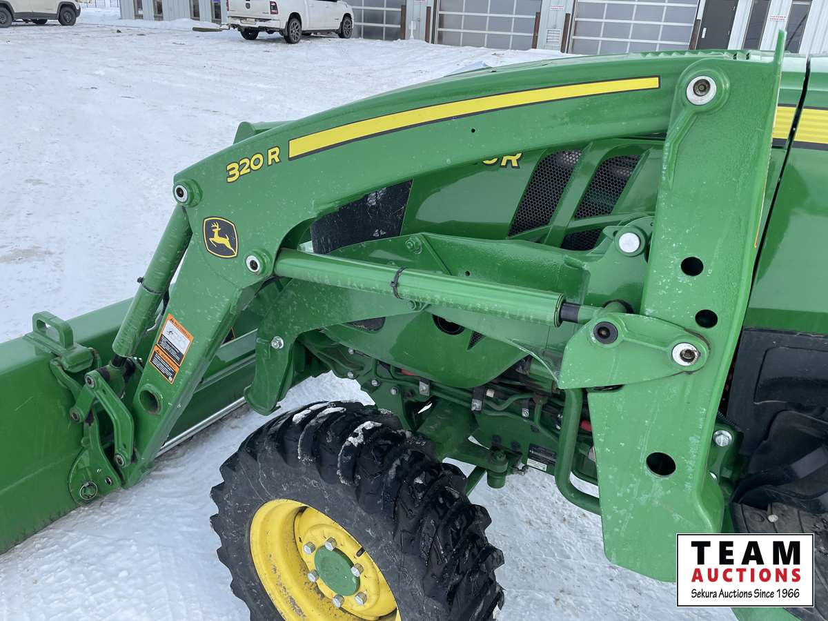 John Deere 320R Loader, 6 ft Q/A bucket, joystick, John Deere 59 inch front mount snow blower, John Deere 366 66 inch front mount blade, Yanmar 1.6 L 3 cylinder diesel engine, power steering, 3 speed hydrostatic transmission, two-post foldable ROPS, 540 PTO, 3 PT with I Match Q/A connector, 7.00-14 front, 11.2-24 rear tires