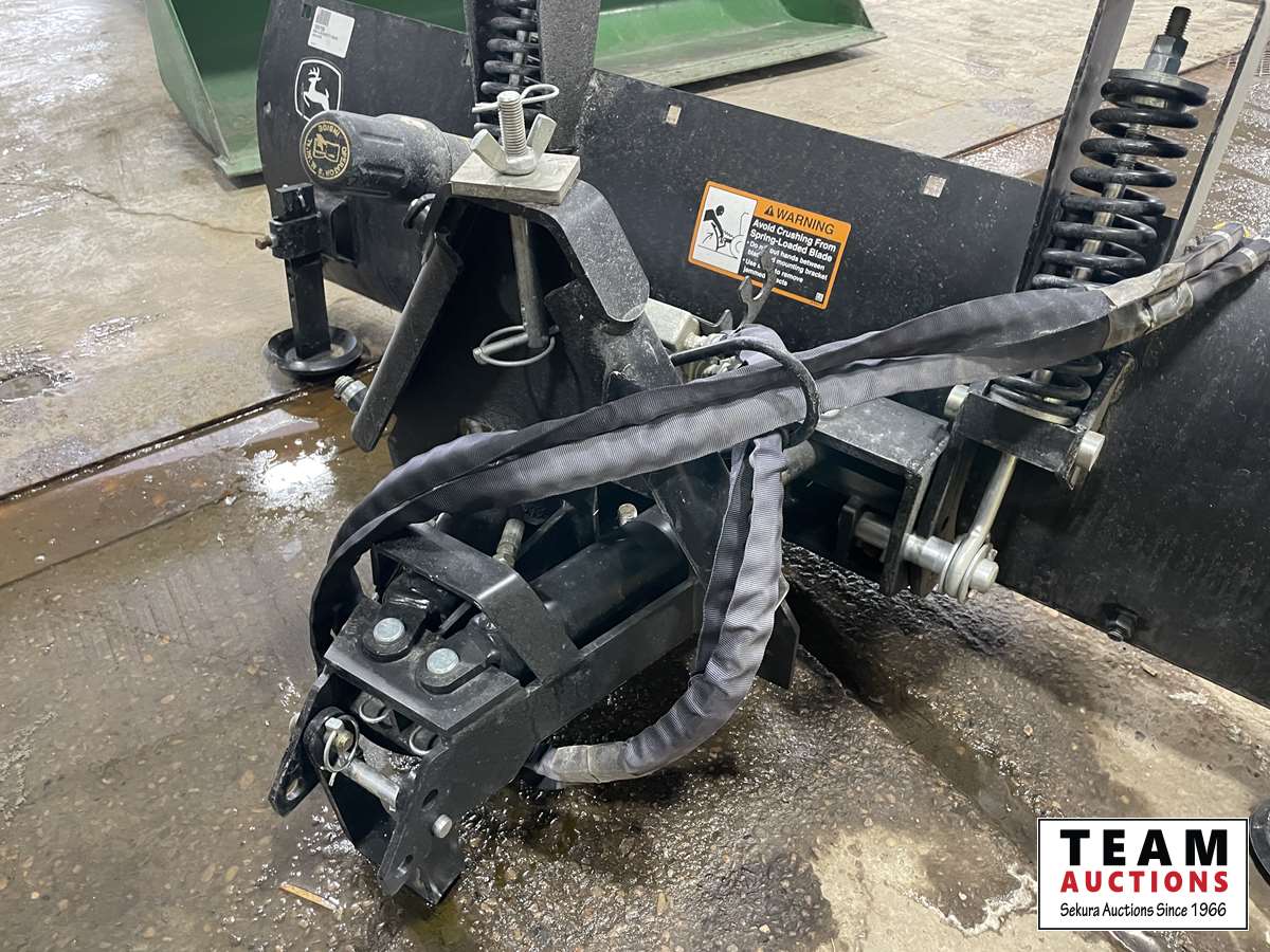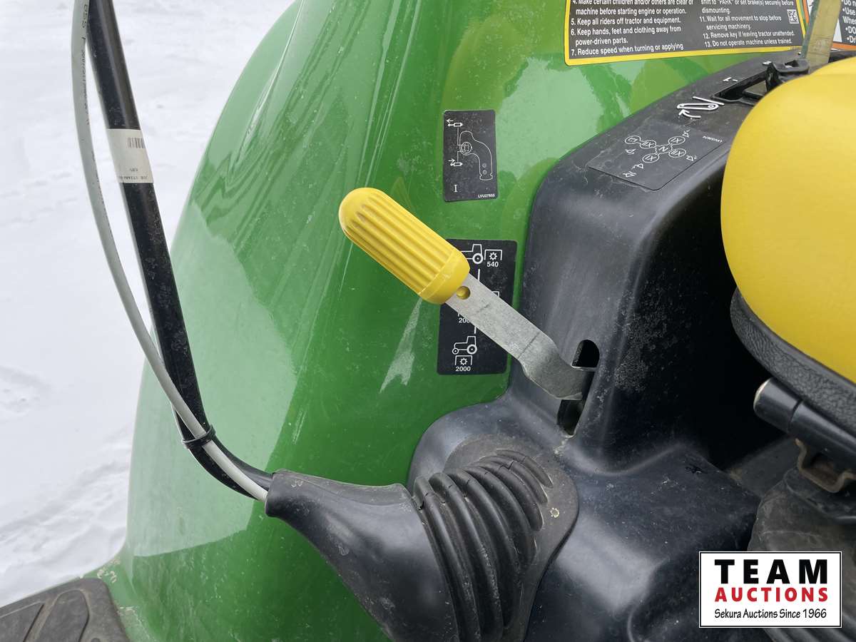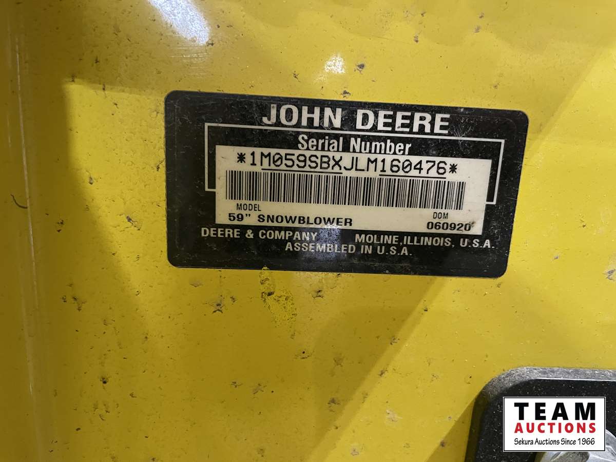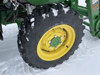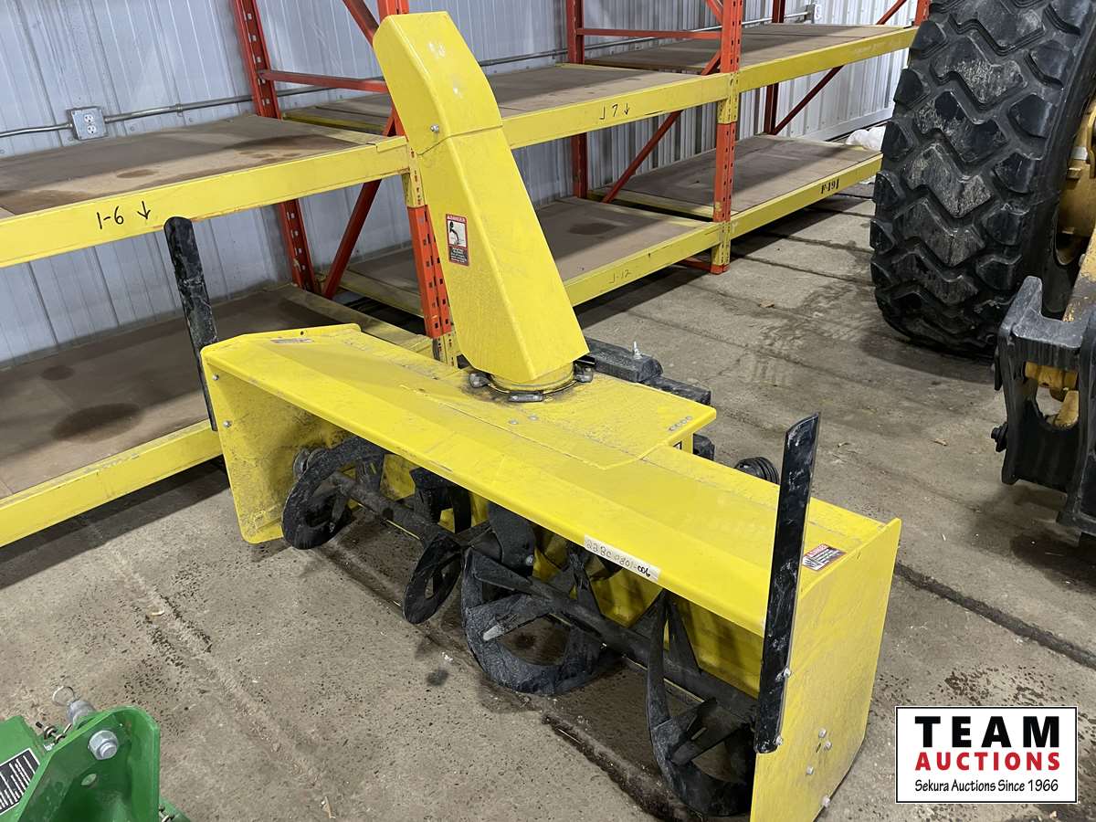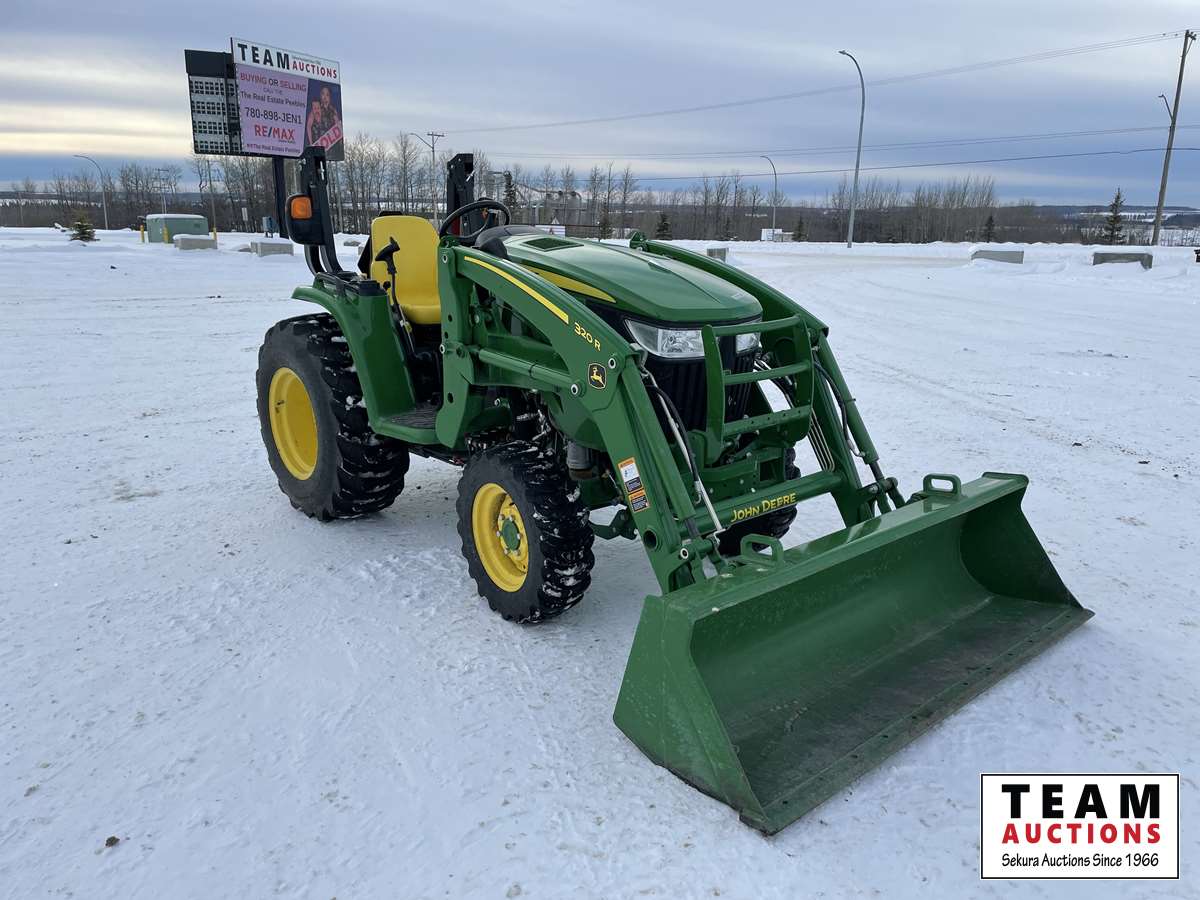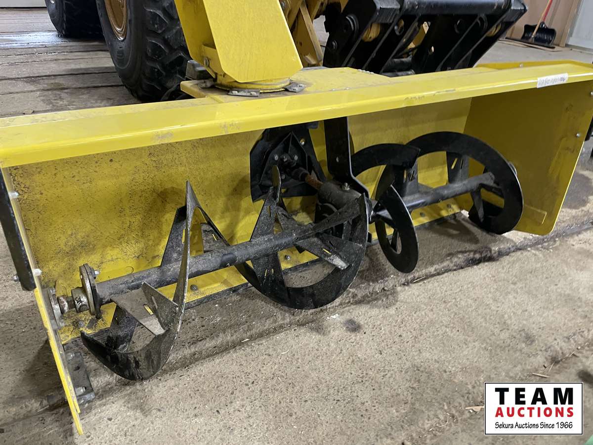 John Deere 320R Loader, 6 ft Q/A bucket, joystick, John Deere 59 inch front mount snow blower, John Deere 366 66 inch front mount blade, Yanmar 1.6 L 3 cylinder diesel engine, power steering, 3 speed hydrostatic transmission, two-post foldable ROPS, 540 PTO, 3 PT with I Match Q/A connector, 7.00-14 front, 11.2-24 rear tires