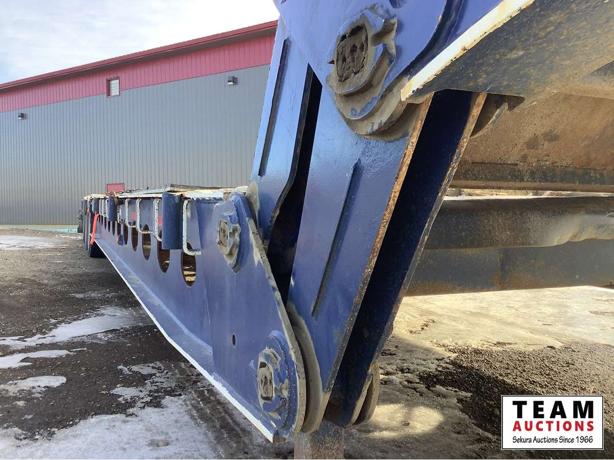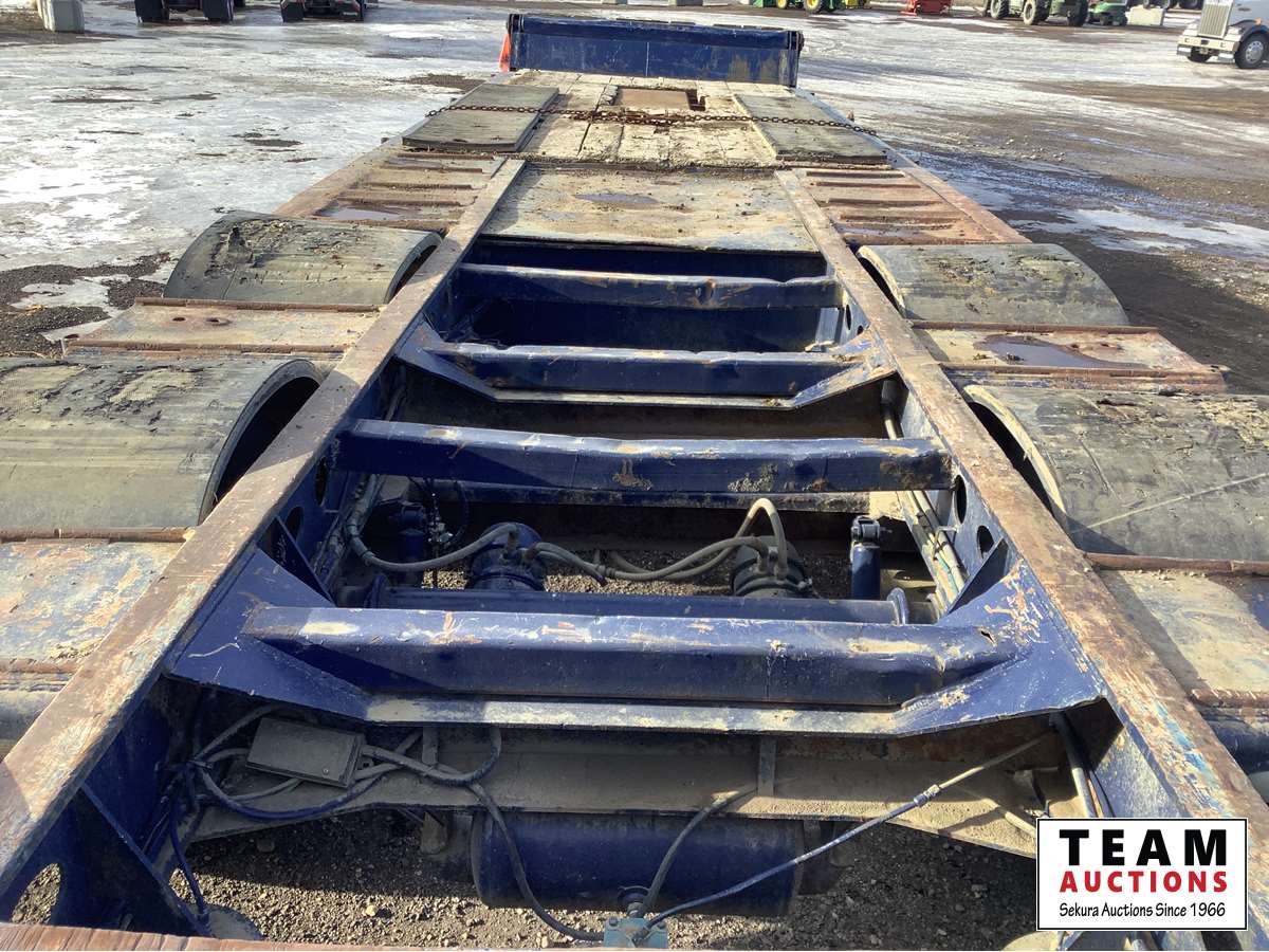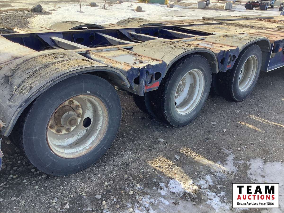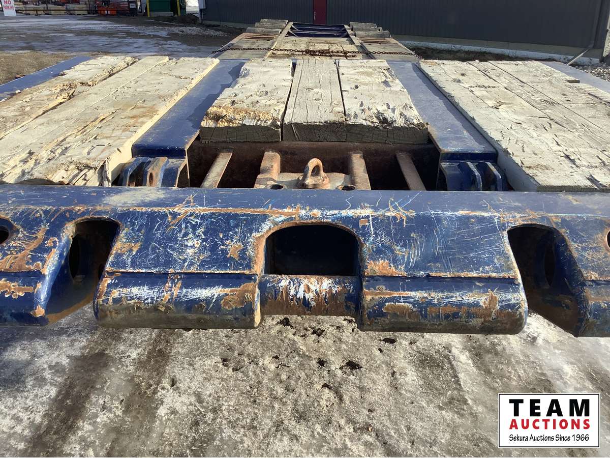 10 ft wide deck, rear flip over beaver tails, rear live roll, air ride, pin pockets, (3) bar winches, wide load and rear strobe lights, rubber belting over wheels, rubber belting on main deck, open boom well over rear axles, can adapt a front extension for jeep, 275/70R22.5 tires