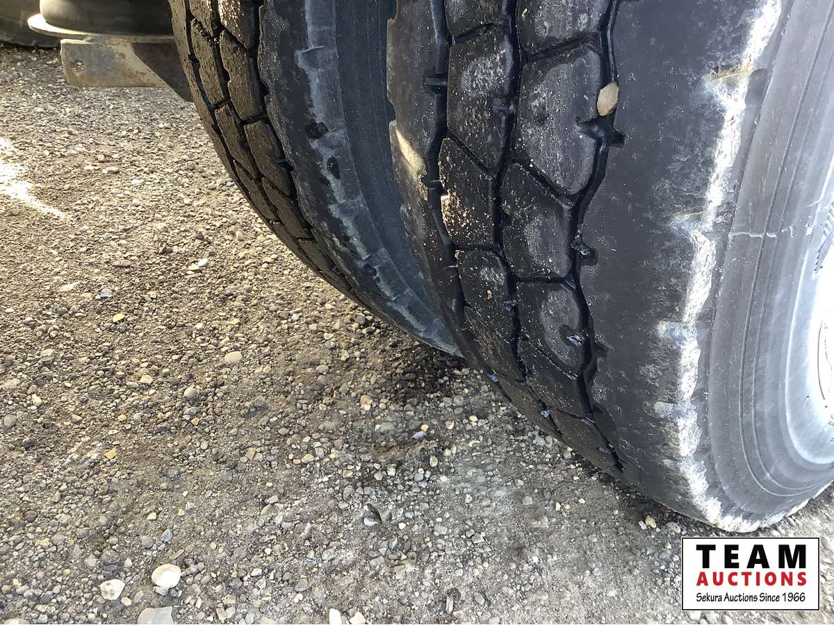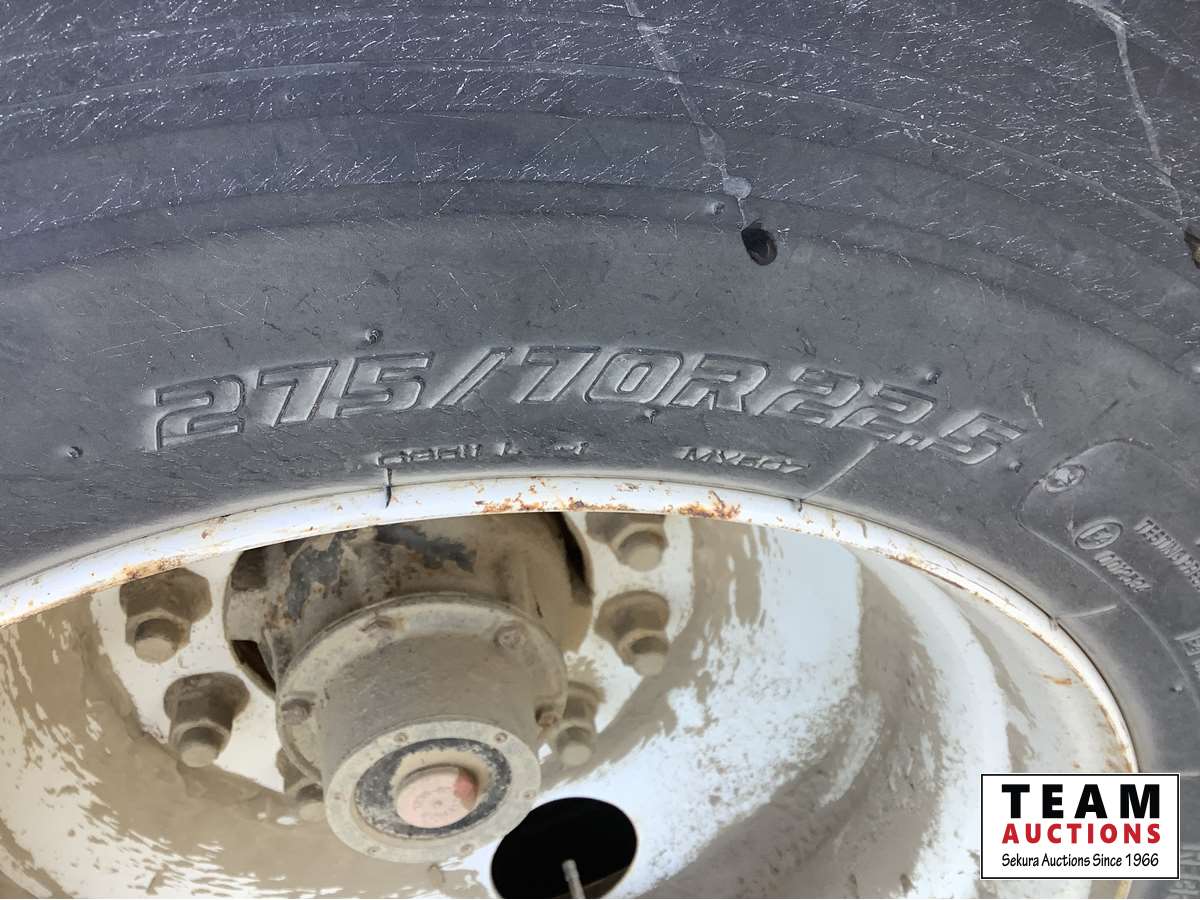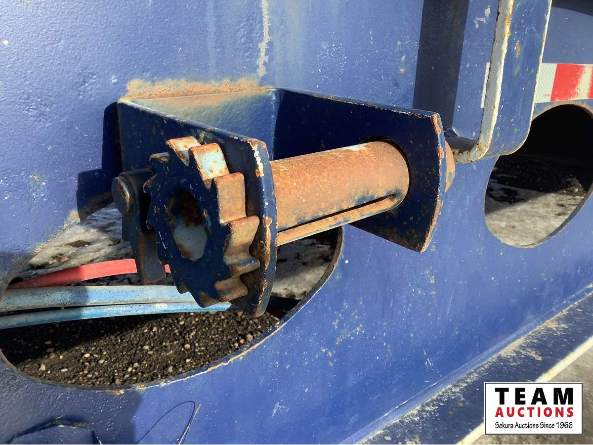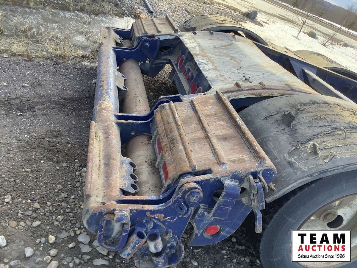 10 ft wide deck, rear flip over beaver tails, rear live roll, air ride, pin pockets, (3) bar winches, wide load and rear strobe lights, rubber belting over wheels, rubber belting on main deck, open boom well over rear axles, can adapt a front extension for jeep, 275/70R22.5 tires