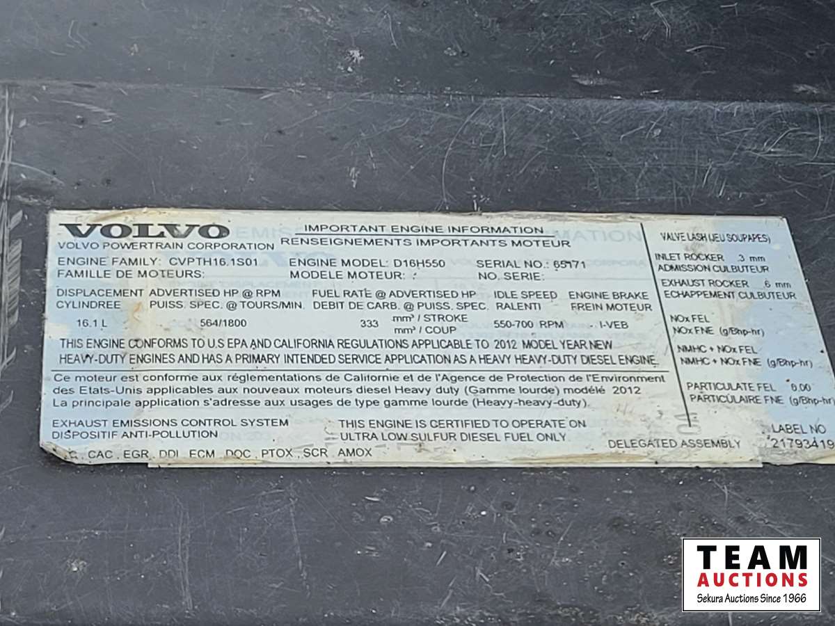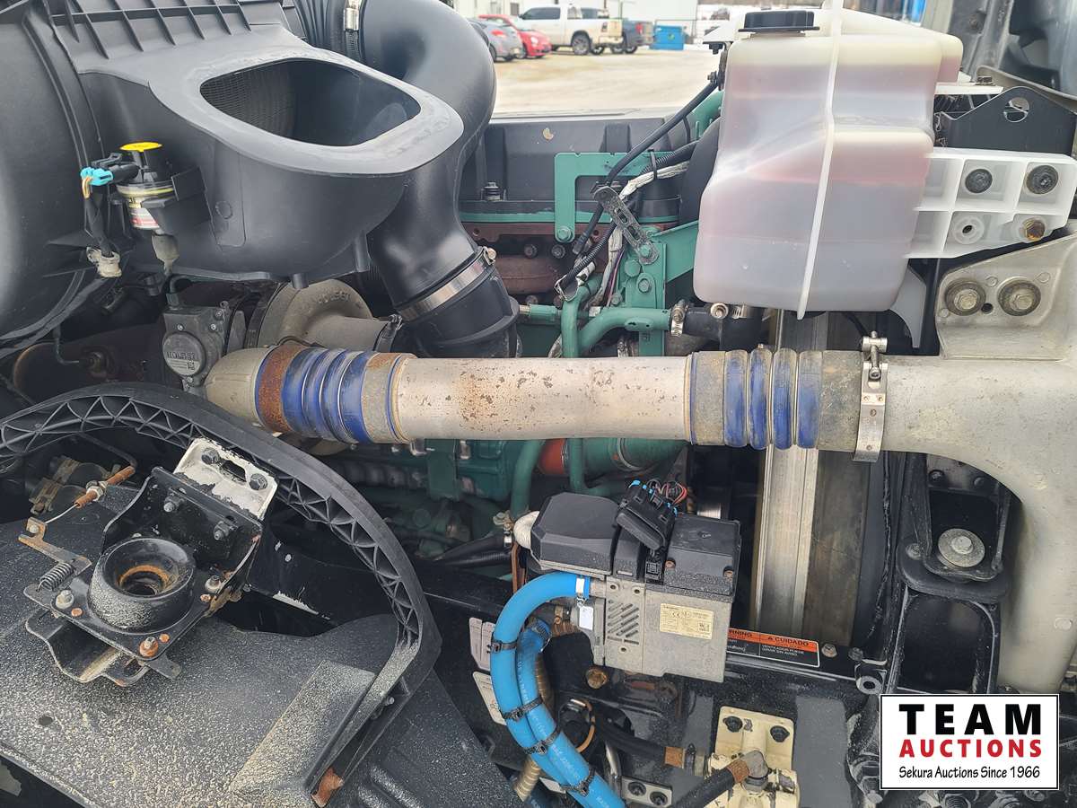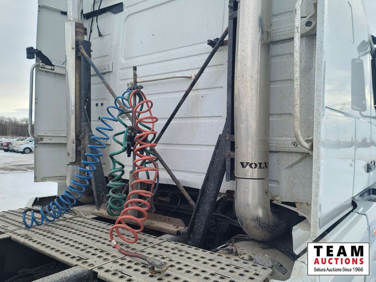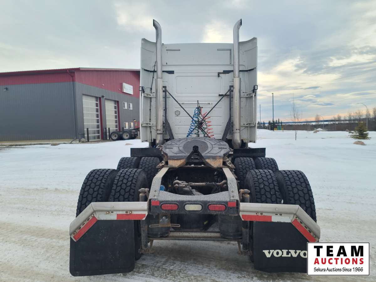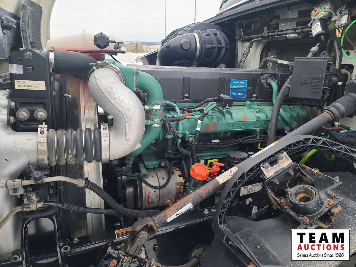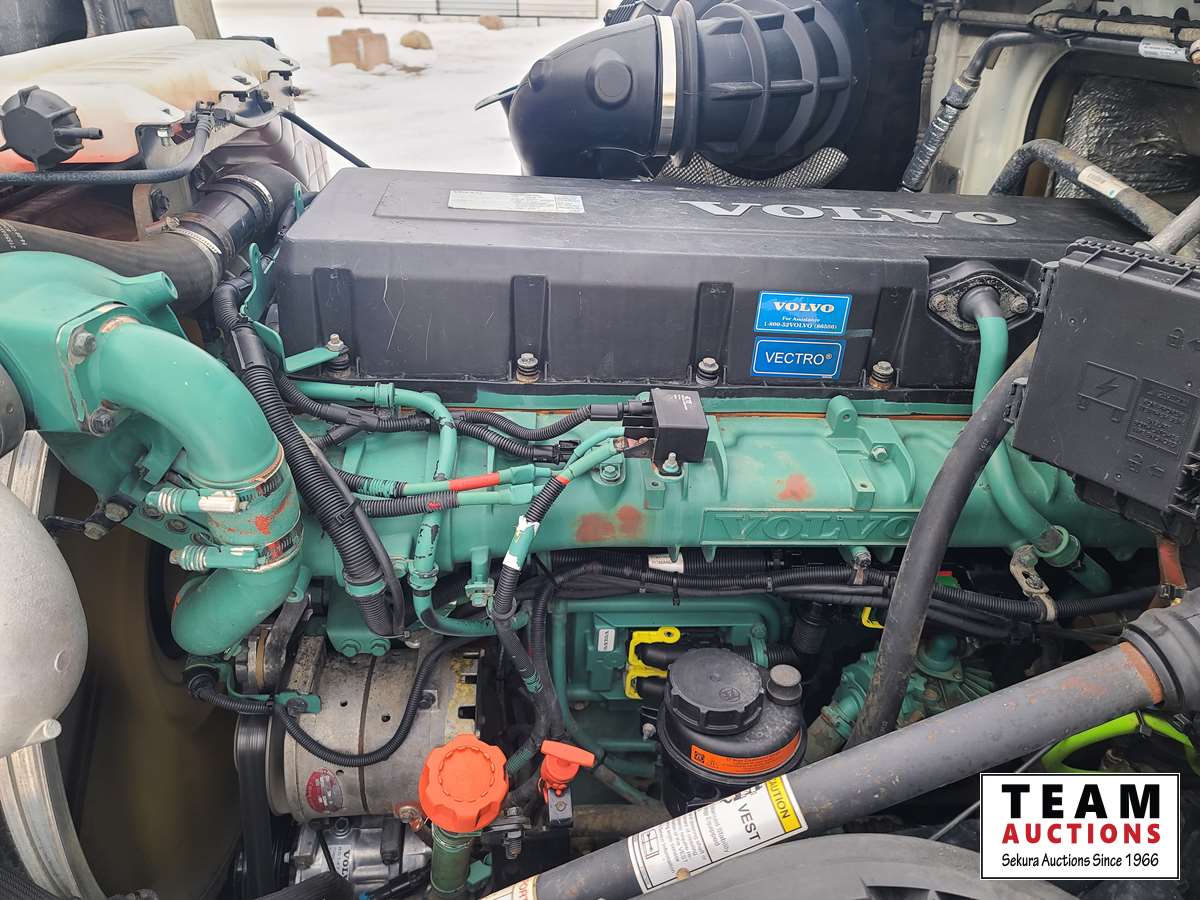 Volvo D16 16.1 L 550 HP deleted engine, Volvo auto-shift transmission, integral sleeper, air ride suspension, 13,200lb front axle, 46,000lb rears, full lockers, air sliding 5th wheel, Wabasto engine heater, 11R22.5 tires on aluminum rims