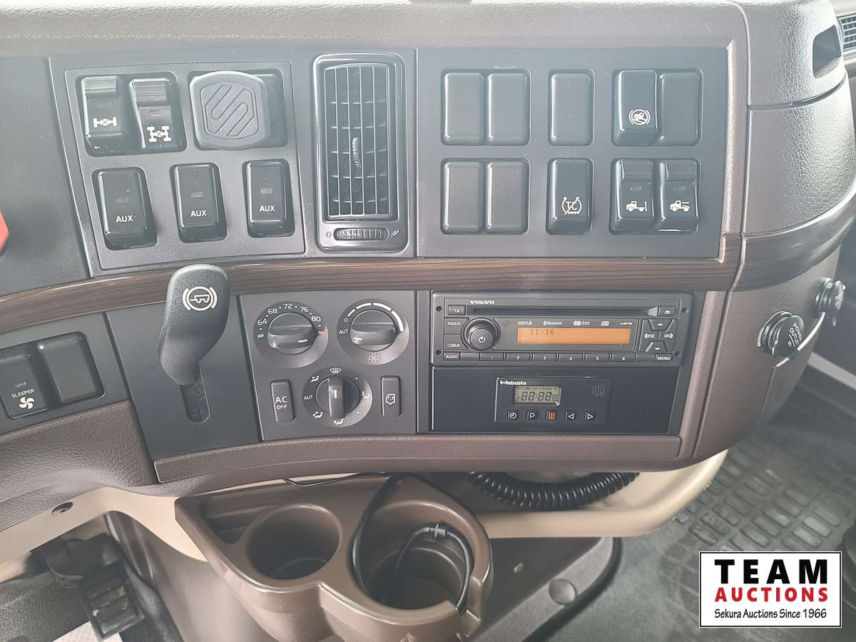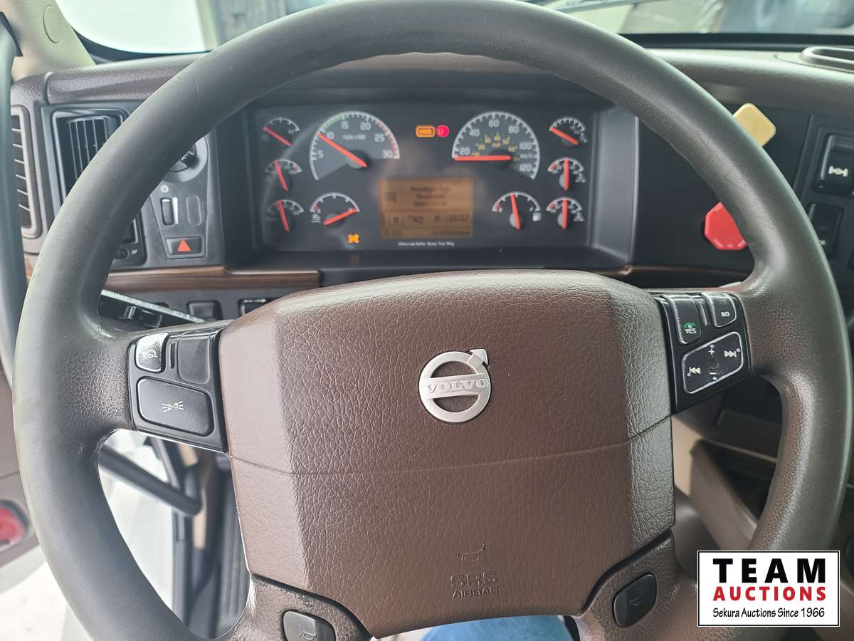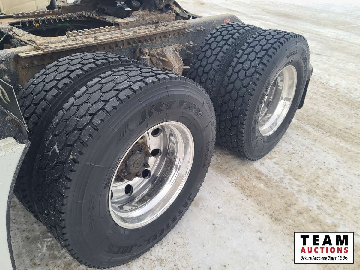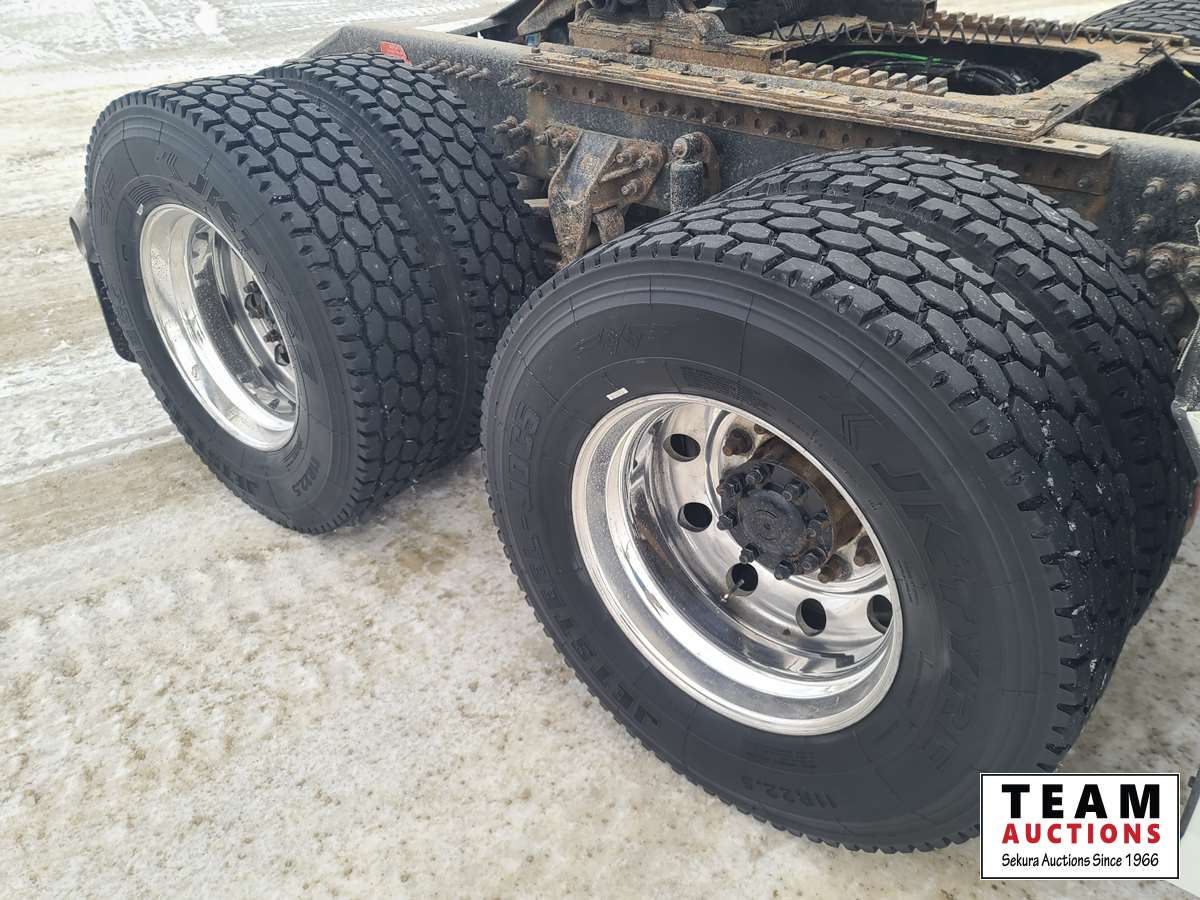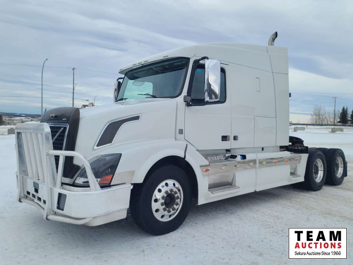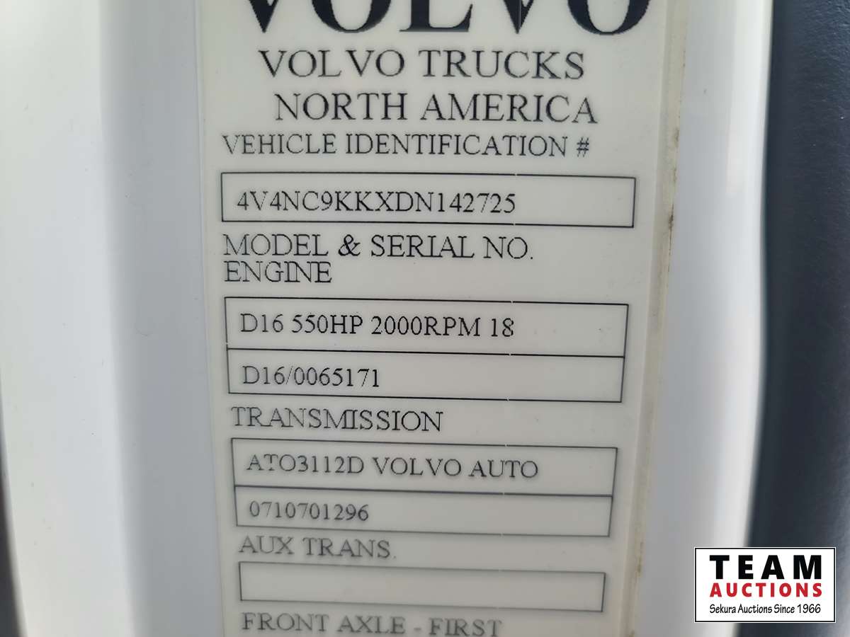 Volvo D16 16.1 L 550 HP deleted engine, Volvo auto-shift transmission, integral sleeper, air ride suspension, 13,200lb front axle, 46,000lb rears, full lockers, air sliding 5th wheel, Wabasto engine heater, 11R22.5 tires on aluminum rims
