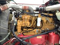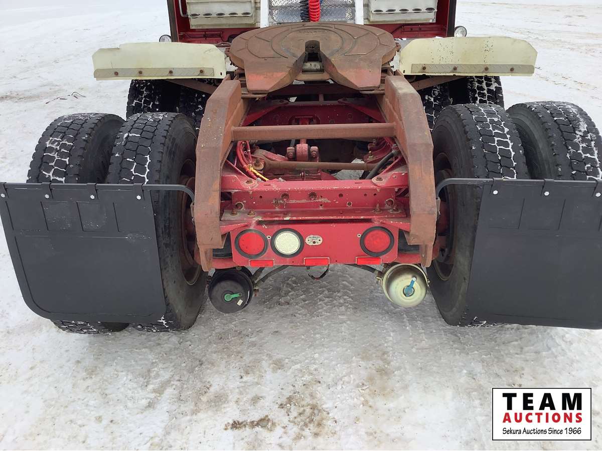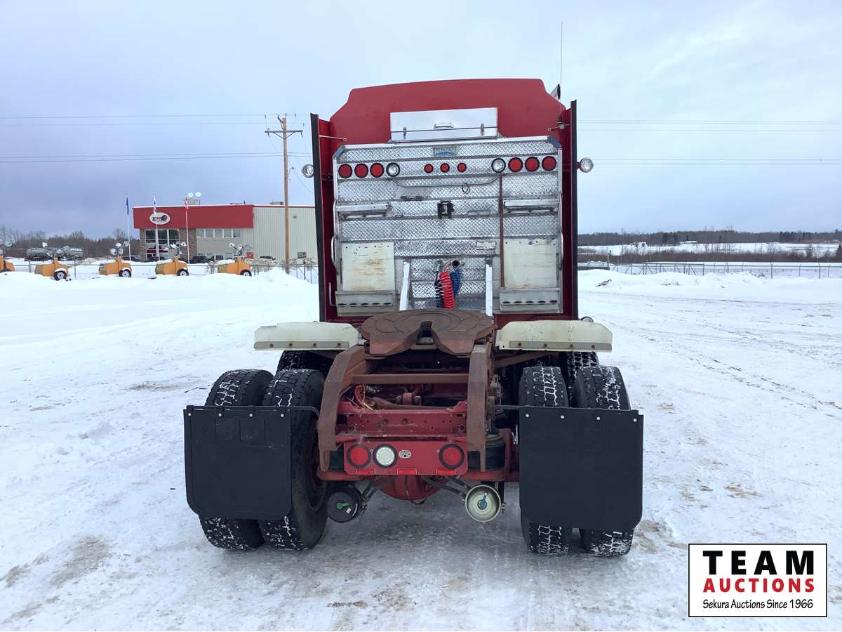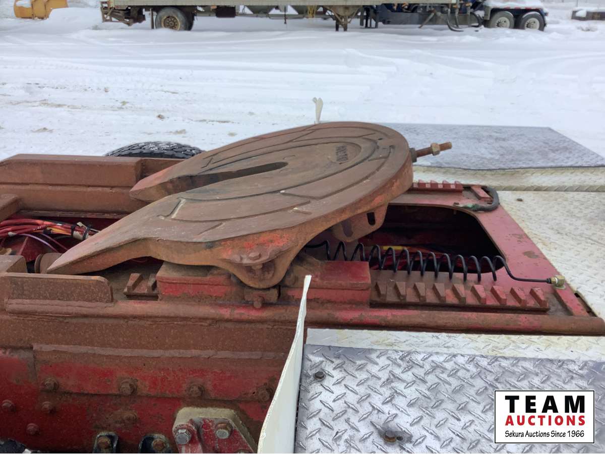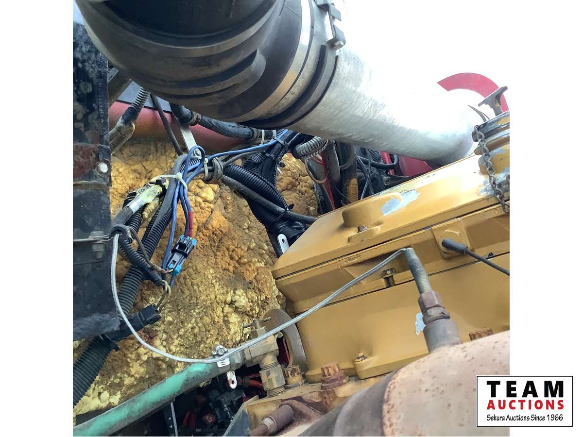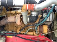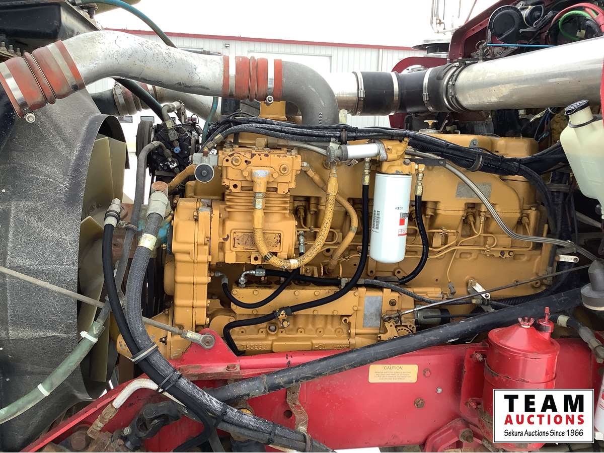 Caterpillar 3406C, 14.6 L 6 cylinder mechanical diesel engine, 3 stage Jacob engine brake, 18 speed transmission, removable mid rise sleeper, 12,000 lb front axle with air ride assist on spring suspension, 46000 lb rears with locking differential and air ride suspension, Magnum Ace headache rack, beacon lights, air sliding 5th wheel, lowbed ramps on rear of frame, set of wheel chains on hanger, all aluminum rims, 11R24.5