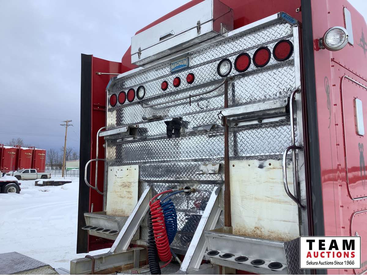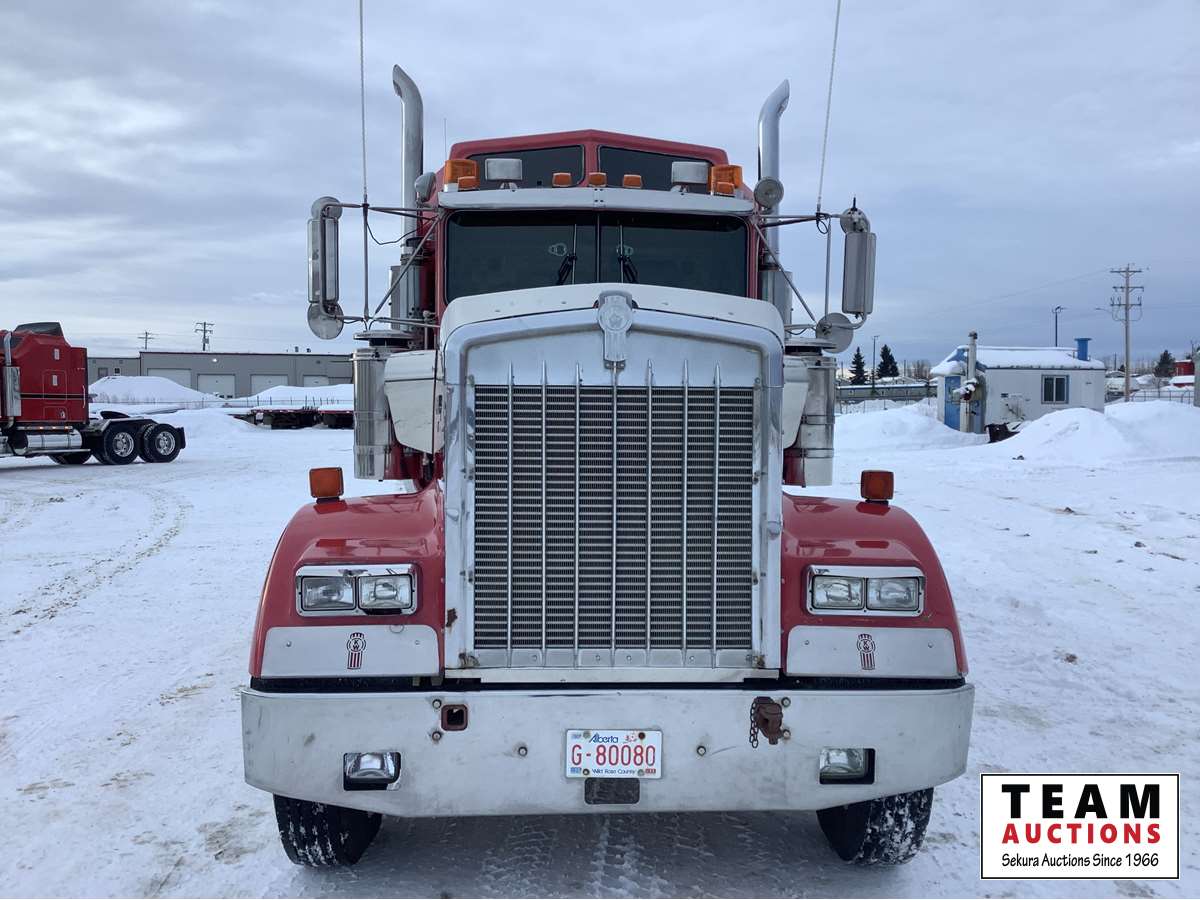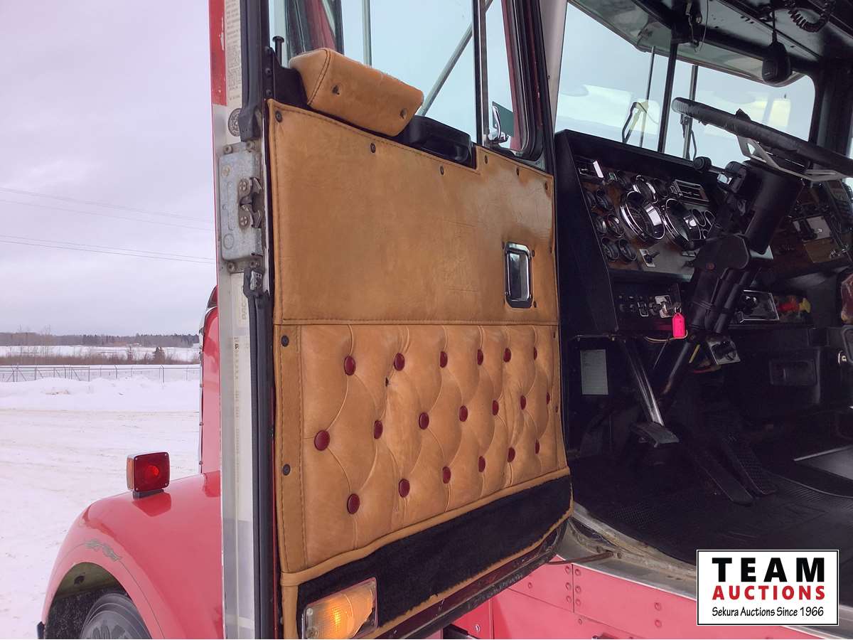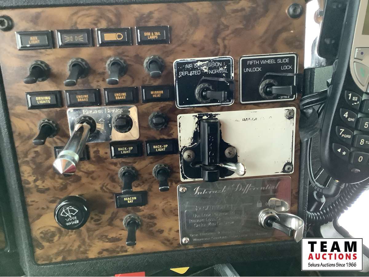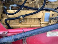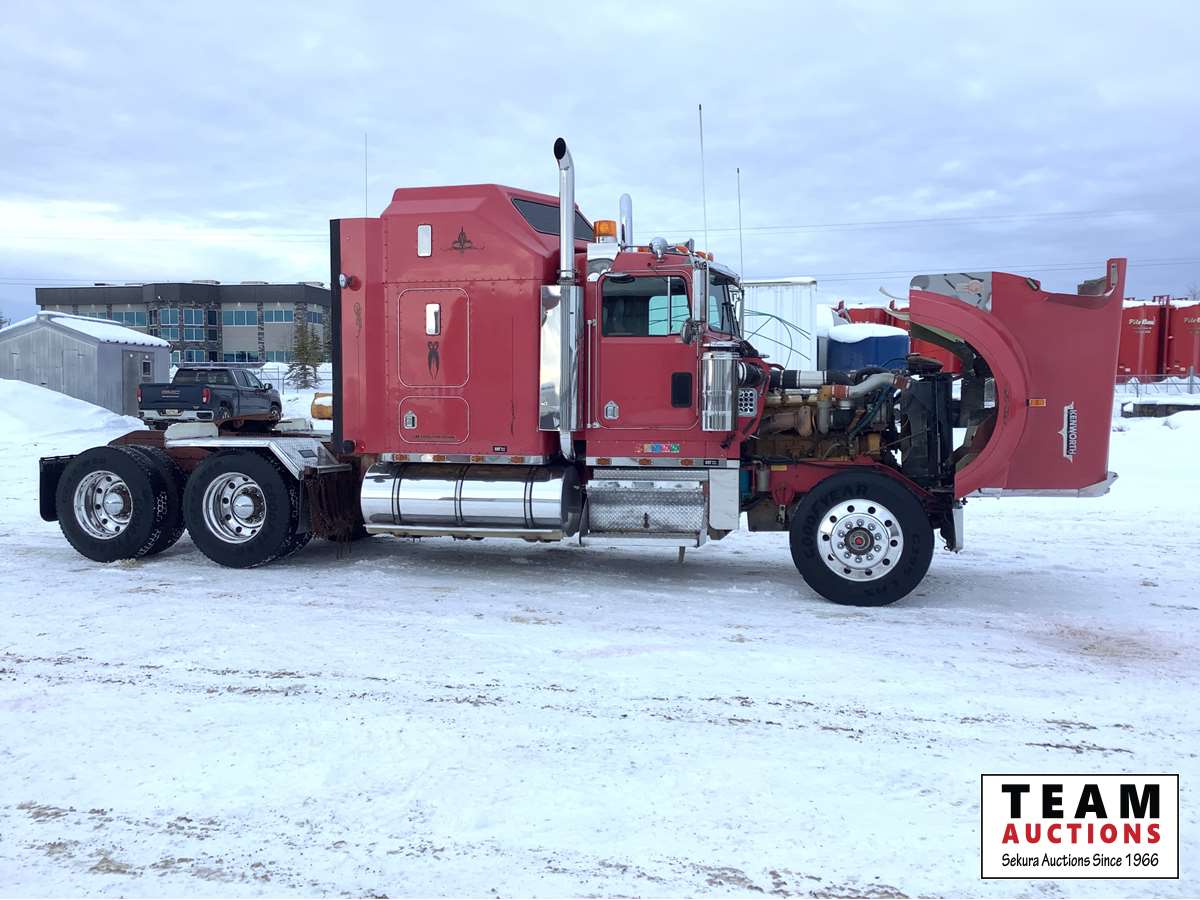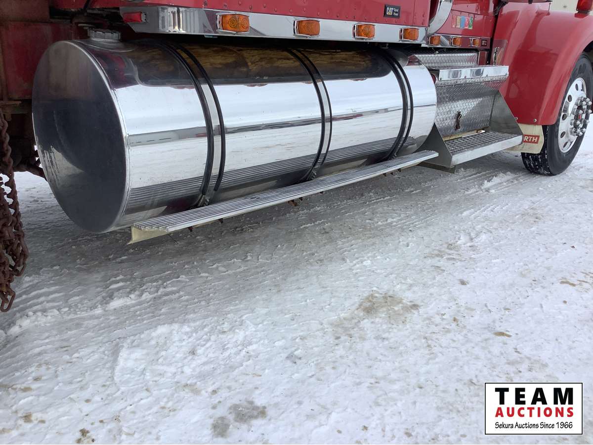 Caterpillar 3406C, 14.6 L 6 cylinder mechanical diesel engine, 3 stage Jacob engine brake, 18 speed transmission, removable mid rise sleeper, 12,000 lb front axle with air ride assist on spring suspension, 46000 lb rears with locking differential and air ride suspension, Magnum Ace headache rack, beacon lights, air sliding 5th wheel, lowbed ramps on rear of frame, set of wheel chains on hanger, all aluminum rims, 11R24.5