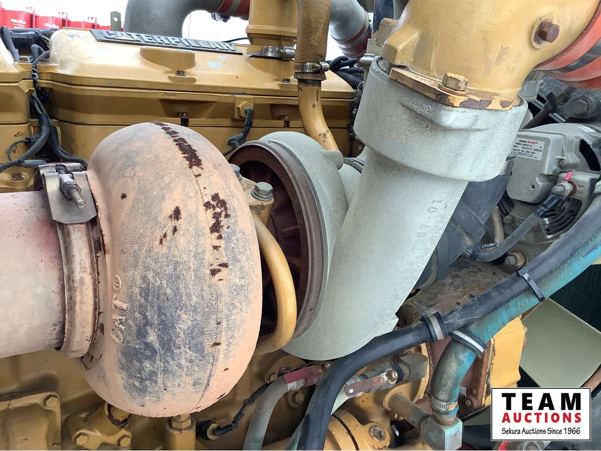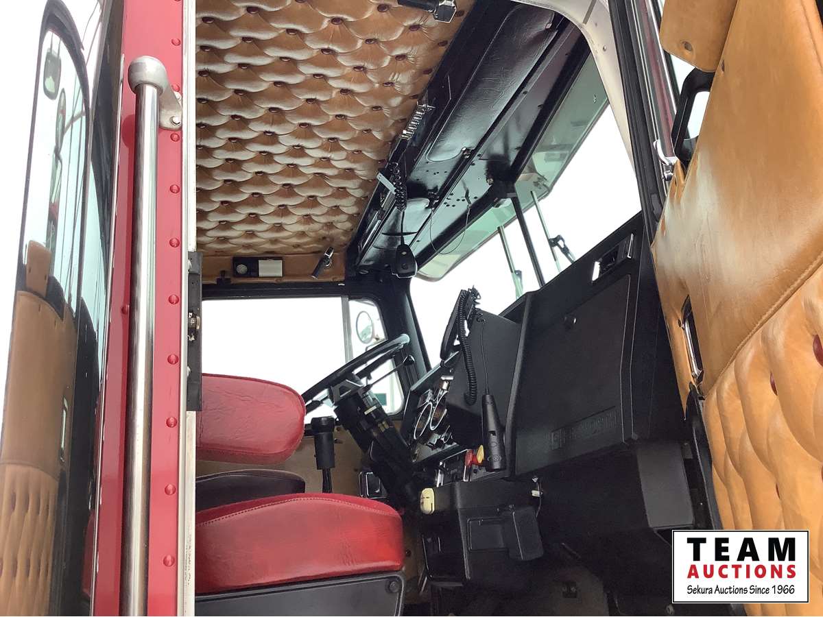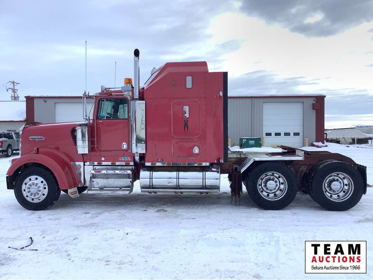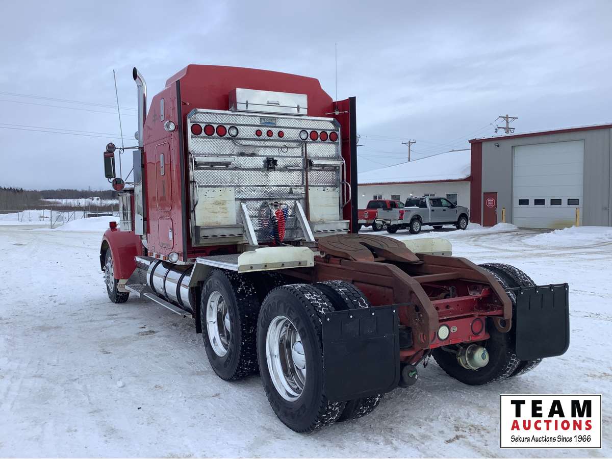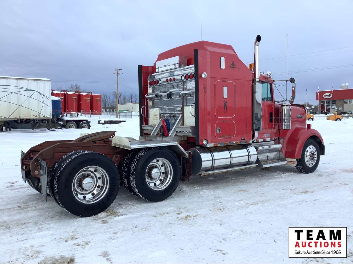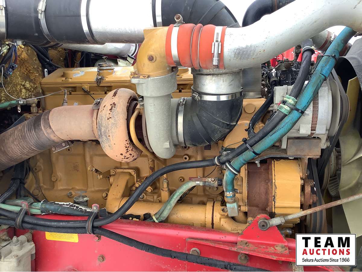 Caterpillar 3406C, 14.6 L 6 cylinder mechanical diesel engine, 3 stage Jacob engine brake, 18 speed transmission, removable mid rise sleeper, 12,000 lb front axle with air ride assist on spring suspension, 46000 lb rears with locking differential and air ride suspension, Magnum Ace headache rack, beacon lights, air sliding 5th wheel, lowbed ramps on rear of frame, set of wheel chains on hanger, all aluminum rims, 11R24.5