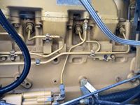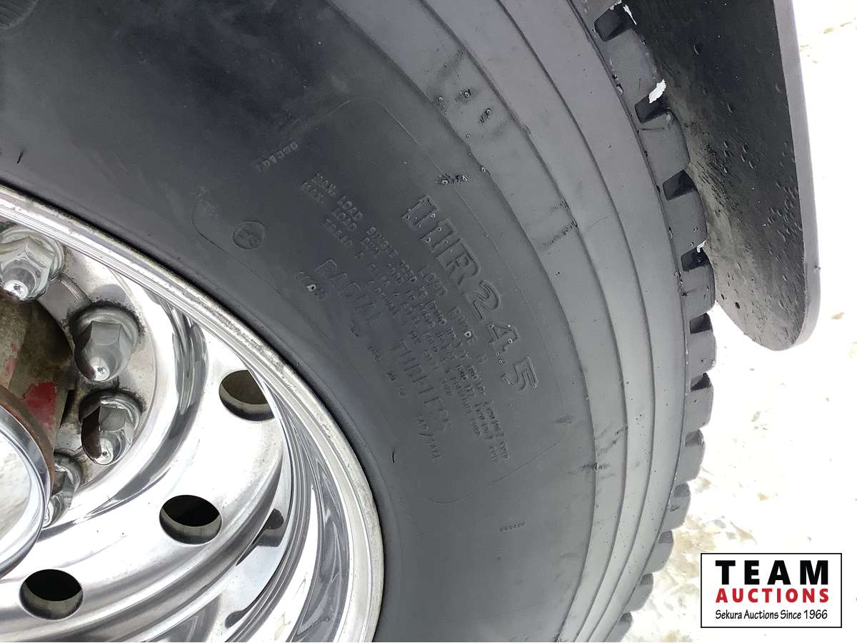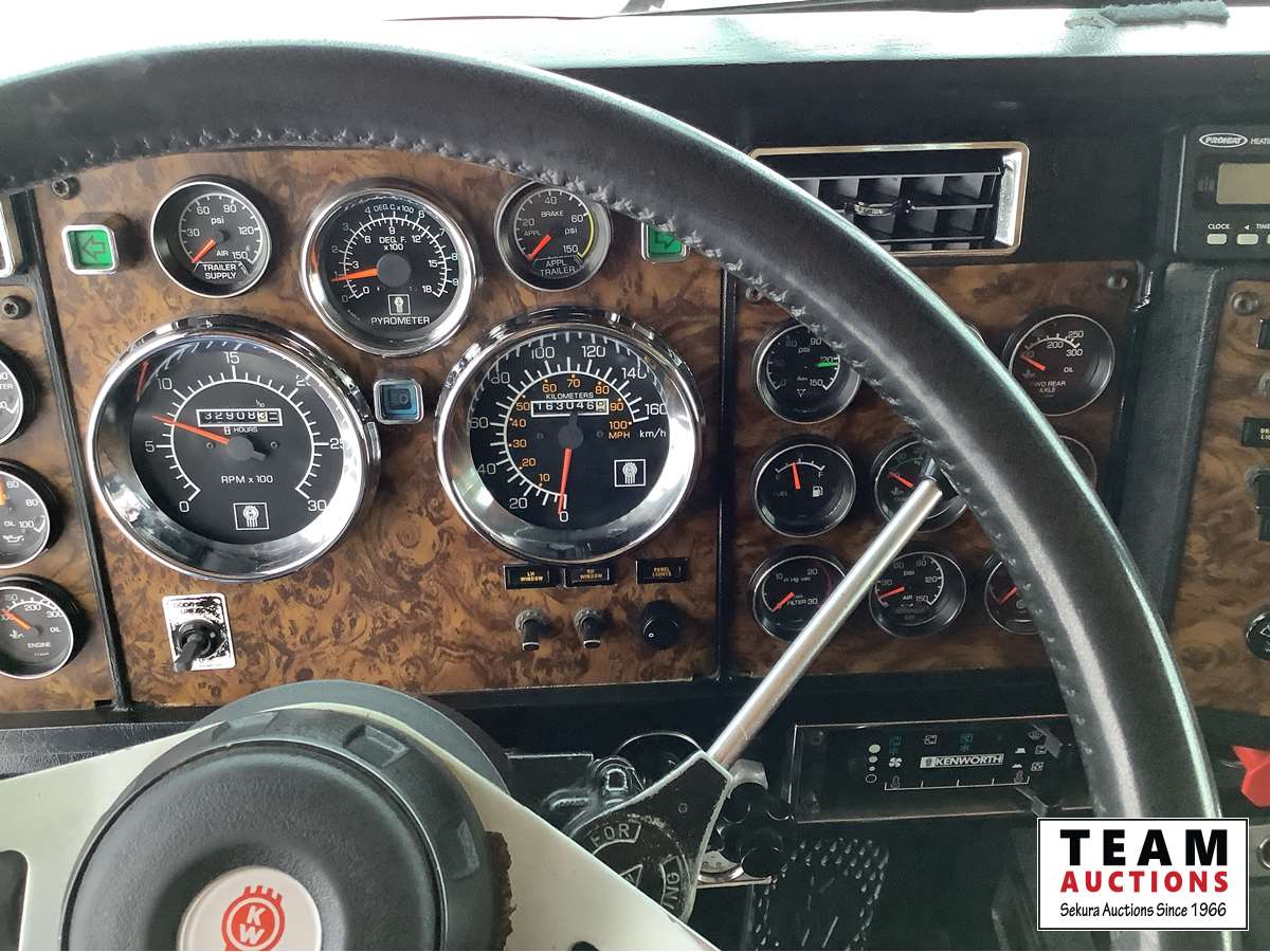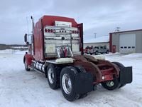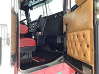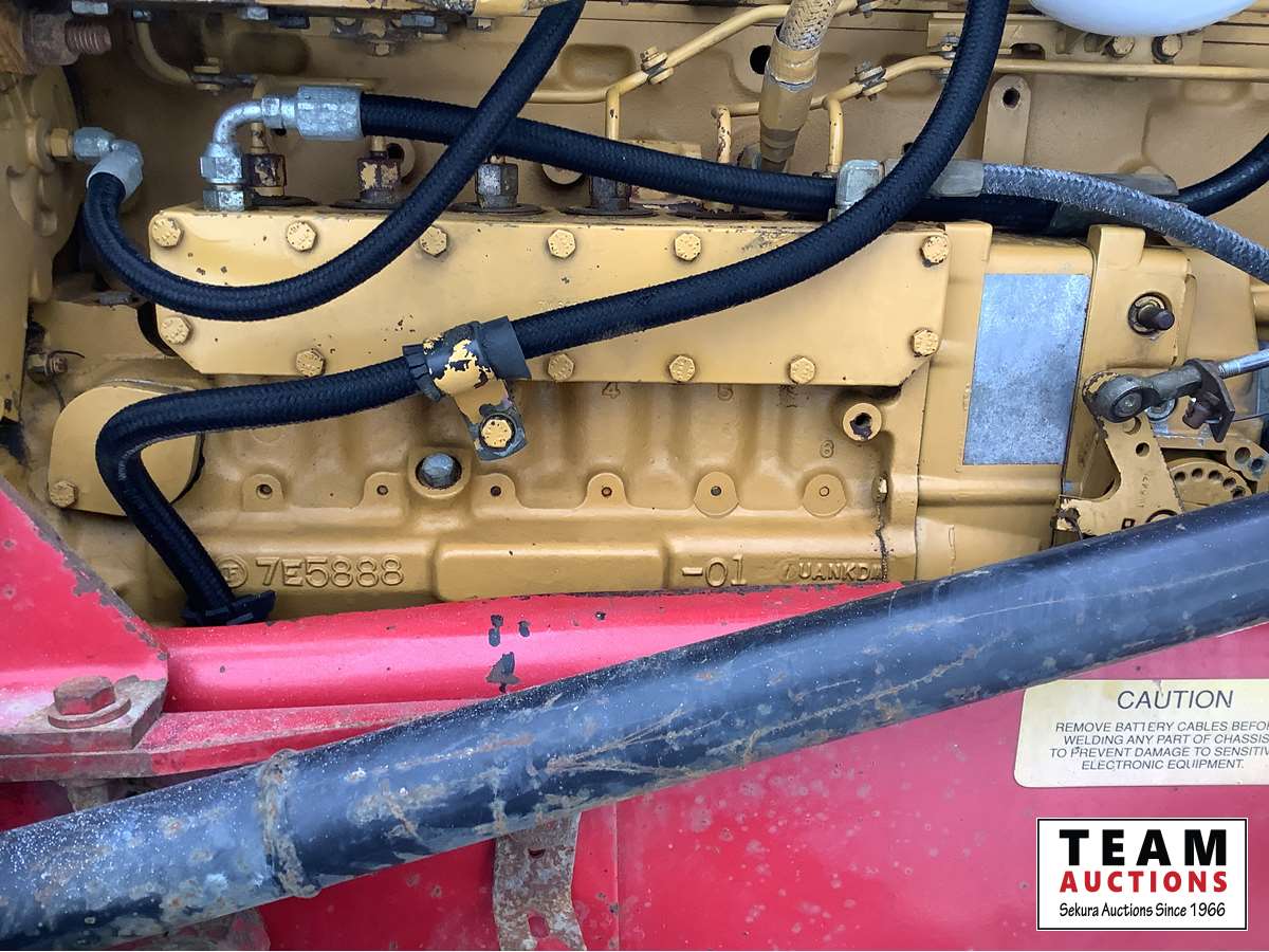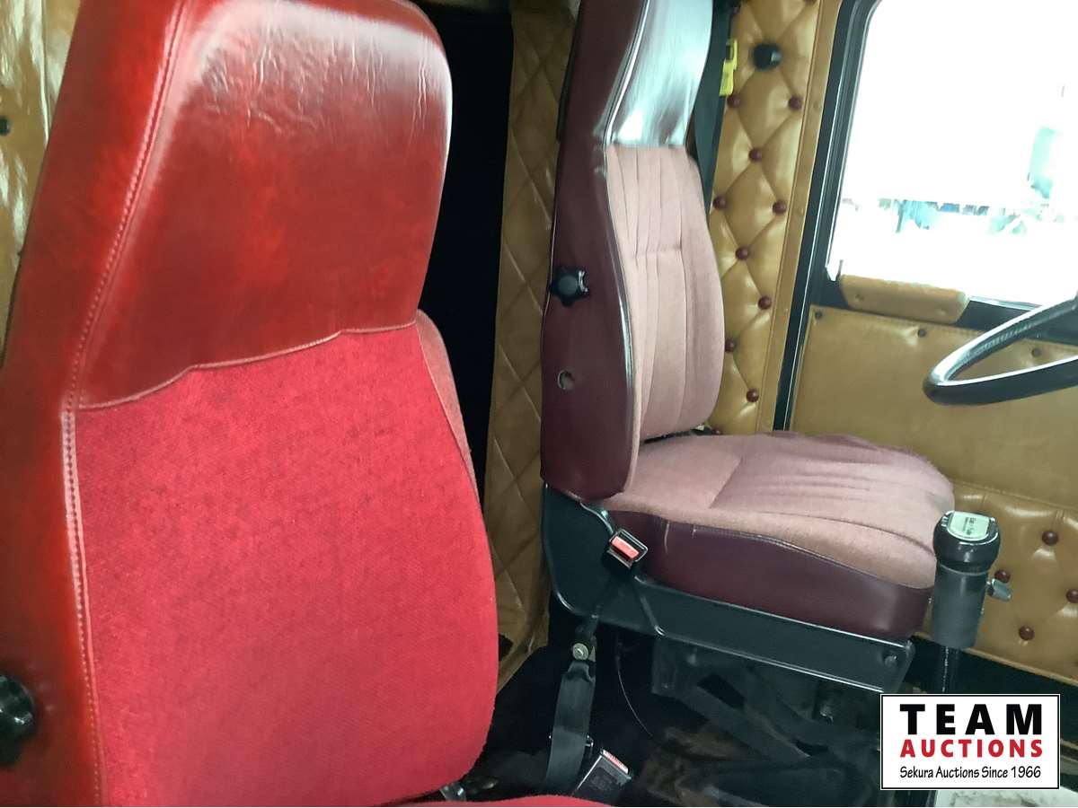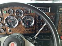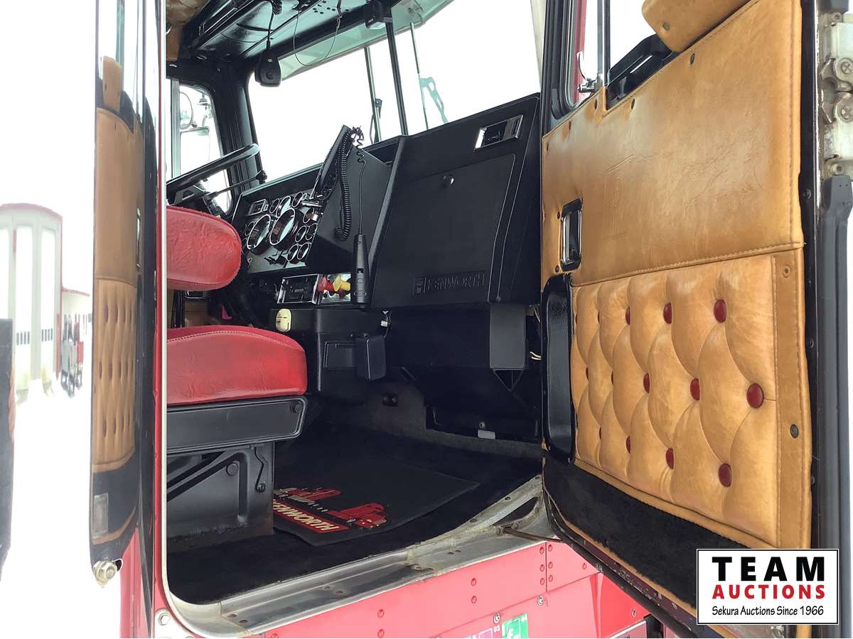 Caterpillar 3406C, 14.6 L 6 cylinder mechanical diesel engine, 3 stage Jacob engine brake, 18 speed transmission, removable mid rise sleeper, 12,000 lb front axle with air ride assist on spring suspension, 46000 lb rears with locking differential and air ride suspension, Magnum Ace headache rack, beacon lights, air sliding 5th wheel, lowbed ramps on rear of frame, set of wheel chains on hanger, all aluminum rims, 11R24.5