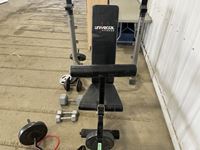 1232 Assorted Weights, Squat Rack Leg and Bicep Curl Machine.