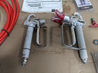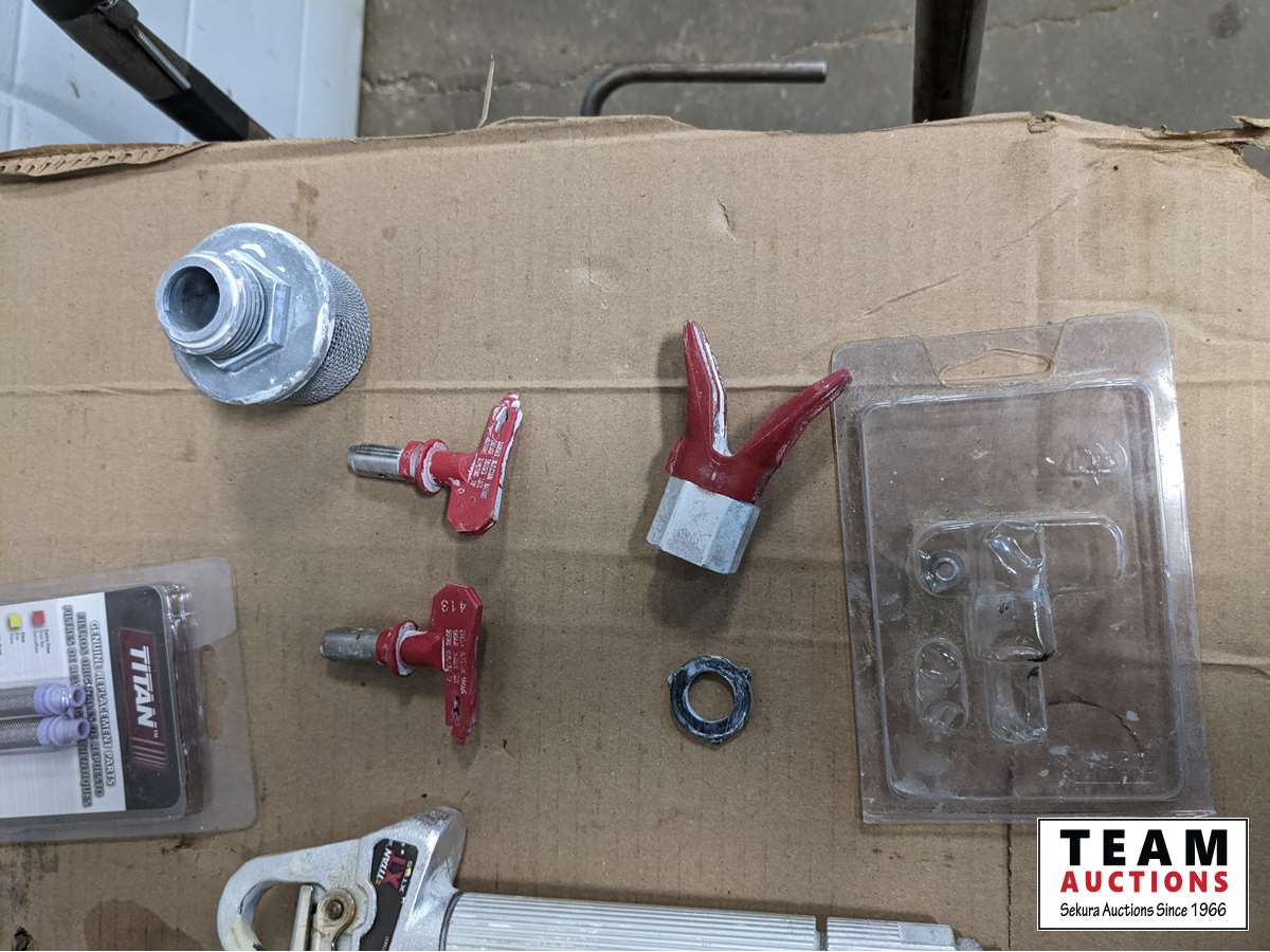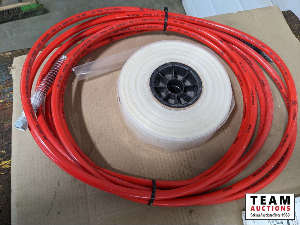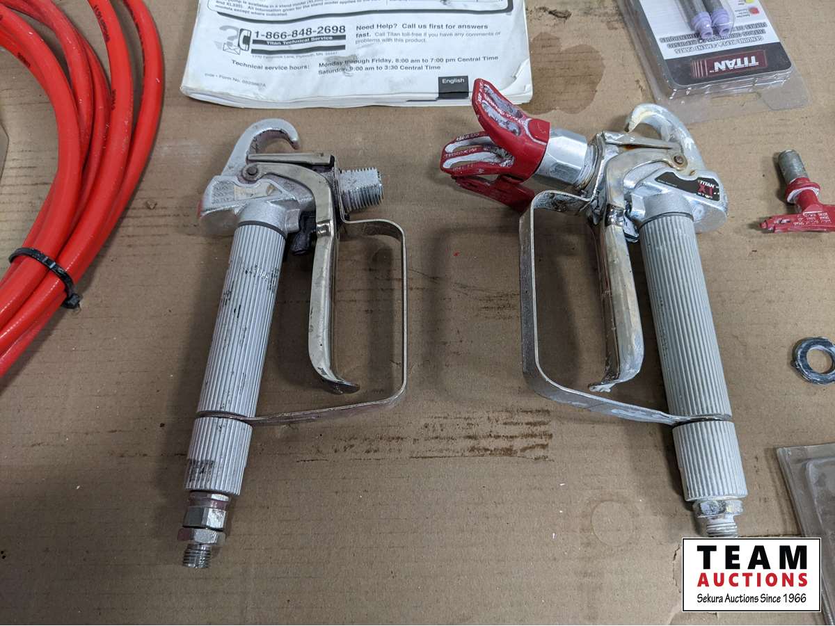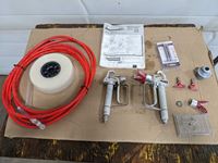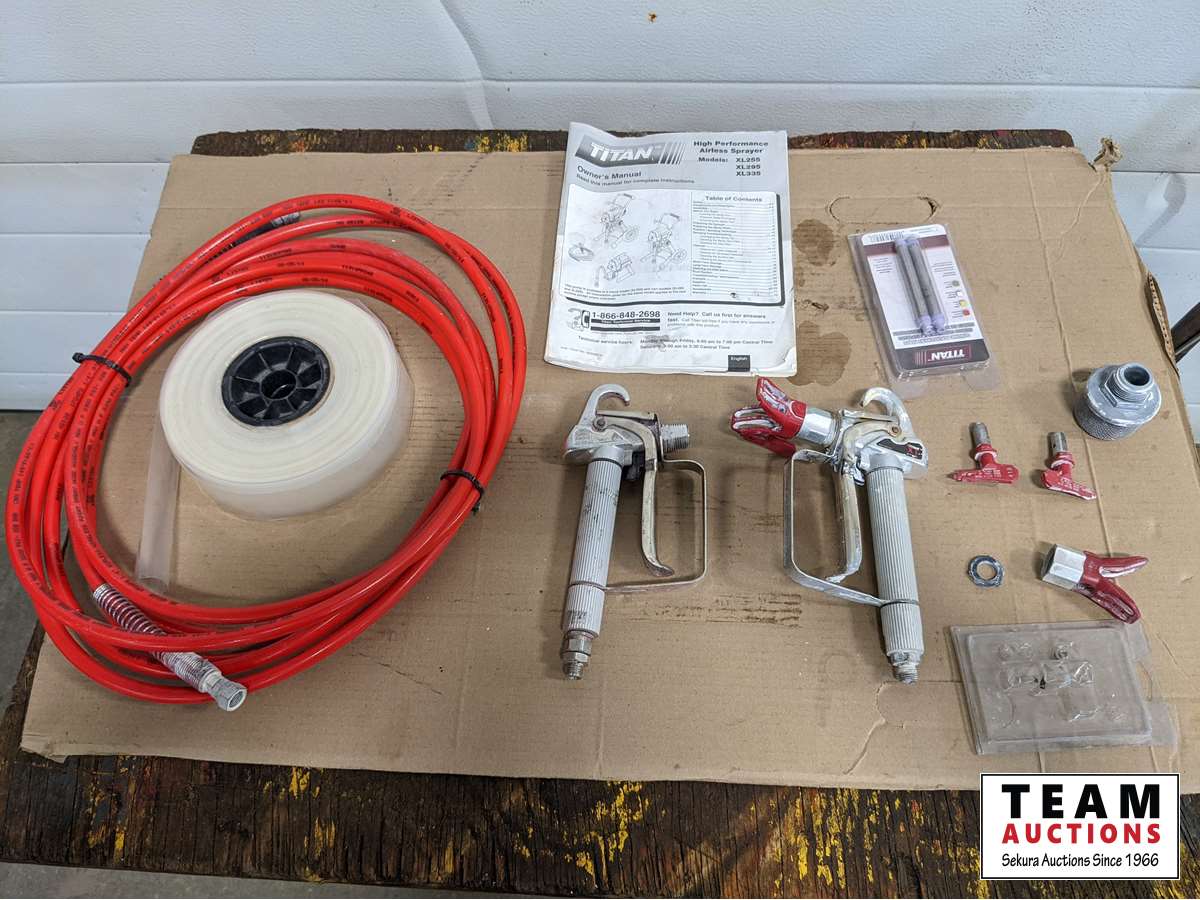 (2) sprayer guns, extra tips, (2) paint hoses, (2) rolls of poly hose cover, manual, extra screens