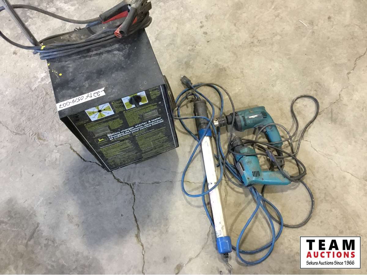 1475 John Deere Battery Charger/Booster, Makita Corded Drill and Shop Light