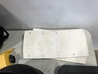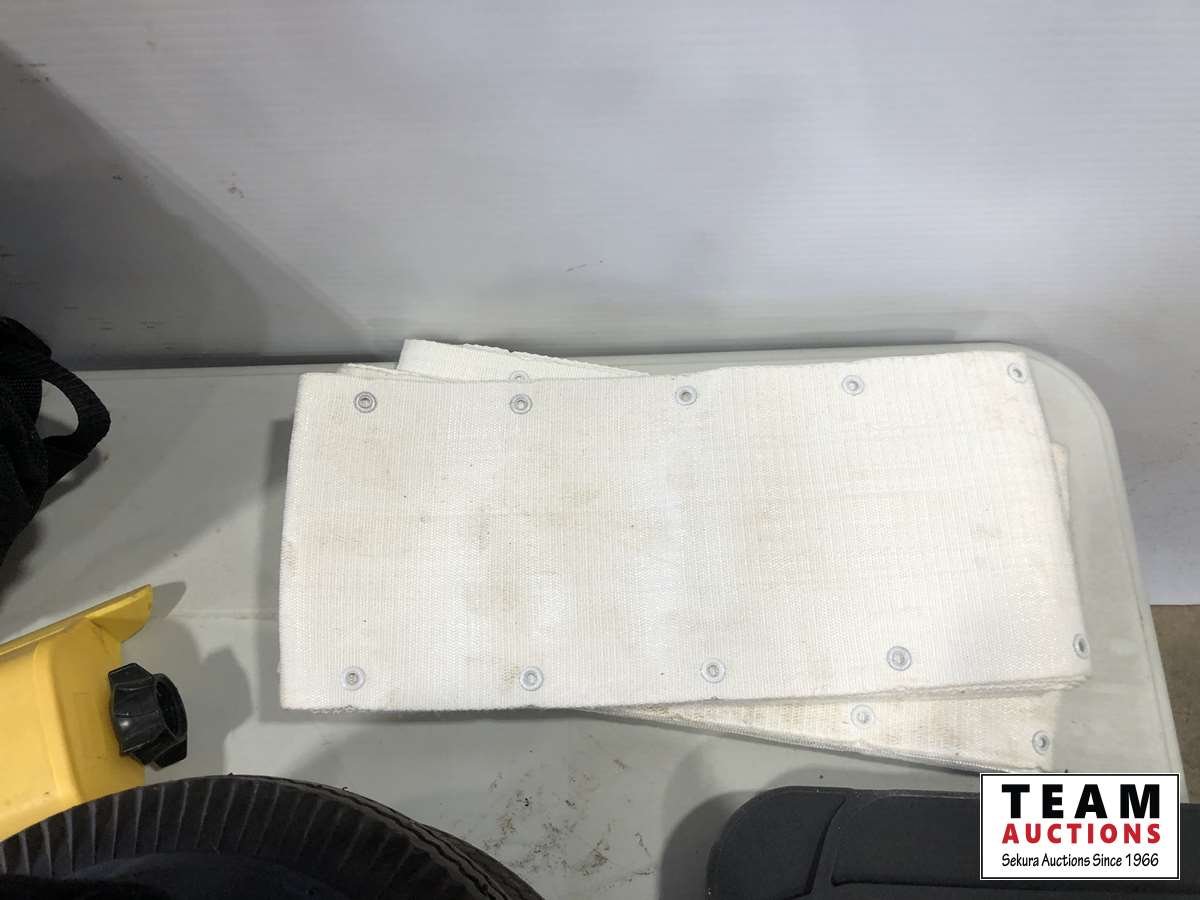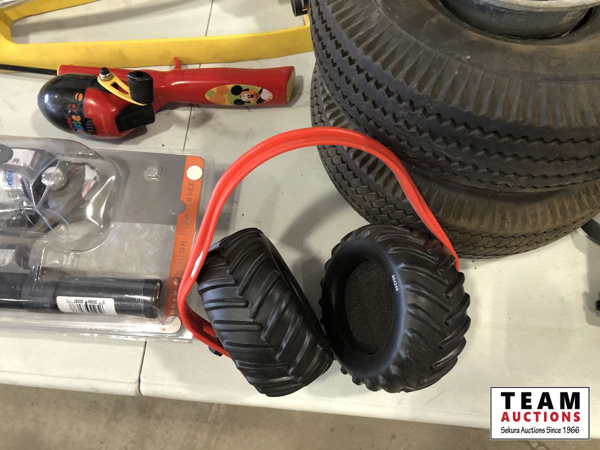 Helmet, fishing rods, floor mats, sprinkler, ear muff, wheel barrow 10 inch tires