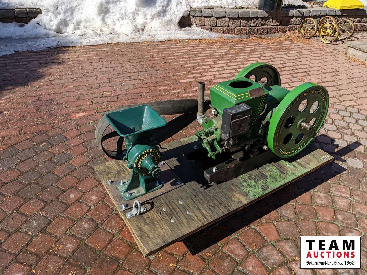 Single cylinder water cooled engine, with stover grinder, on 1 inch treated plywood cart with casters