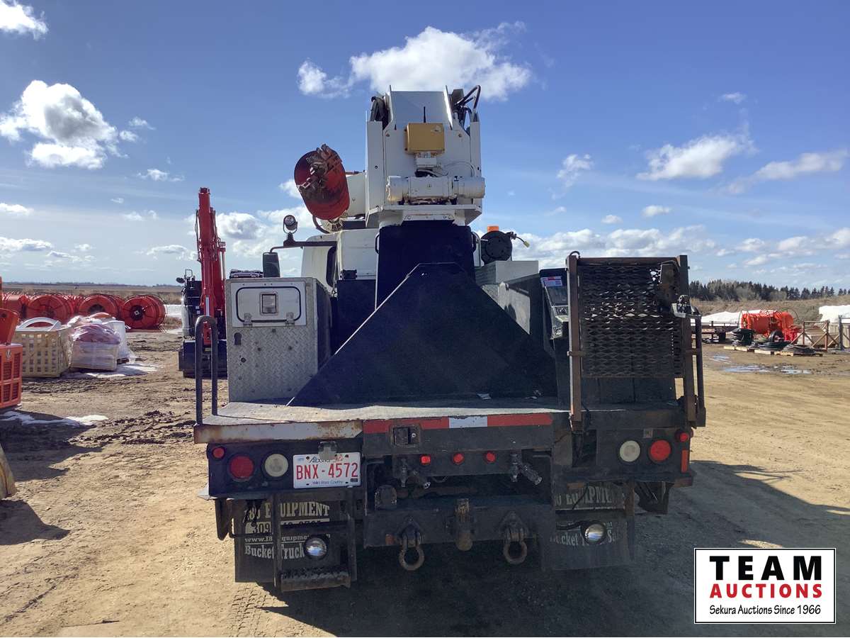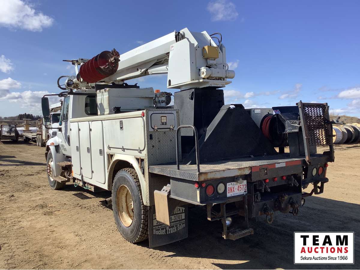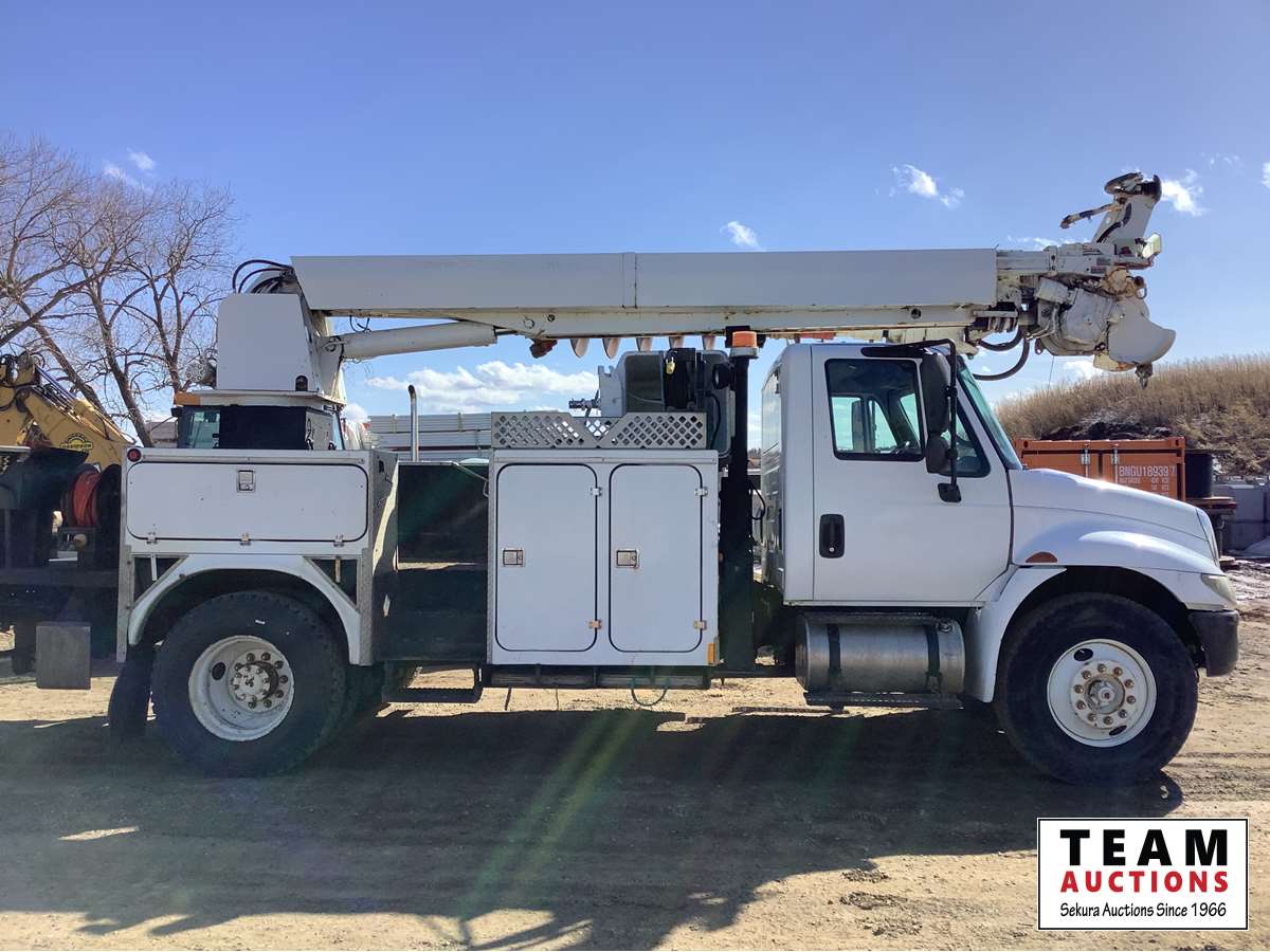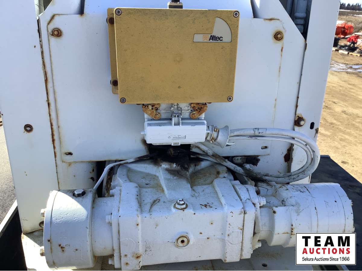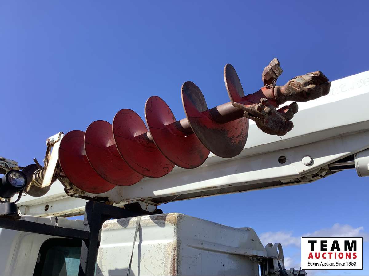 DT530 engine, Allison automatic transmission, air brakes, 12,000 front axle, 21,000 rear axle with differential lock, set up to tow air or electric brake trailers, Altec model D842 ART bucket and auger system with rear stabilizing arms, one auger with unit, new rear 11R22.5