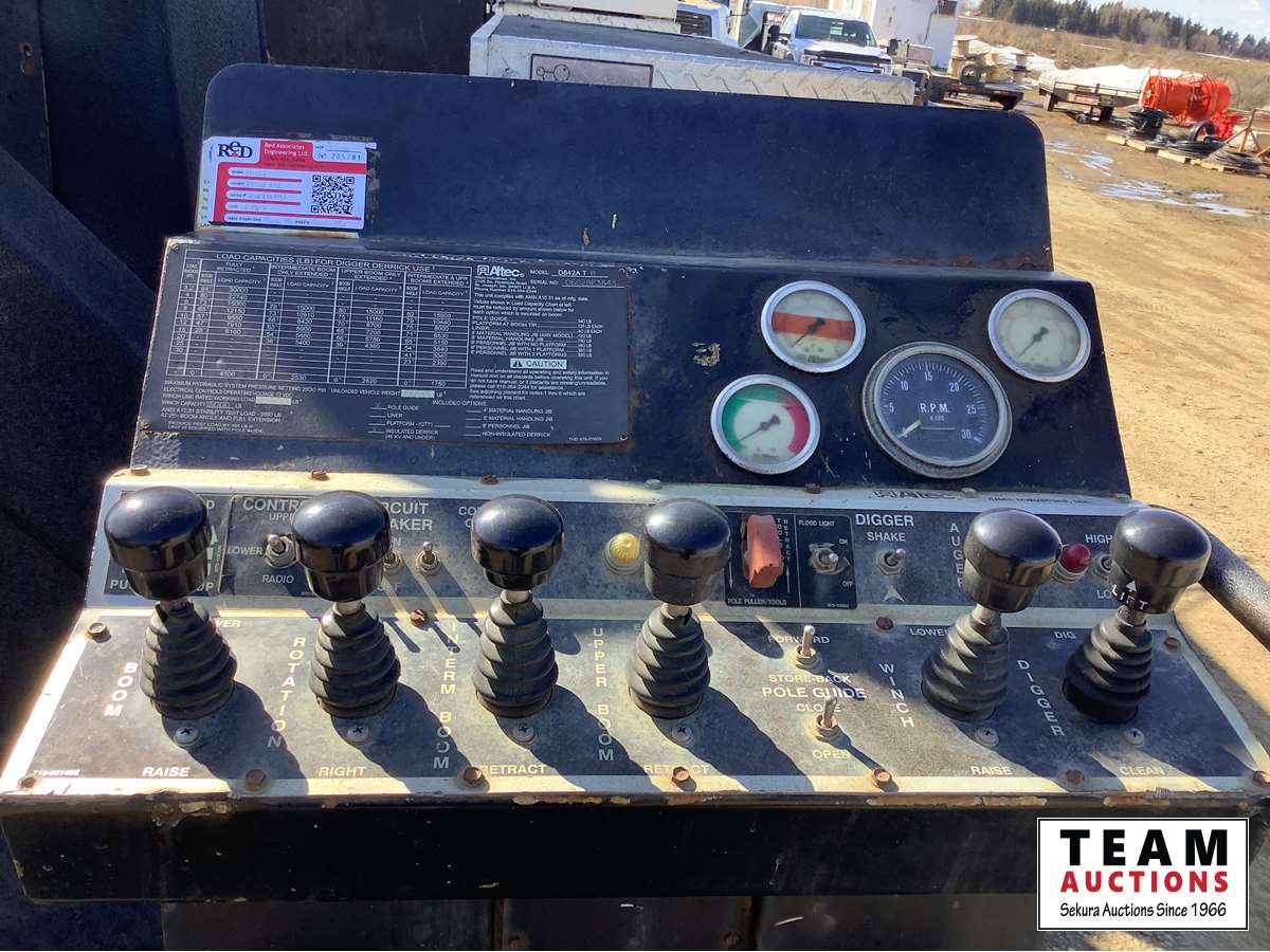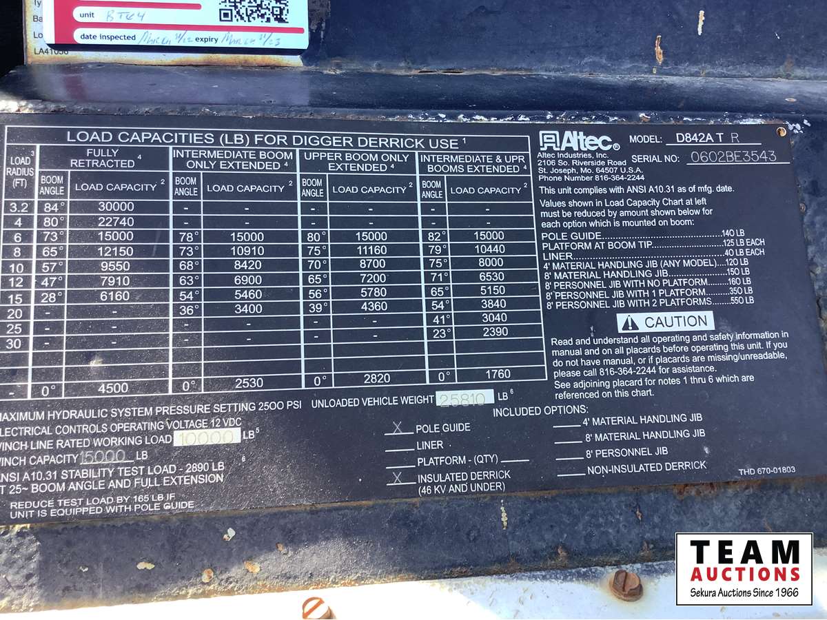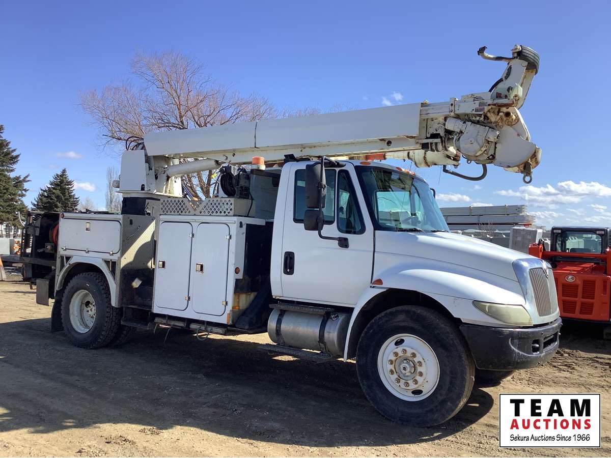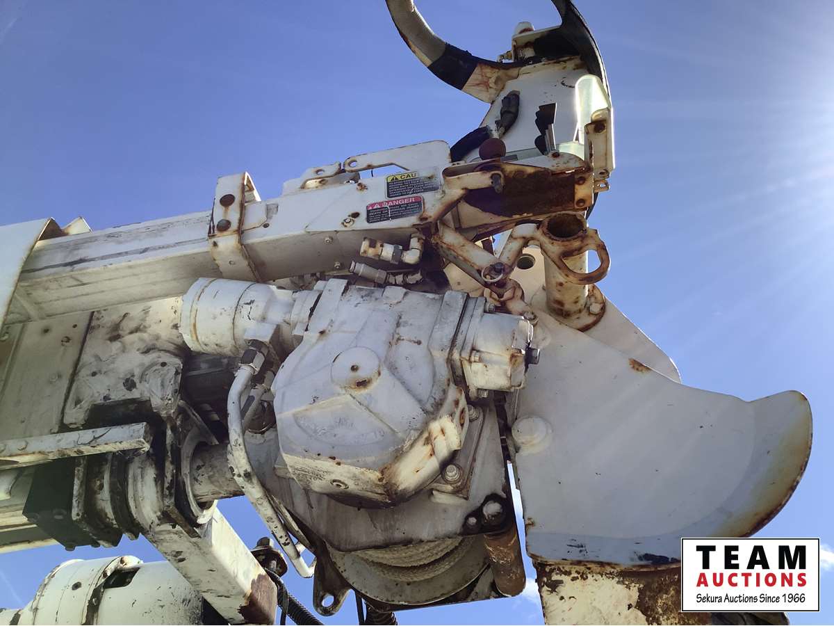 DT530 engine, Allison automatic transmission, air brakes, 12,000 front axle, 21,000 rear axle with differential lock, set up to tow air or electric brake trailers, Altec model D842 ART bucket and auger system with rear stabilizing arms, one auger with unit, new rear 11R22.5