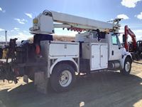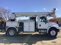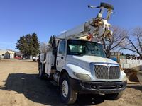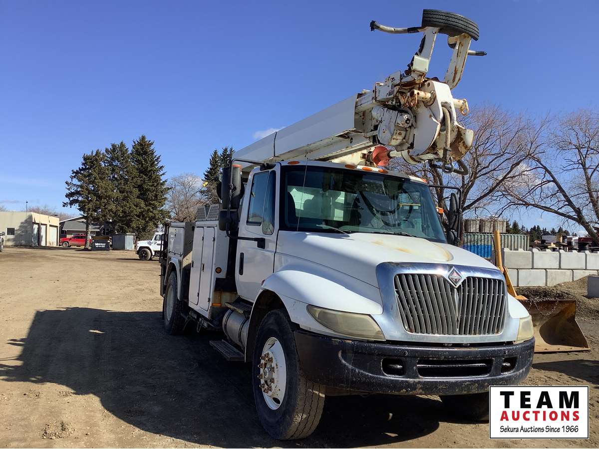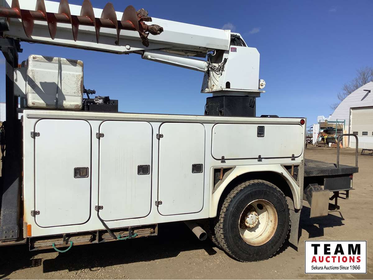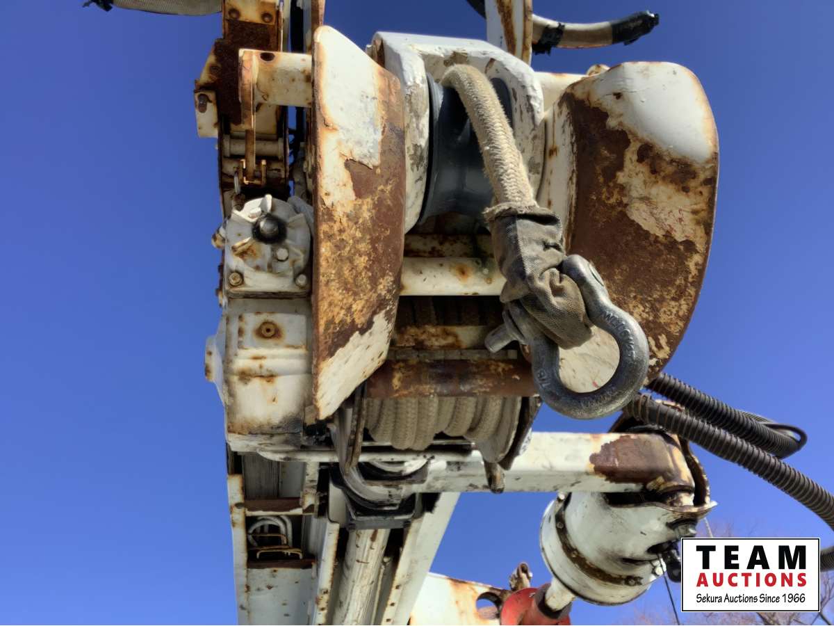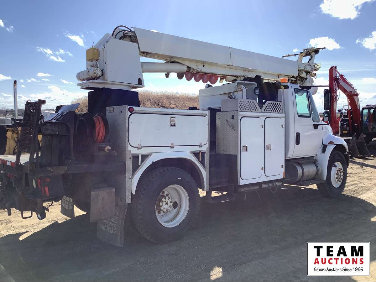 DT530 engine, Allison automatic transmission, air brakes, 12,000 front axle, 21,000 rear axle with differential lock, set up to tow air or electric brake trailers, Altec model D842 ART bucket and auger system with rear stabilizing arms, one auger with unit, new rear 11R22.5