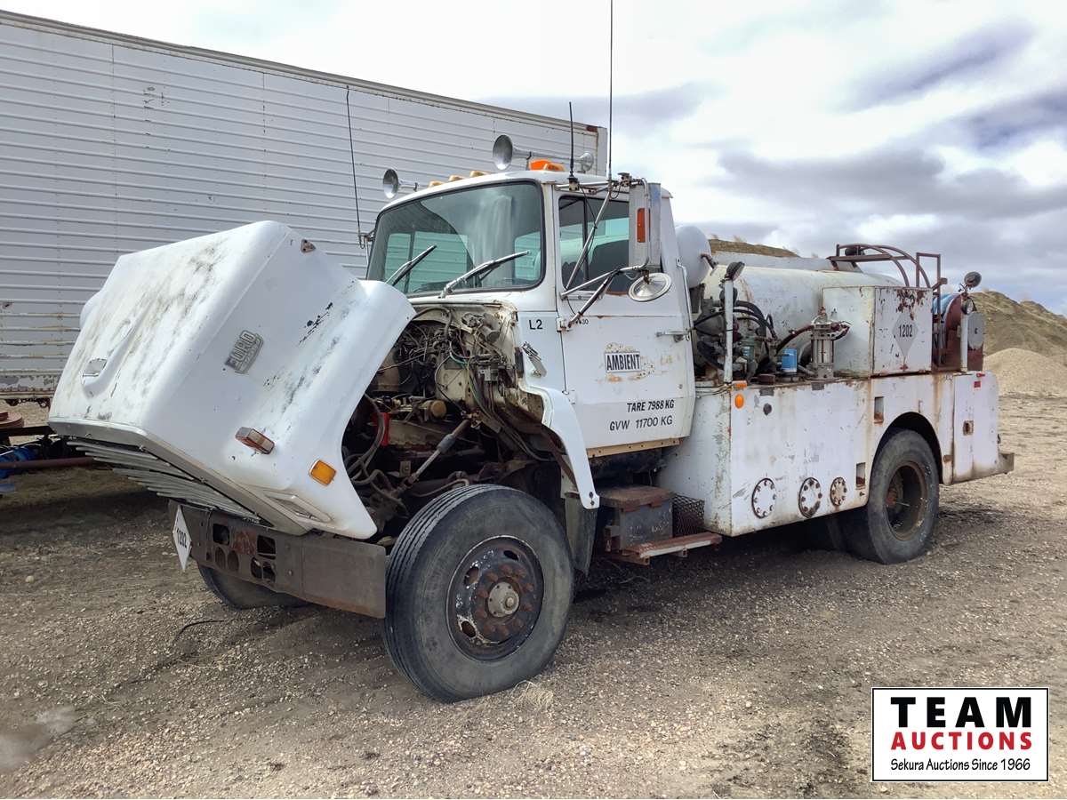 Caterpillar 3208, 10 speed transmission, air brakes, has a steel fuel storage tank with pump and hose real, has a rear mounted air greaser with one line hooked to the pump, PTO drive twin cylinder air compressor,air tank, 10x20