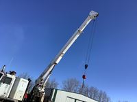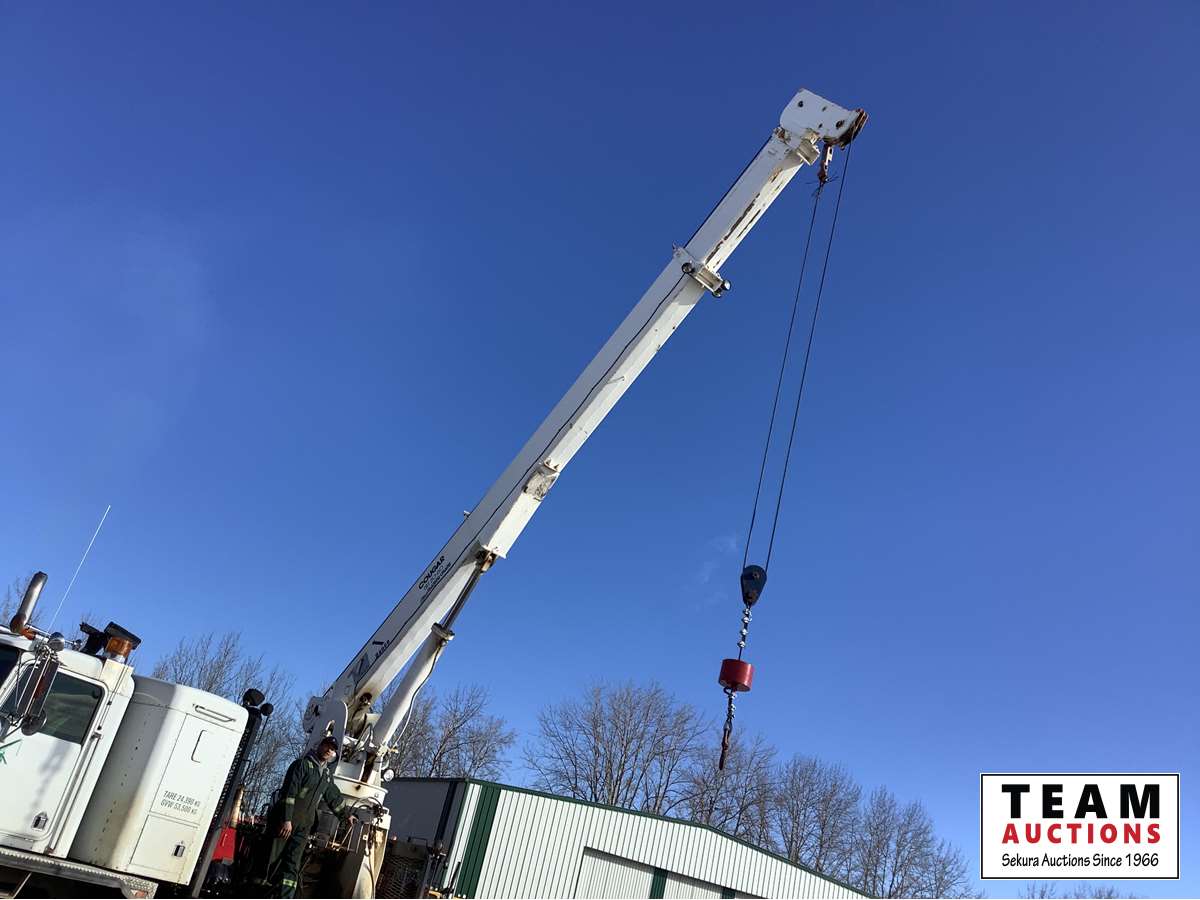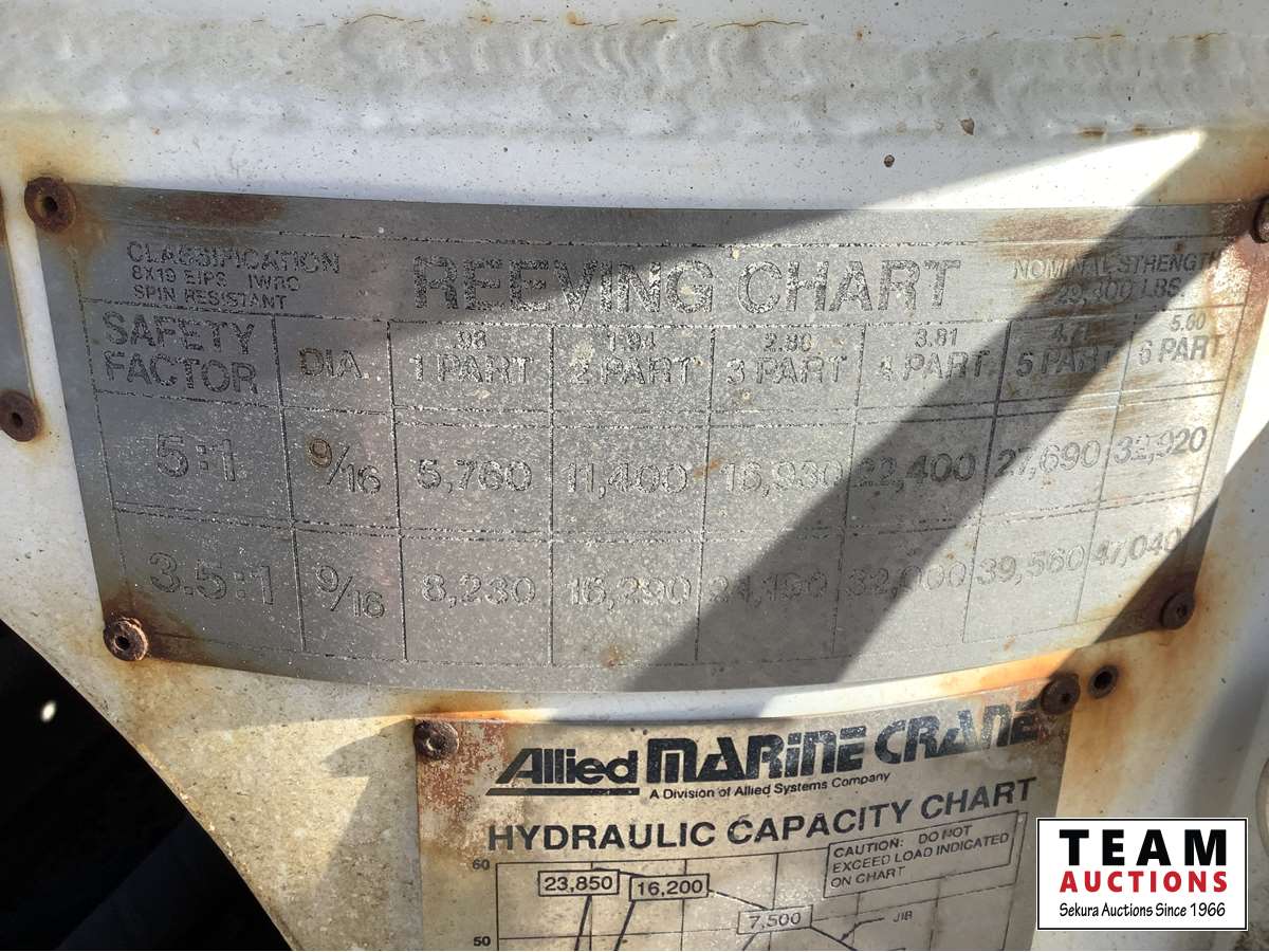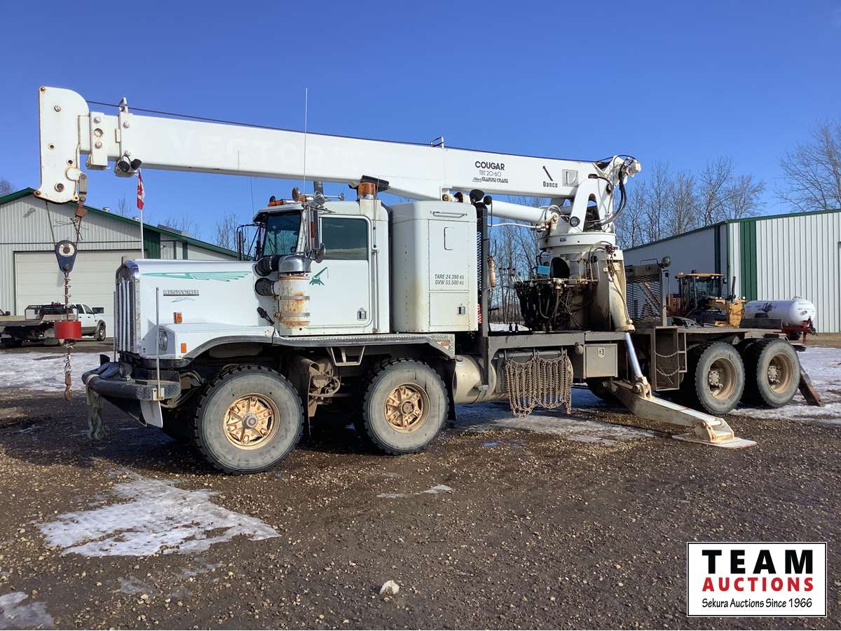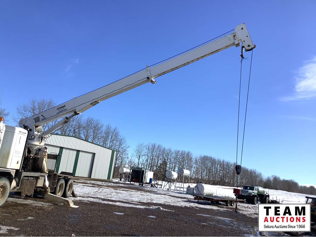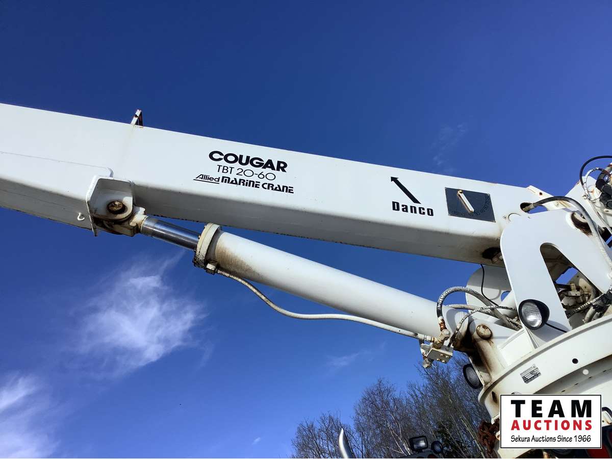 Cummins NTC big cam, Eaton Fuller 18 speed transmission, 36 inch flat top removable sleeper, air sliding 5th wheel, solid rubber block suspension, 445/65R22.5 front, 11R24.5 rear, Allied TBT 20 Ton crane, 60 ft boom, rear and center stabilization legs