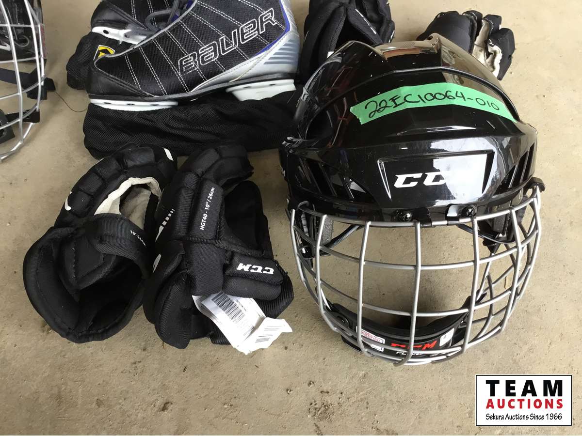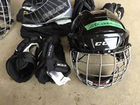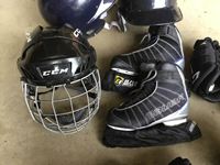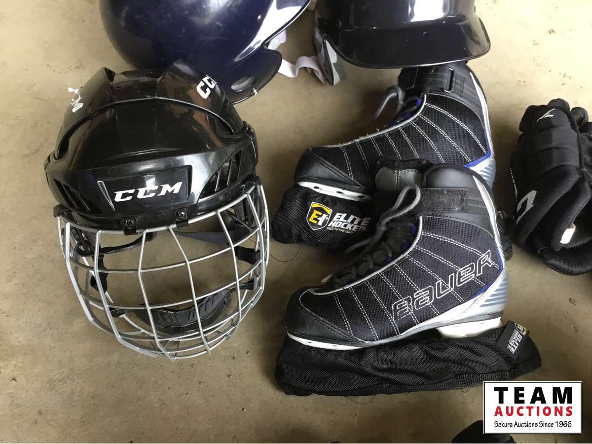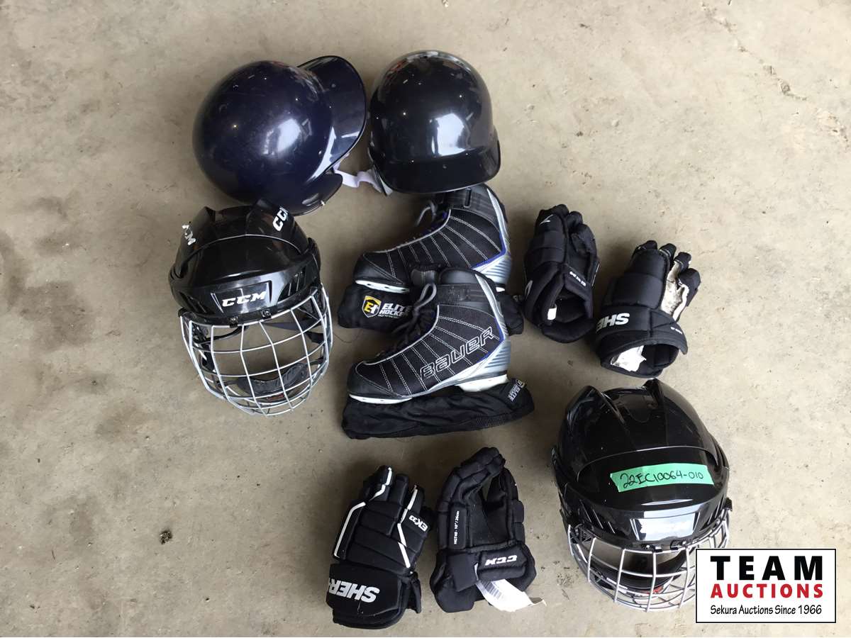 Youth skates, (2) hockey helmets, (2) pair gloves