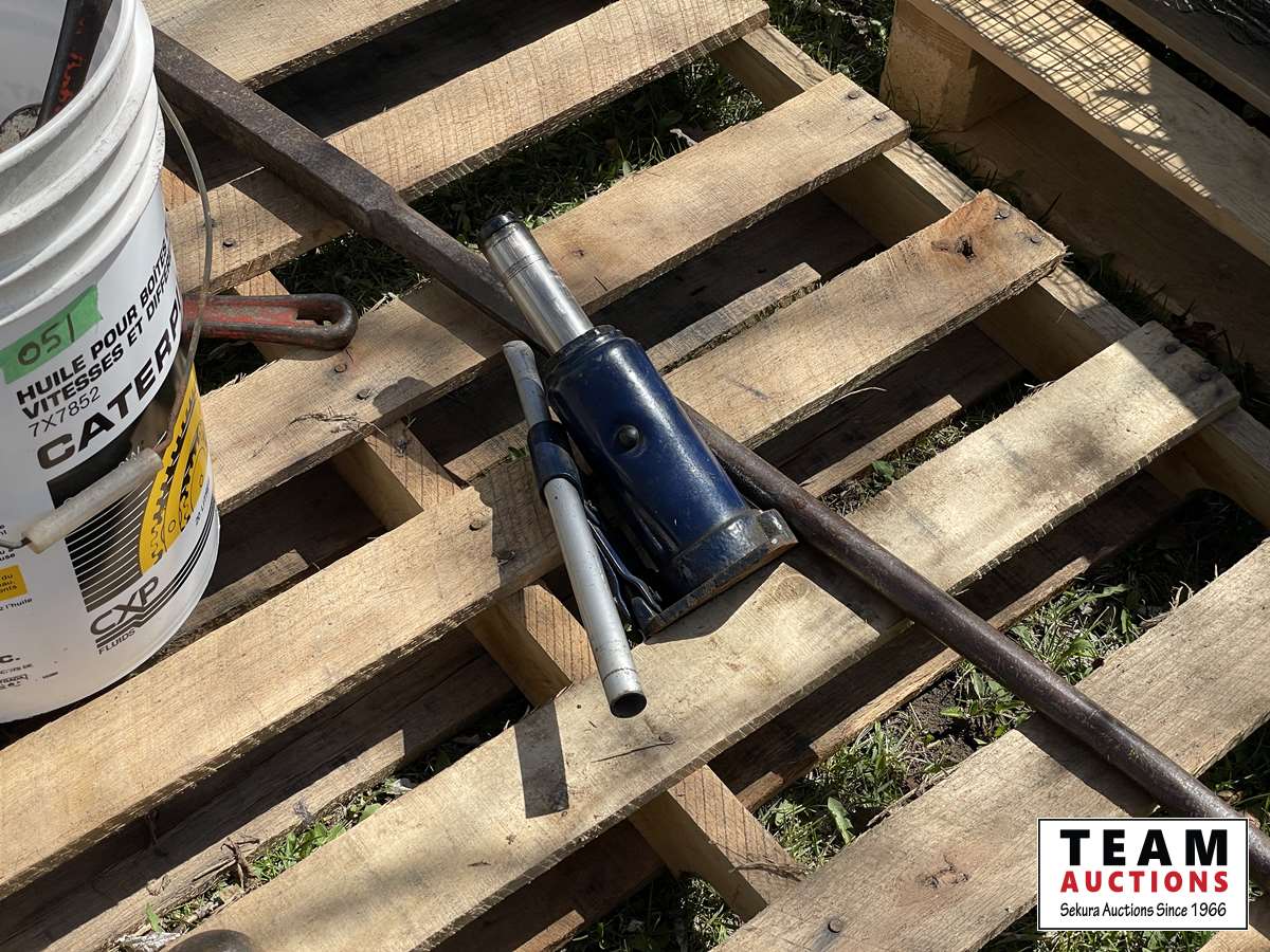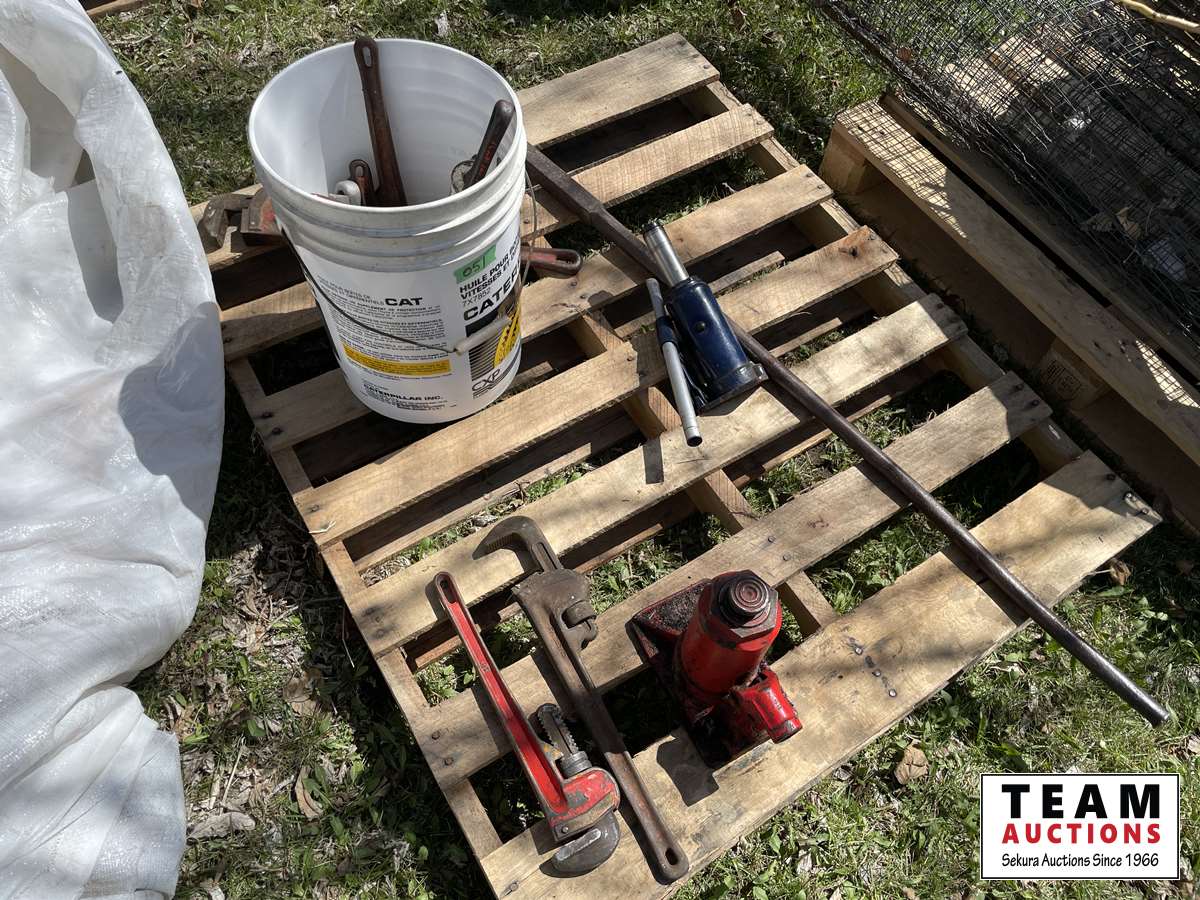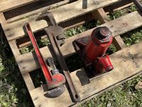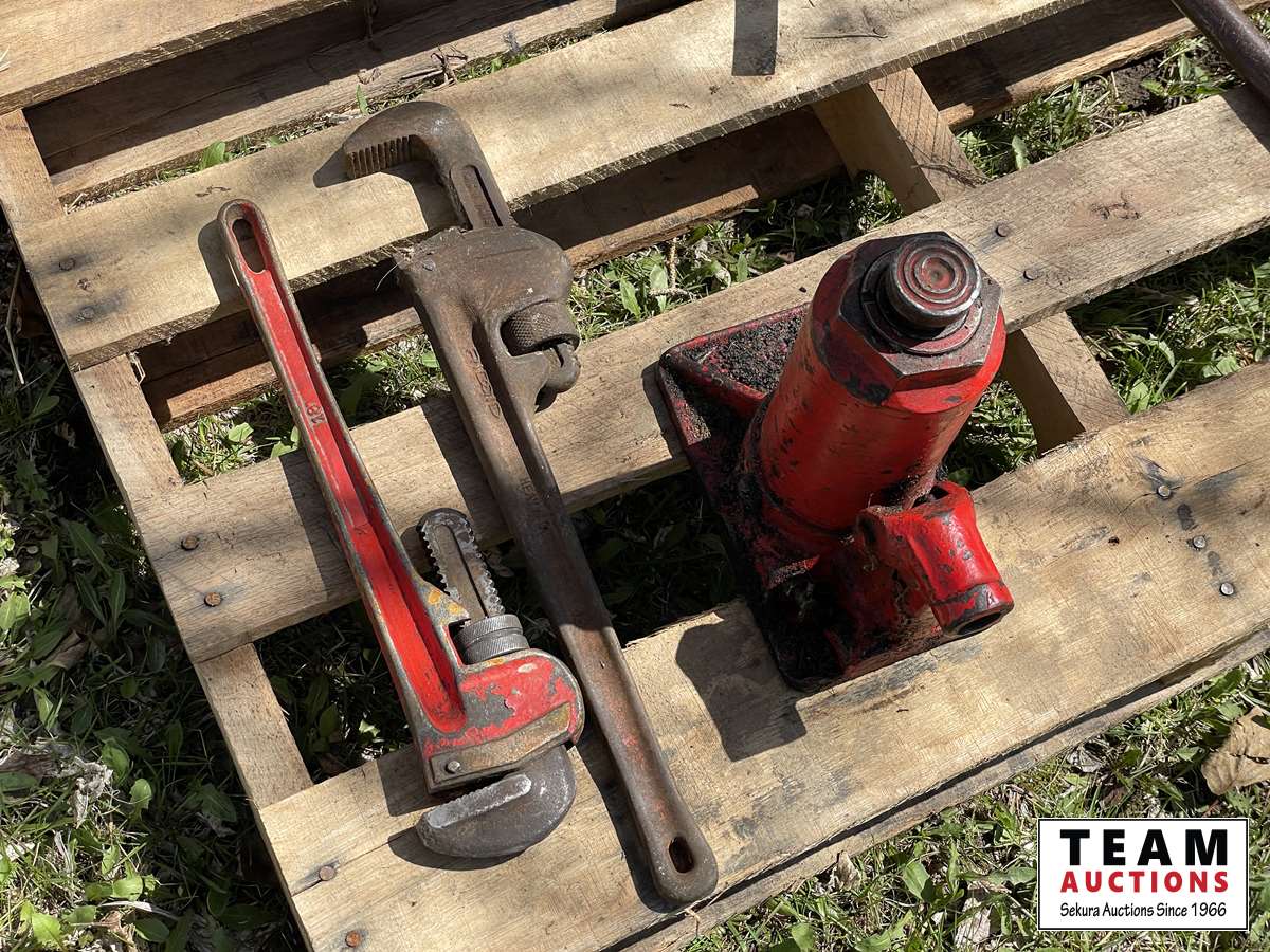 Pipe wrenches, (2) hydraulic jacks, large pry bar, various hand tools