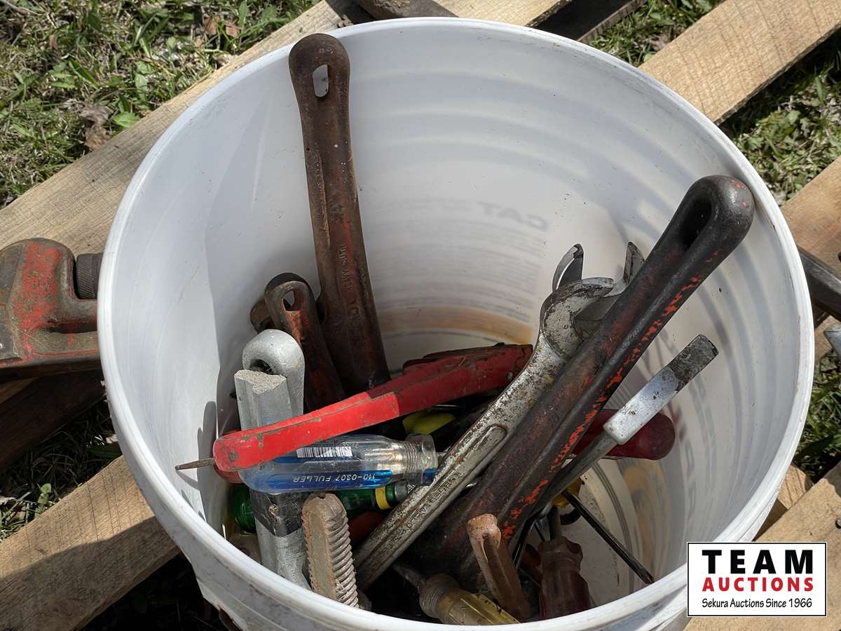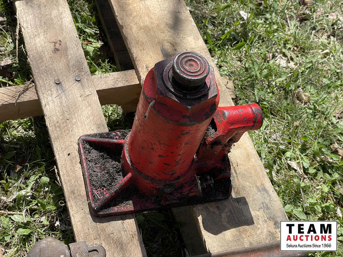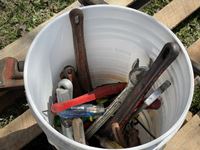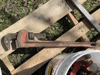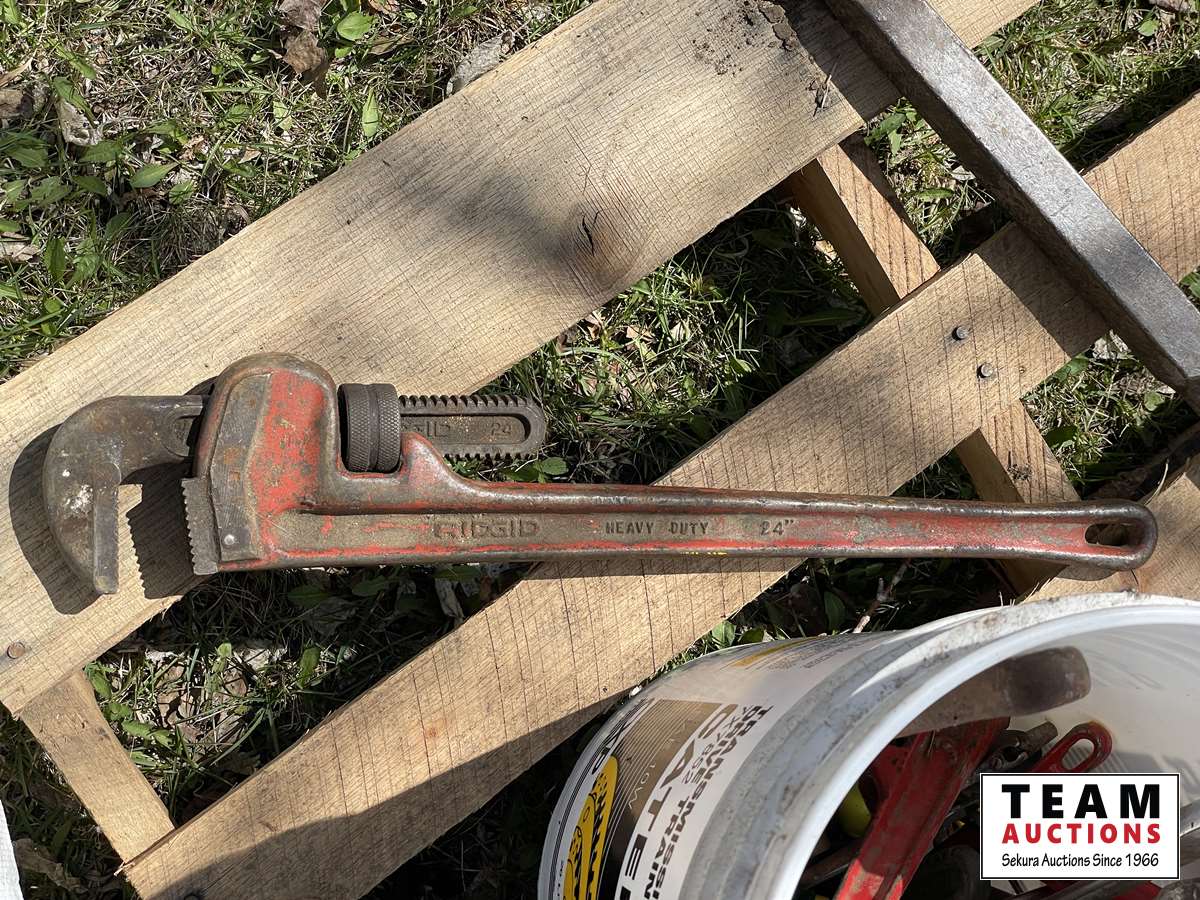Pipe wrenches, (2) hydraulic jacks, large pry bar, various hand tools
