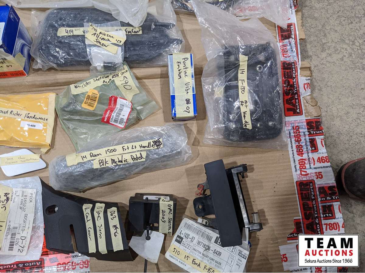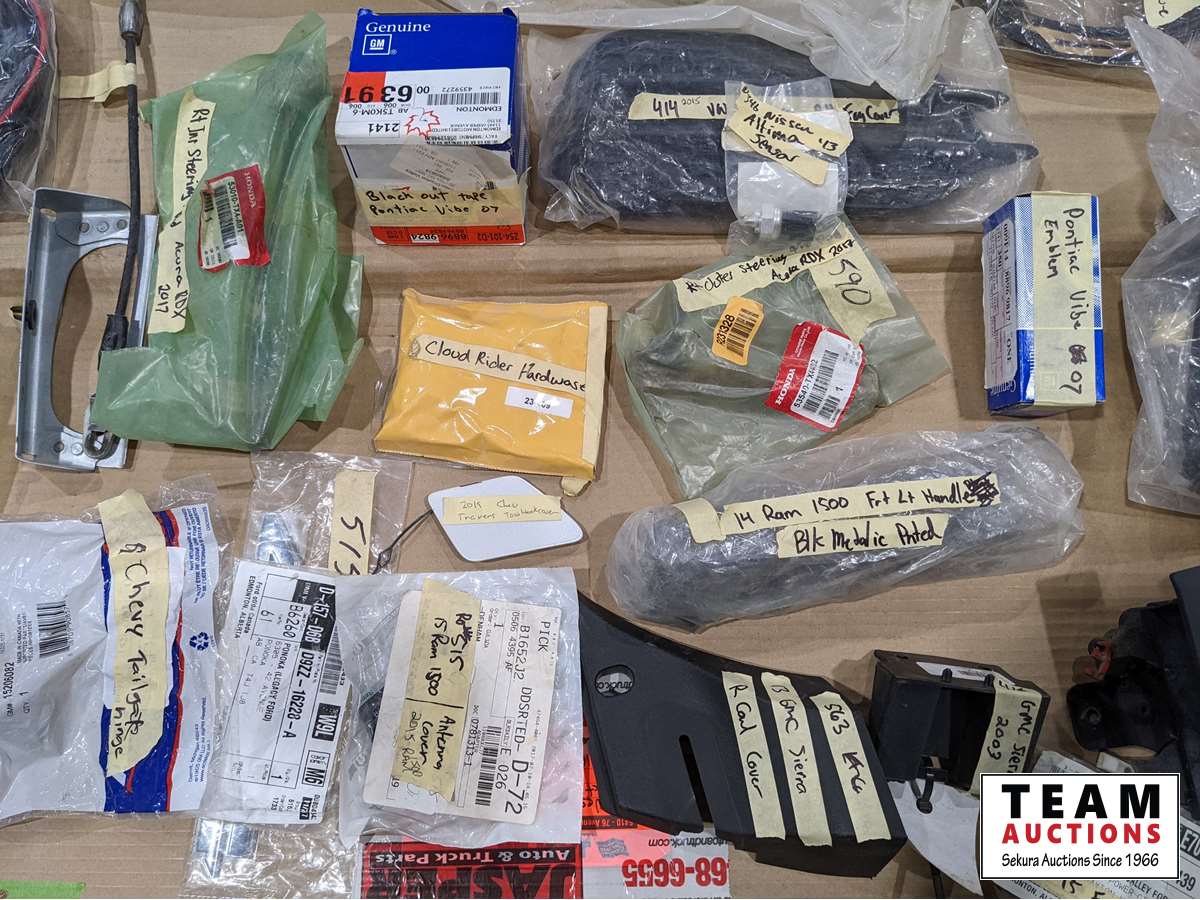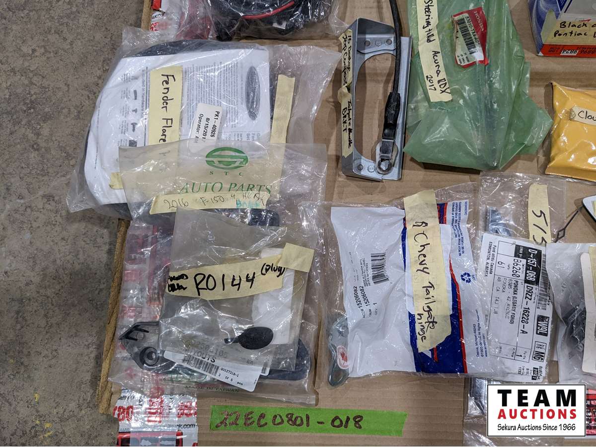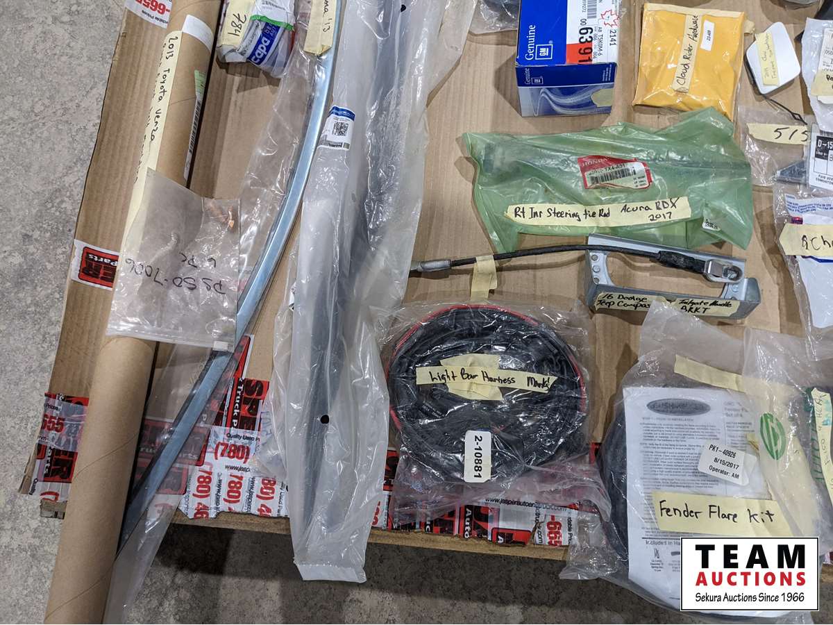 2012 Chev hinges, 2015 Ford box nuts, 2013 GMC cowl cover, 2015 Ram antenna cover, Chev tailgate hinges, 2016 Ford F150 head light bracket, fender flare kit, light bar harness, 2013 Venza right front moulding, 2014-19 front bumper brackets, 2017 Acura RDX right inner and right outer tie rod ends, plus much more